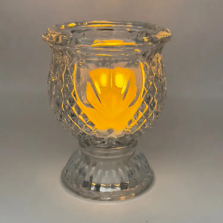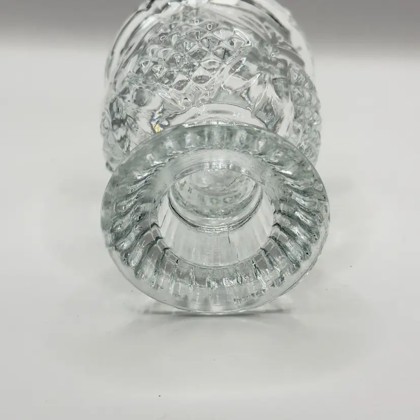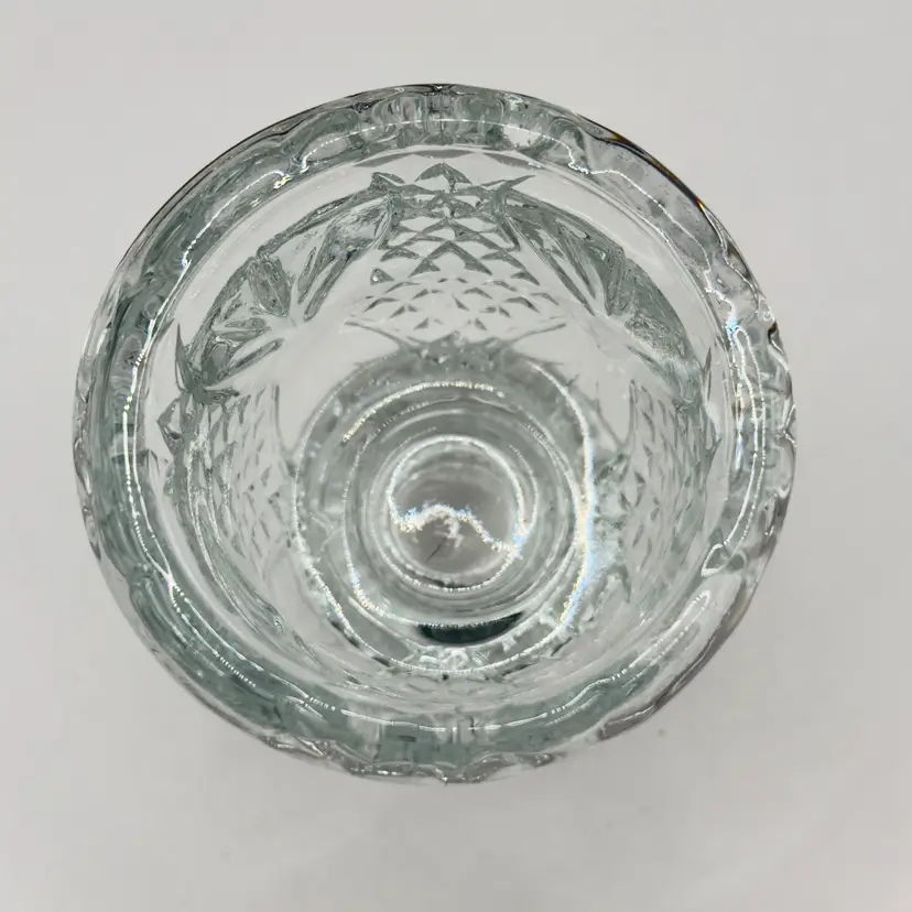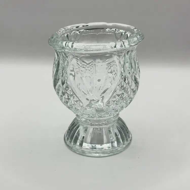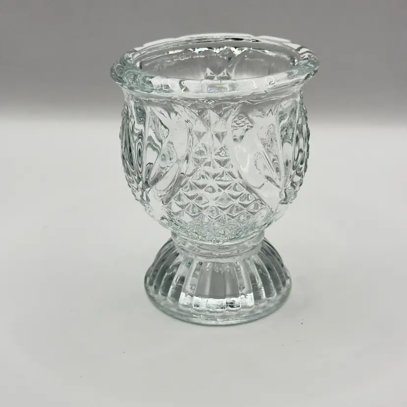 Add a touch of elegance to your home with this vintage clear glass votive holder. Its intricate design and classic style make it a perfect centerpiece for any room. Ideal for creating a warm, inviting atmosphere. Excellent condition with no chips or cracks. Measures 4x3 inches. Weighs 1lb.