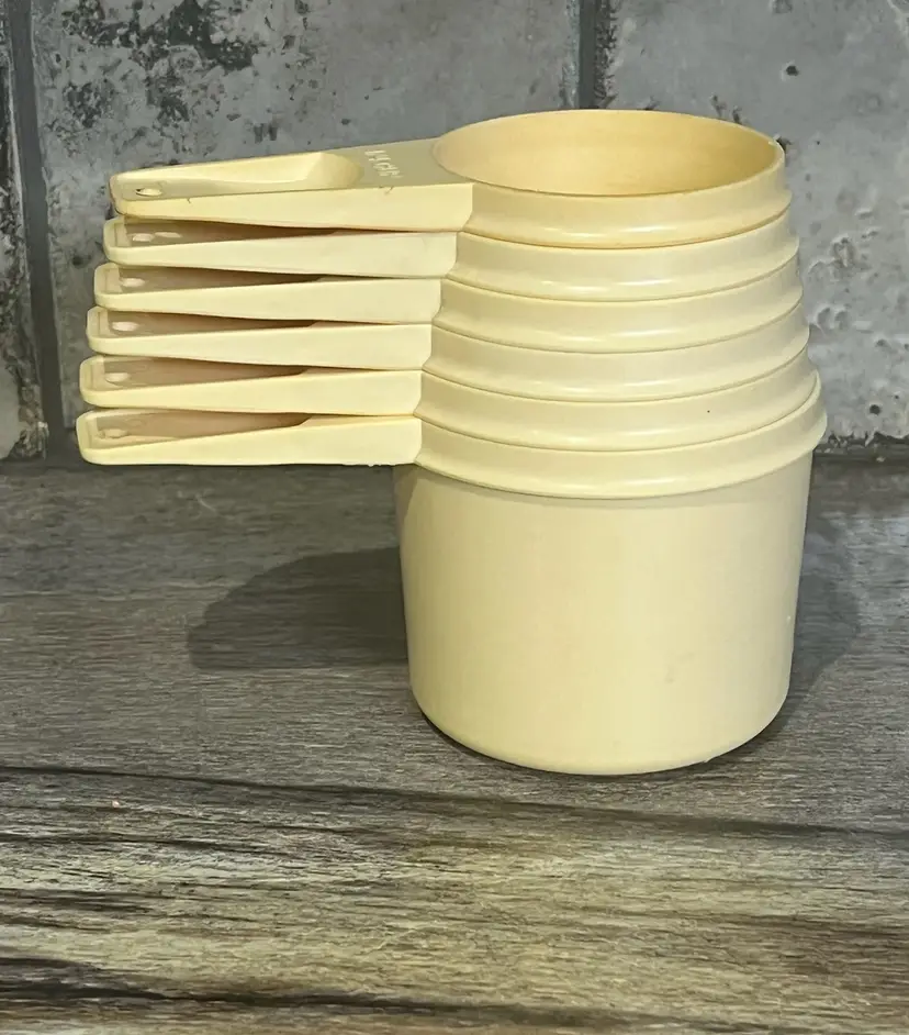 A set of Tuperware stacked measuring cups. A full set. Picture of bottoms is showing three but it is a set of 6. Some wear and the 1/4 cup is darker than the others.