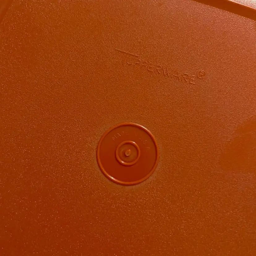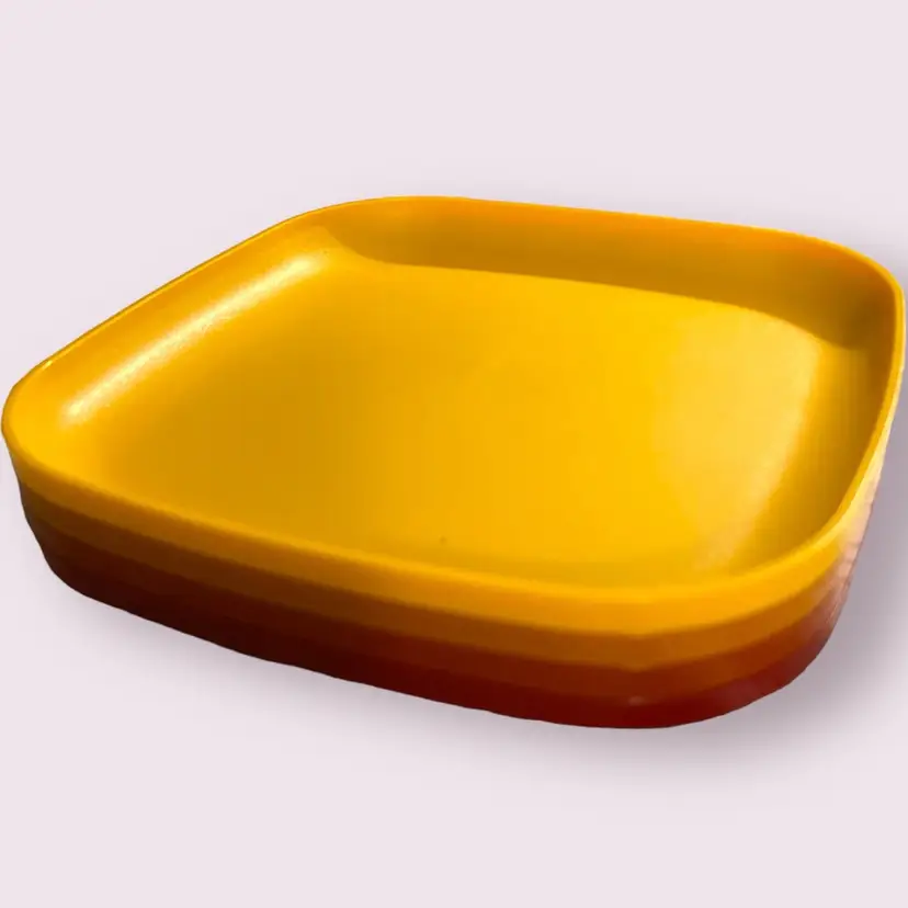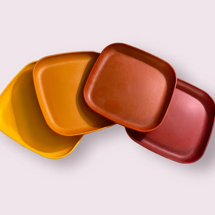 Set of 4 vintage 1980s Tupperware luncheon plates, 8” in diameter. Harvest color set in yellow, orange, and red. Excellent condition with no noted flaws.