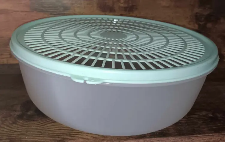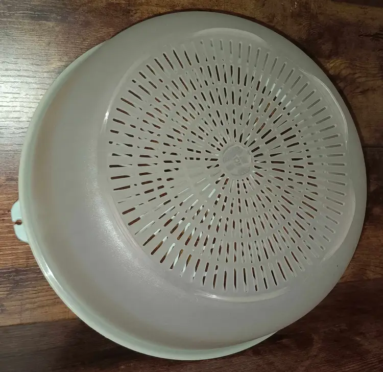 Vintage Tupperware colander with lid. In good condition with no damages. It measures approx. 3.5 inches tall and approx. 10.25 inches across.