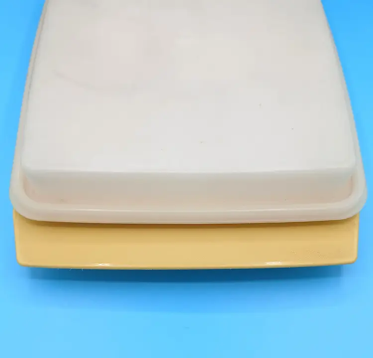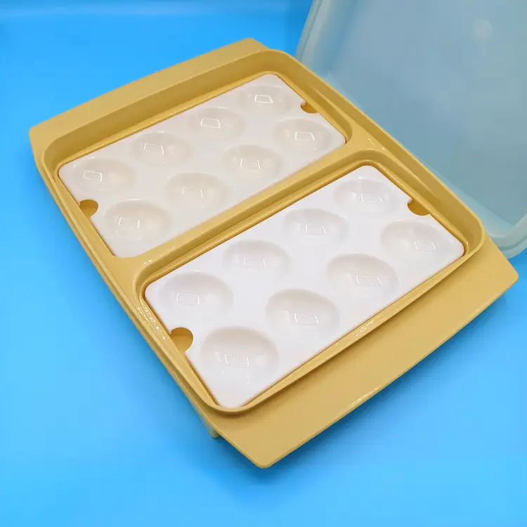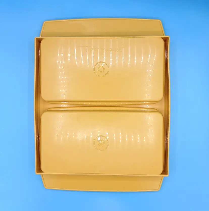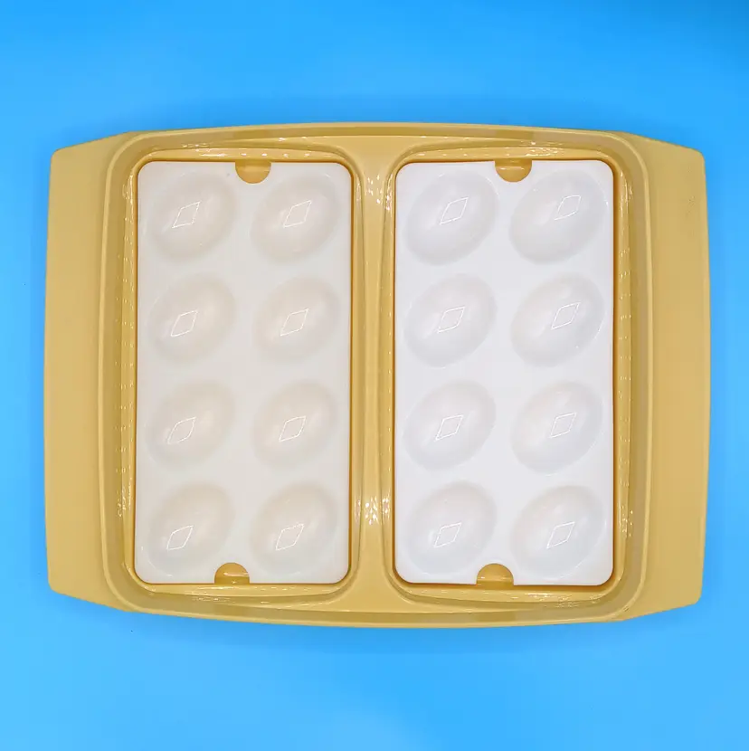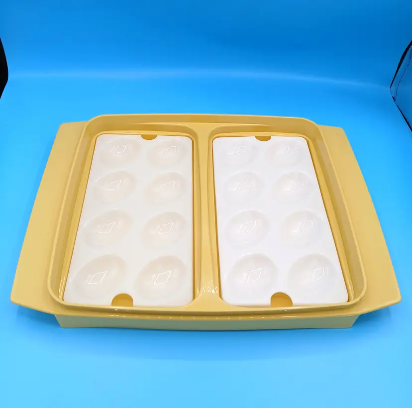 The trays that hold the eggs in this vintage Tupperware egg carrier are removable, creating a divided container suitable for lots of other foods. No damage. May show minimal signs of wear.