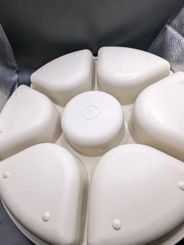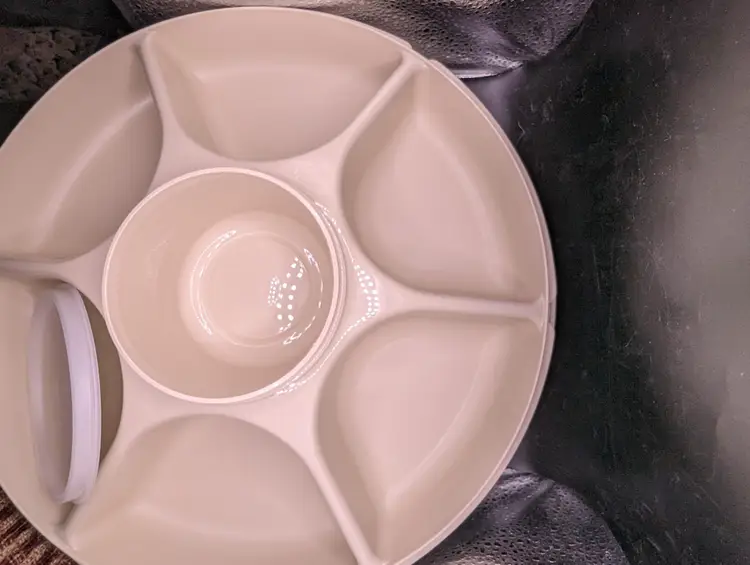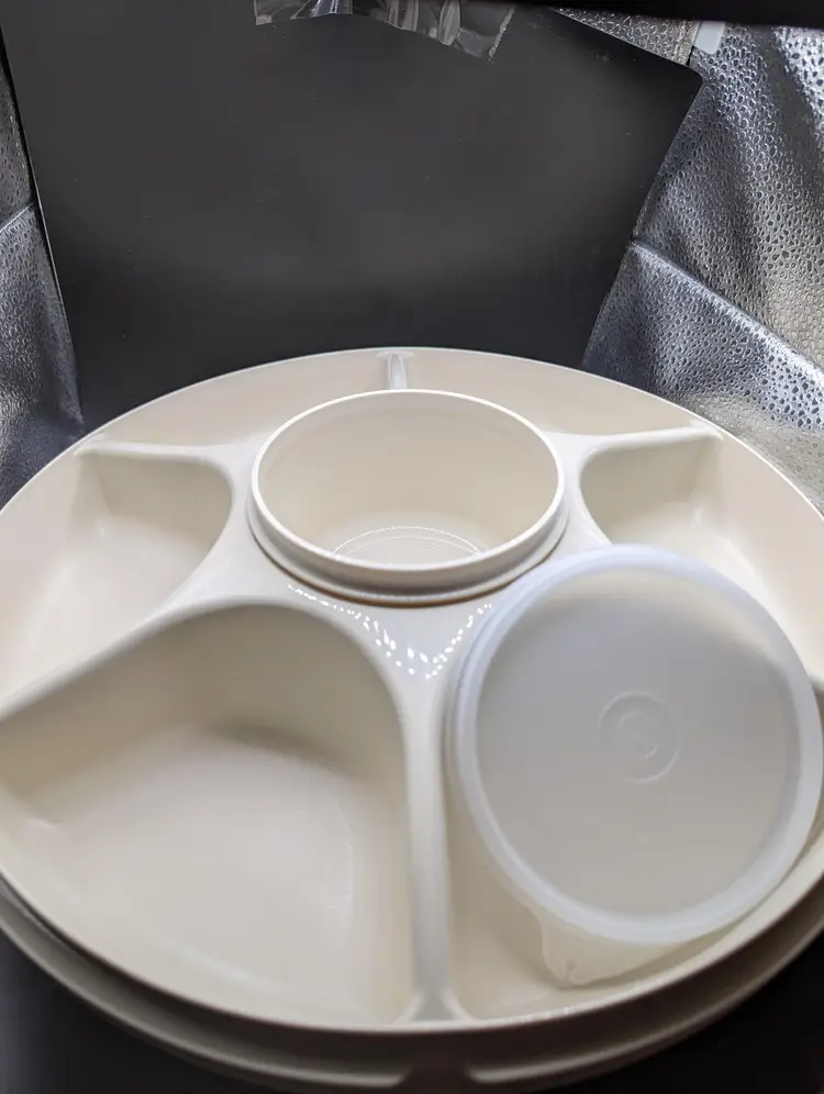 Serving Center Set 4 Piece Set By Tupperware Large Tray with Domed Cover and Dip Bowl with Seal. Popular almond color will coordinate with any table décor. Dip bowl seal in sheer color. Large tray includes six 2 cup compartments and a 14 oz. removable center bowl with liquid tight seal. Center compartment can also be used separately. Please see all pictures for condition and measurements.