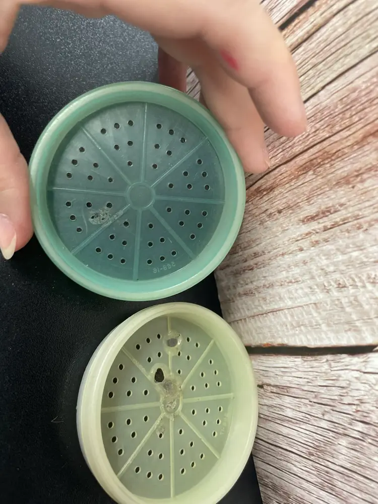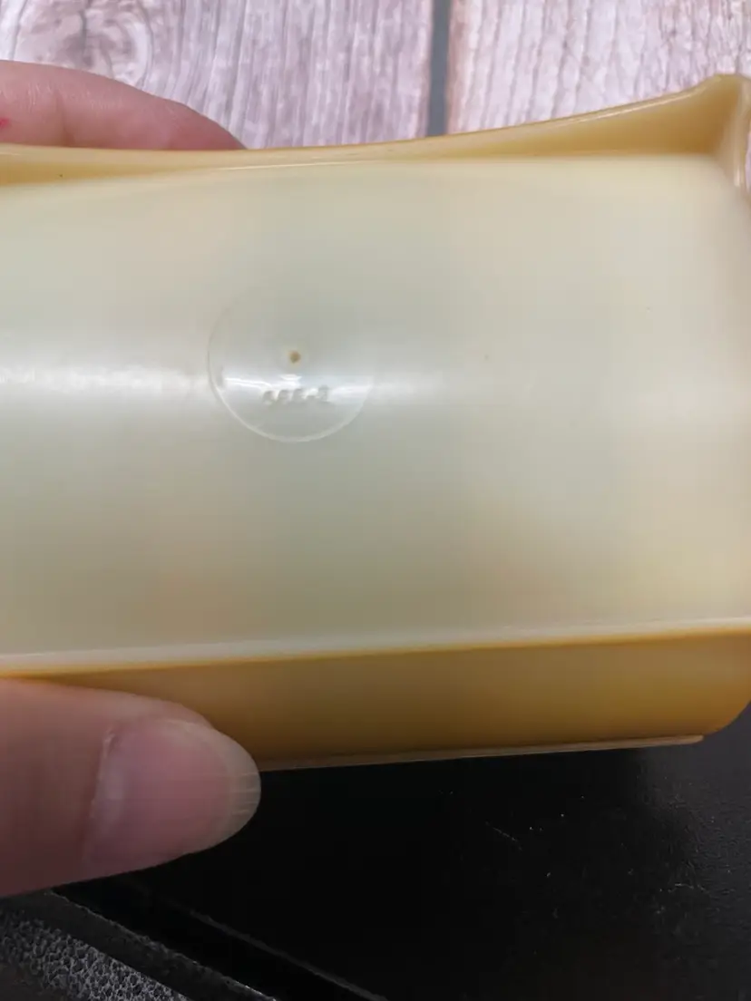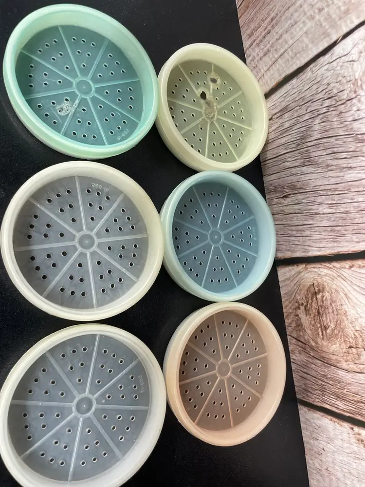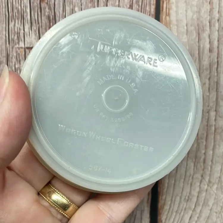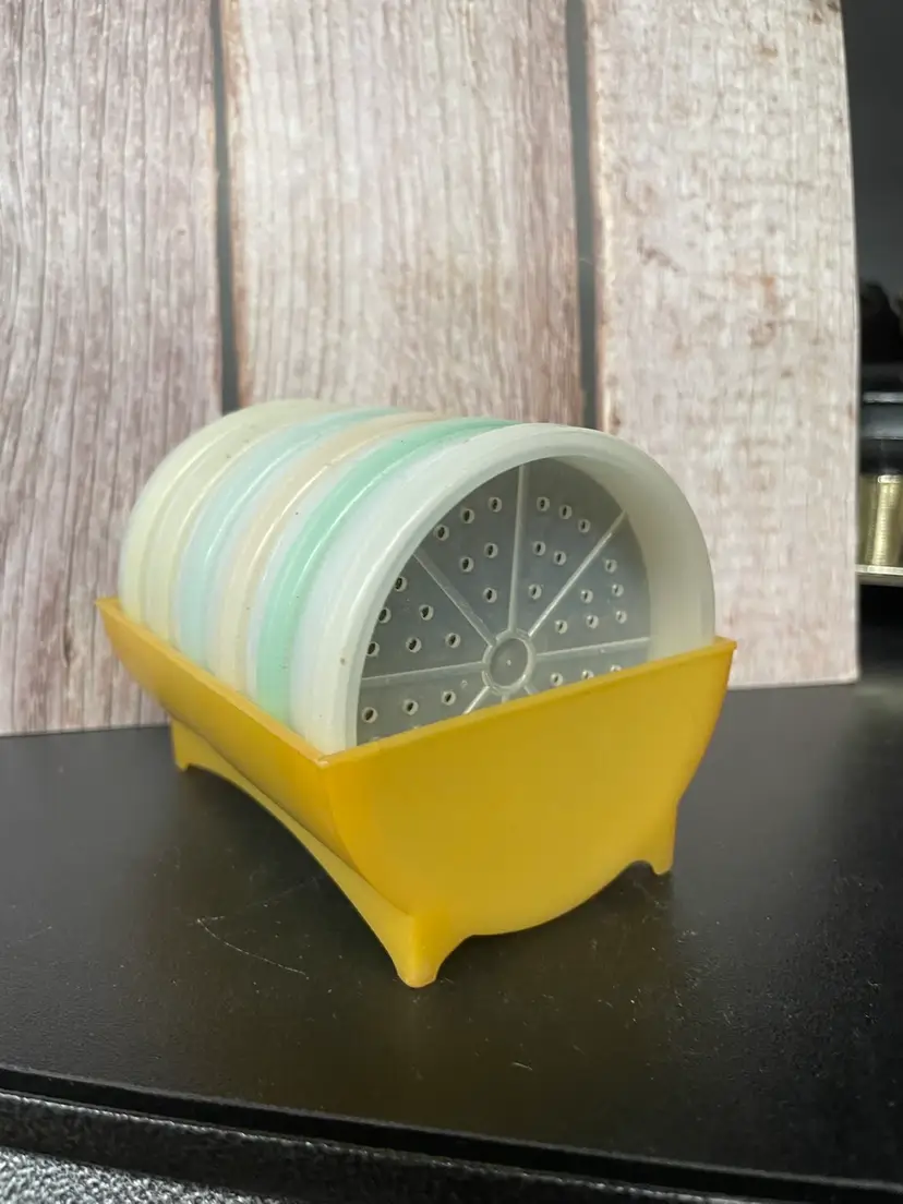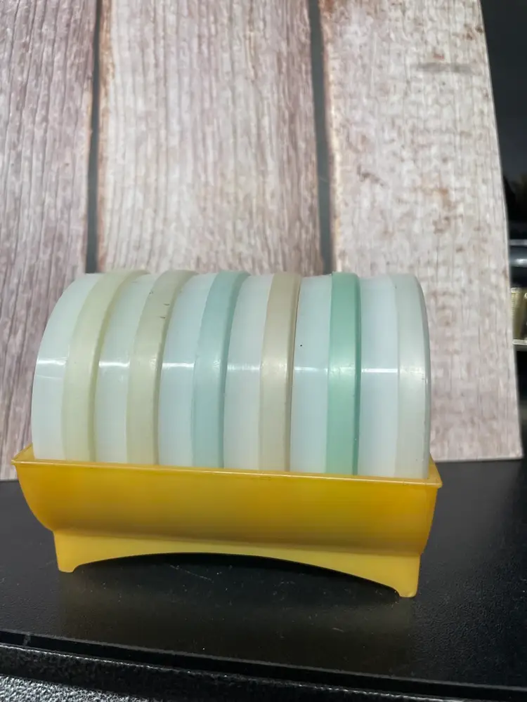Vintage Tupperware coaster set in container. Holder is number 566–2. Coaster numbers are 567–13, 567-14 and 567– 15