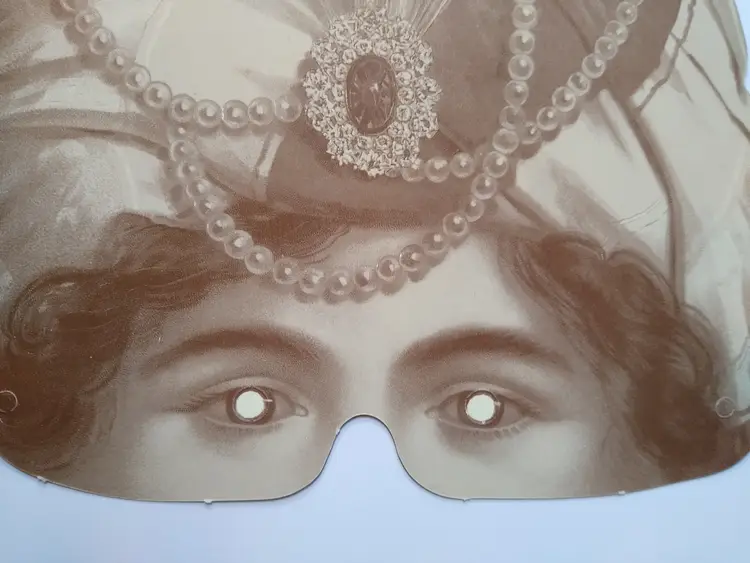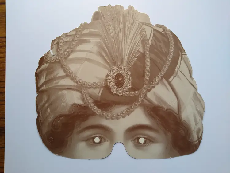 This is an unbranded vintage-style eye mask, crafted from sturdy cardboard. The mask features a detailed, colorful illustration on the front depicting a person wearing an ornate turban adorned with a large, jeweled brooch and strands of pearls. The design evokes an exotic or sultan/maharajah theme, perfect for costume events or theatrical productions. The reverse side of the mask features a sepia-toned, monochrome version of the same design.