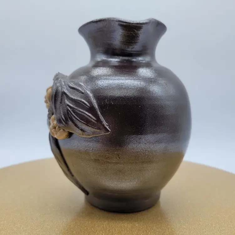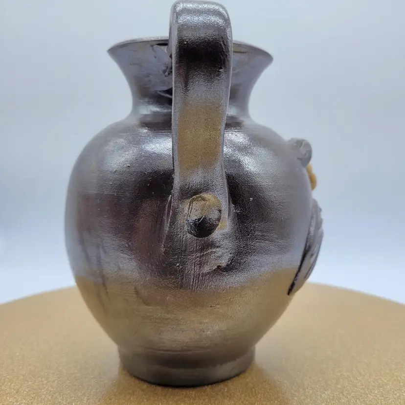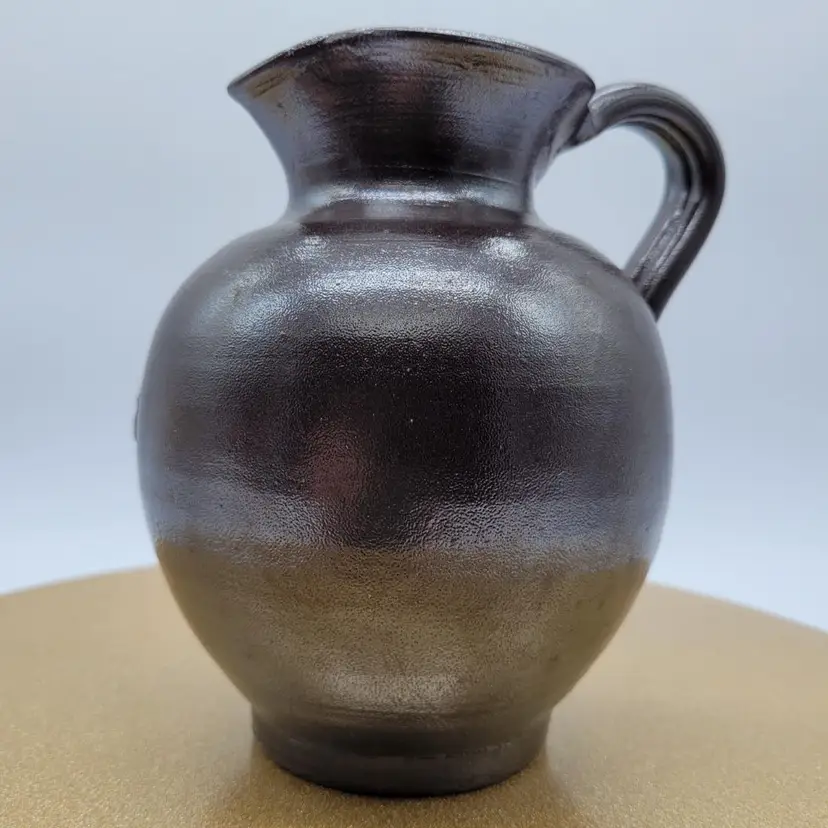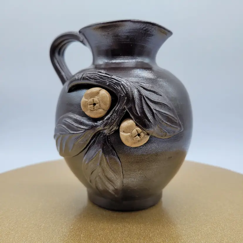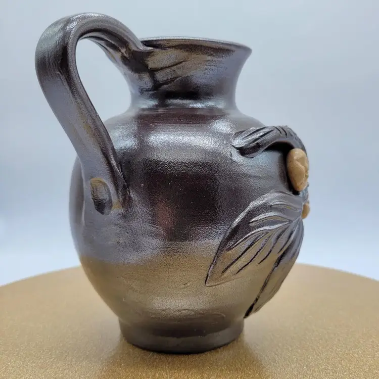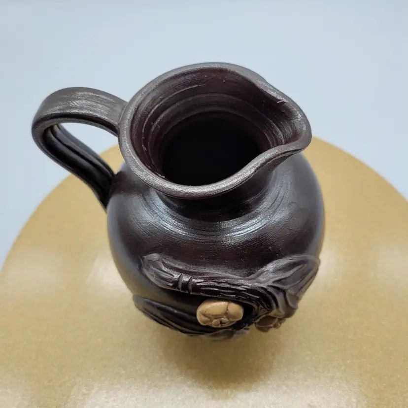 A lovely vintage hand made French pitcher, in excellent condition.I believe it is made by the Turgis factory Calvados Normandy. The apple and leaf design in relief is eye-catching. Marked with 09 on bottom. Beautiful dark brown. 5.75" x 5.5". Pottery helps liquid stay cool. Would make an ideal jug for the breakfast table to hold milk or syrup. No chips, cracks or crazing. Please see photos as they are part of the description. Item will be well wrapped in bubblewrap before shipping.