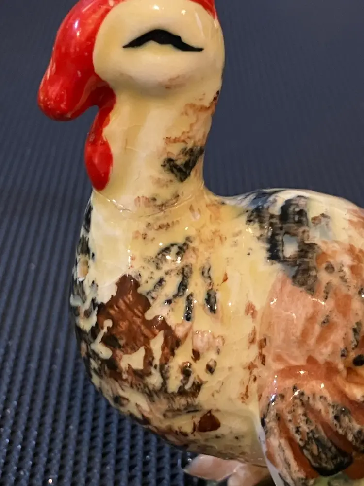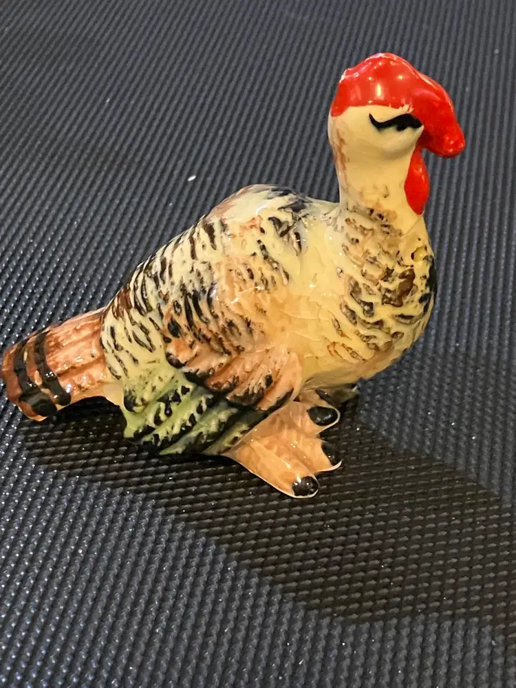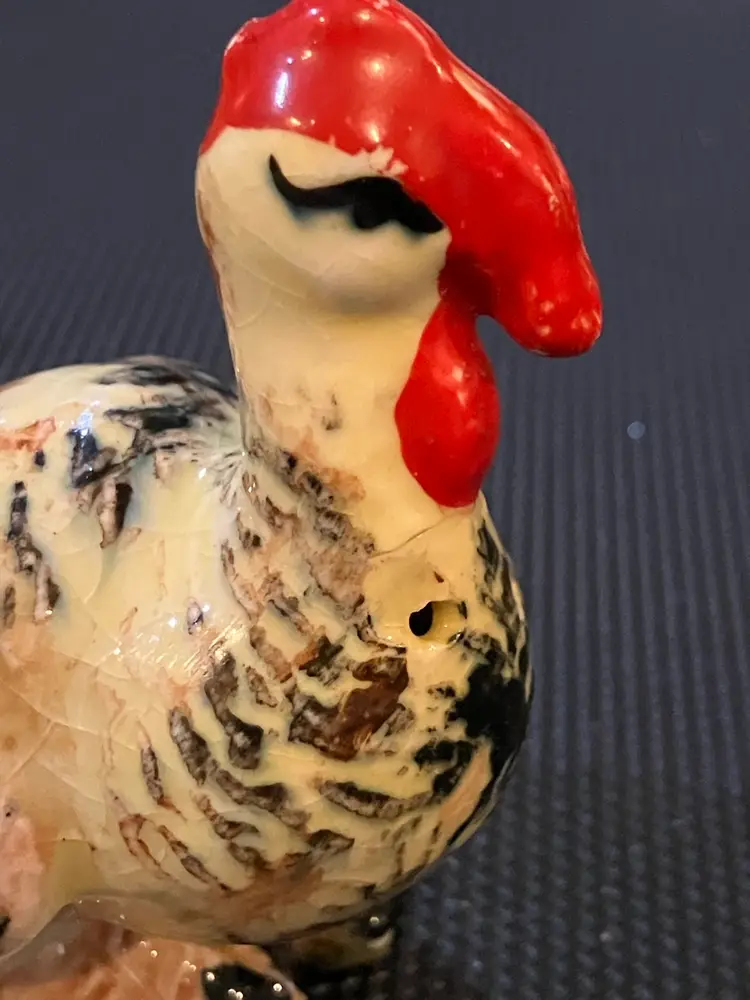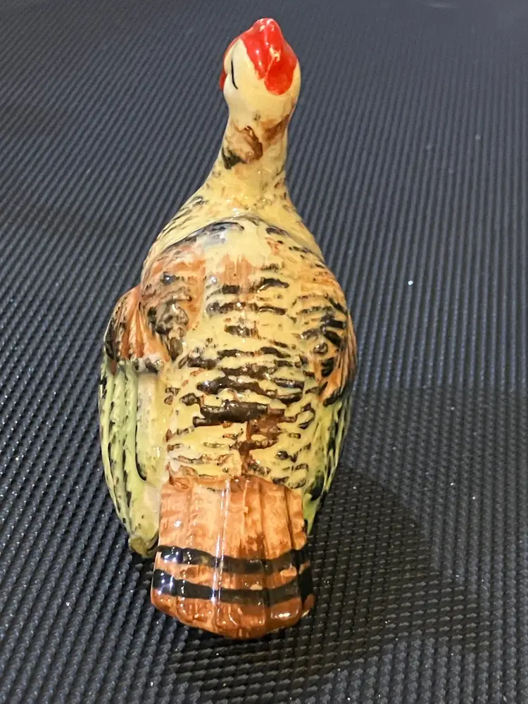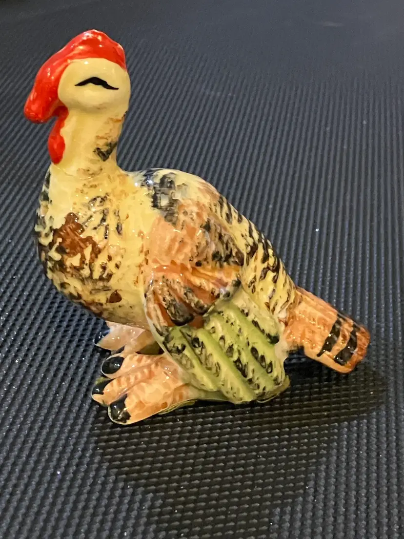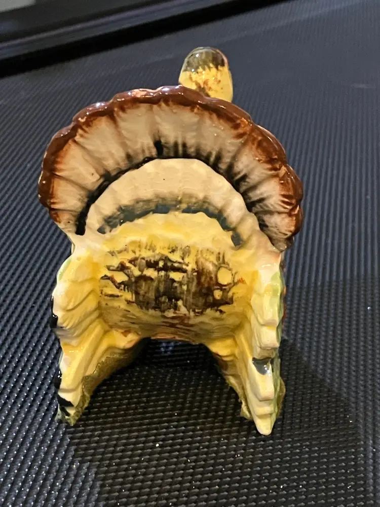 This vintage set of turkey salt and pepper shakers reminds me of my childhood when my grandma would decorate her whole dining room for Thanksgiving. This set is made in Japan, and there are no chips. The female turkey has a repair on her neck that is not super noticeable due to the paint coloring around it (see pictures). They also have the original corks and felt glued to the feet so as not to scratch the table.
