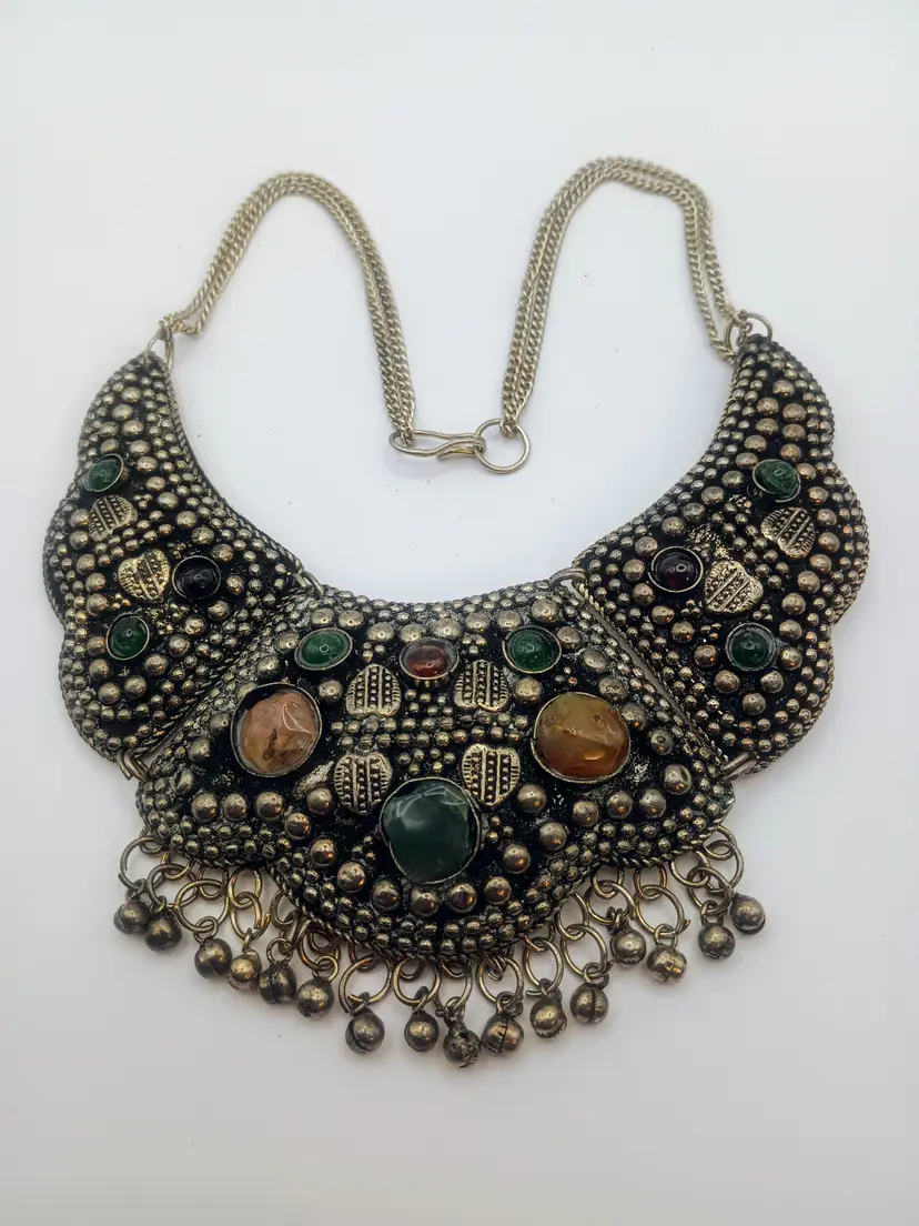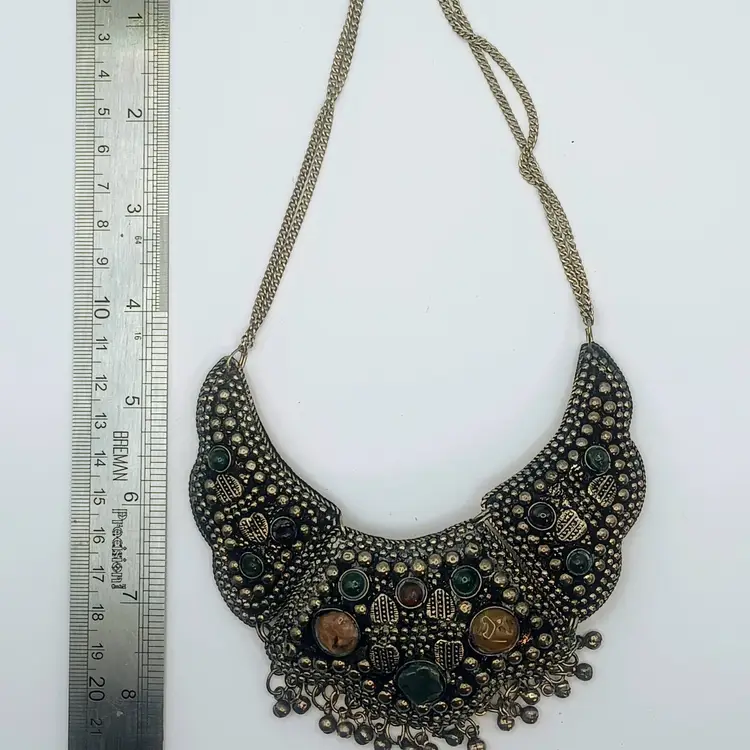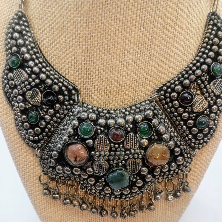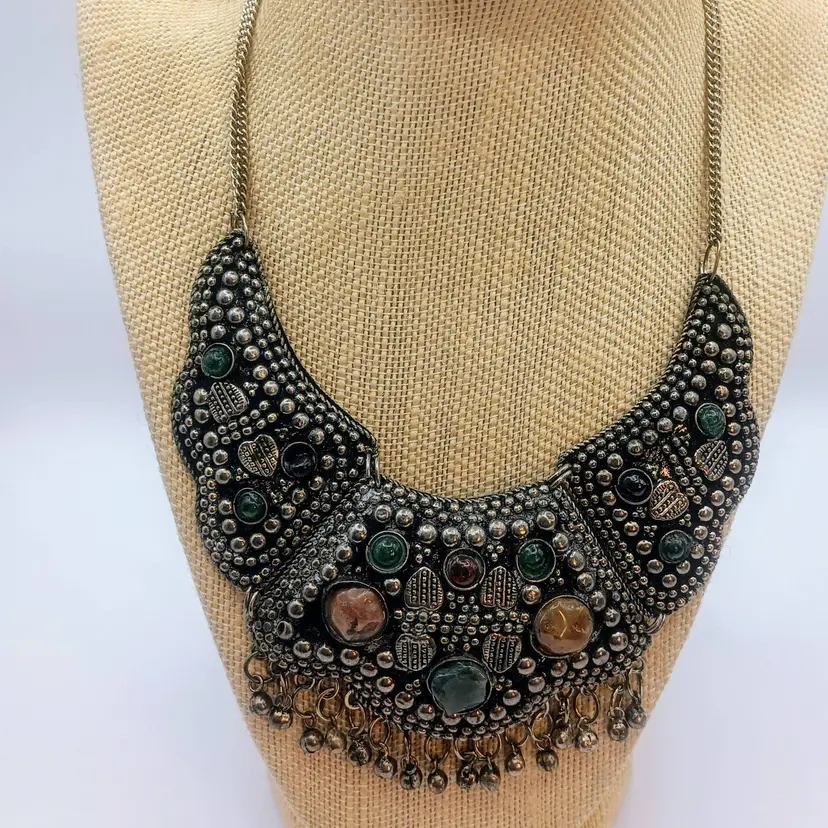 This beautiful statement necklace is Turkish with multiple semi-precious stones. Including Onyx, Jasper, Agate, Garnet, and more. This piece is silver plate. It is approximately 16 inches long. I have more of these!