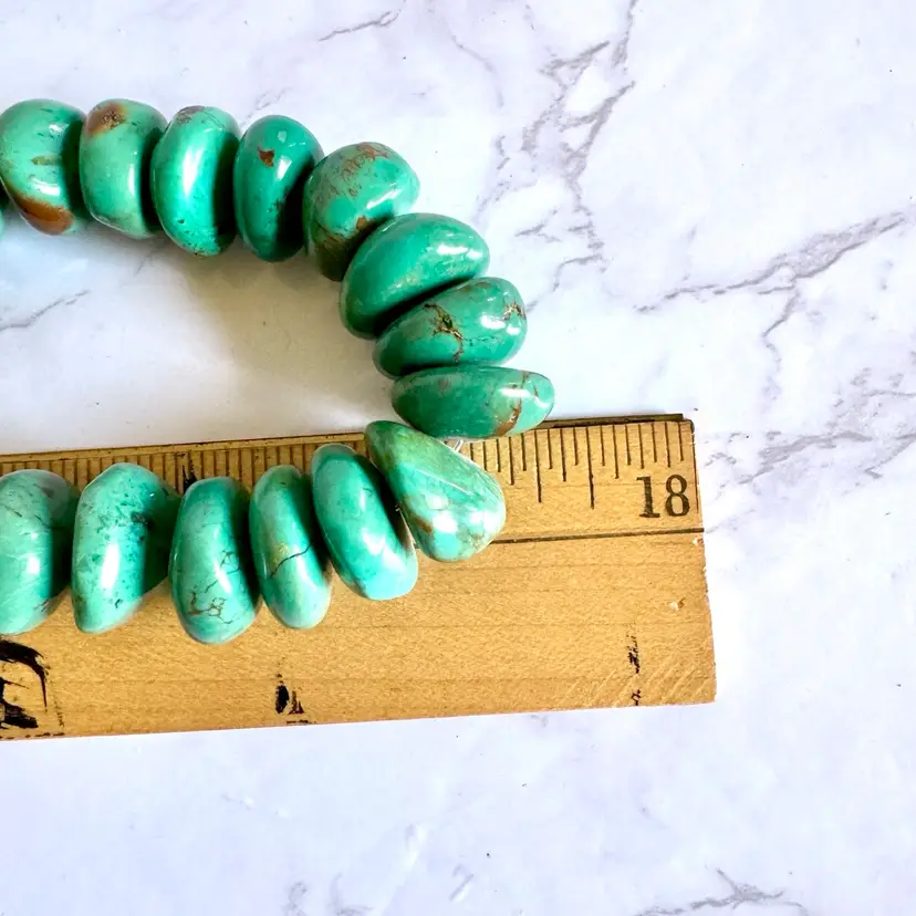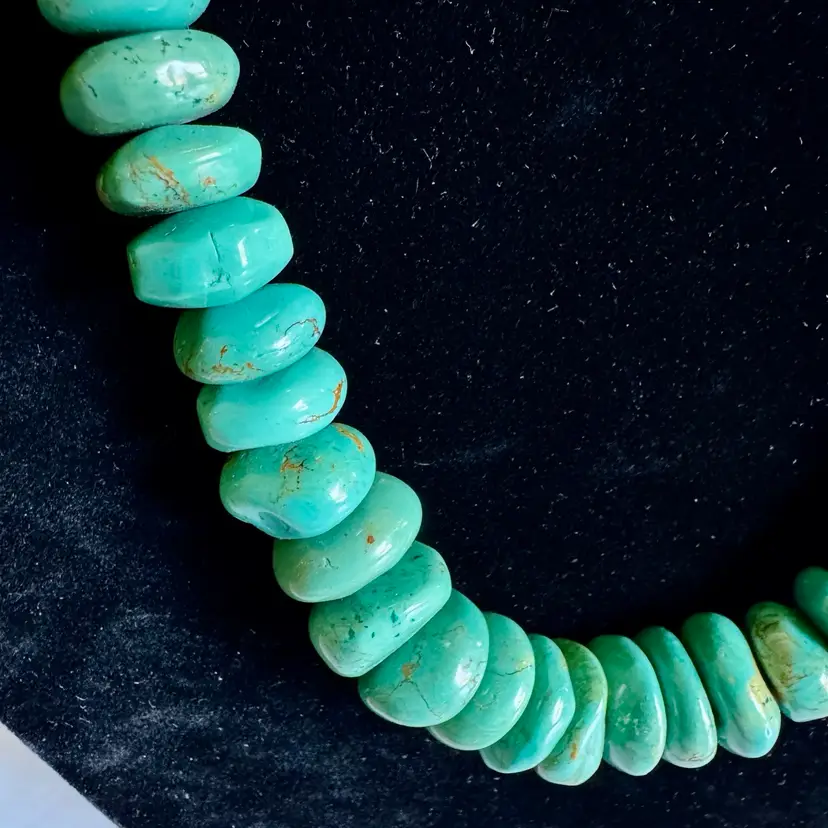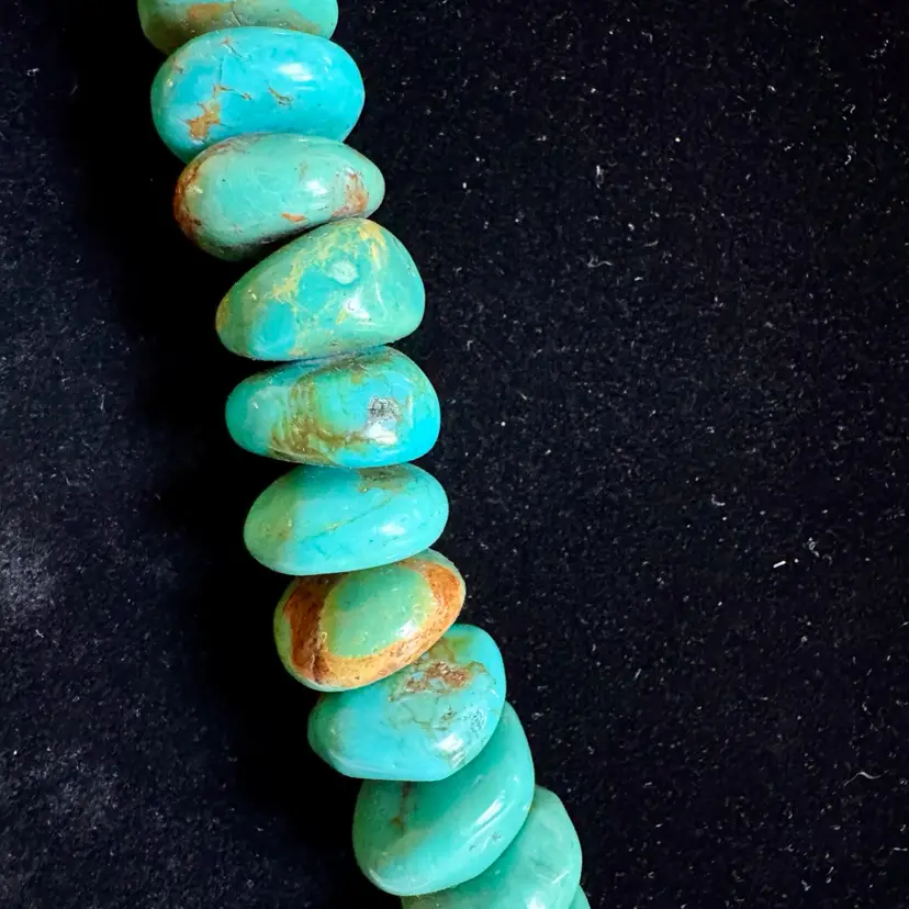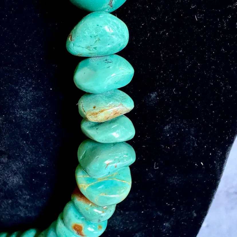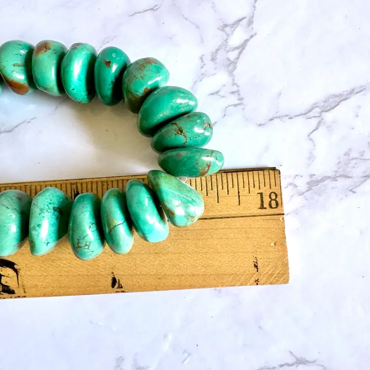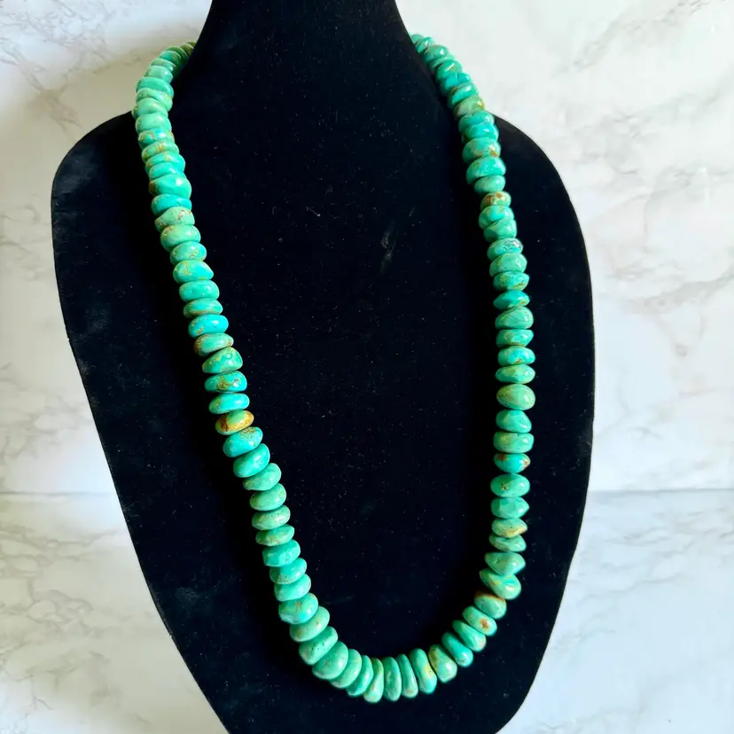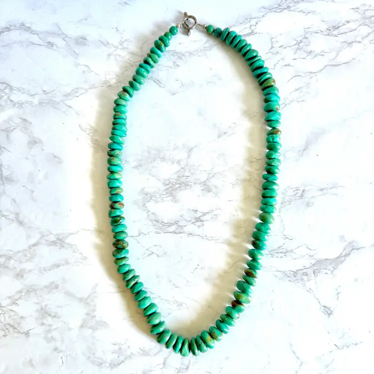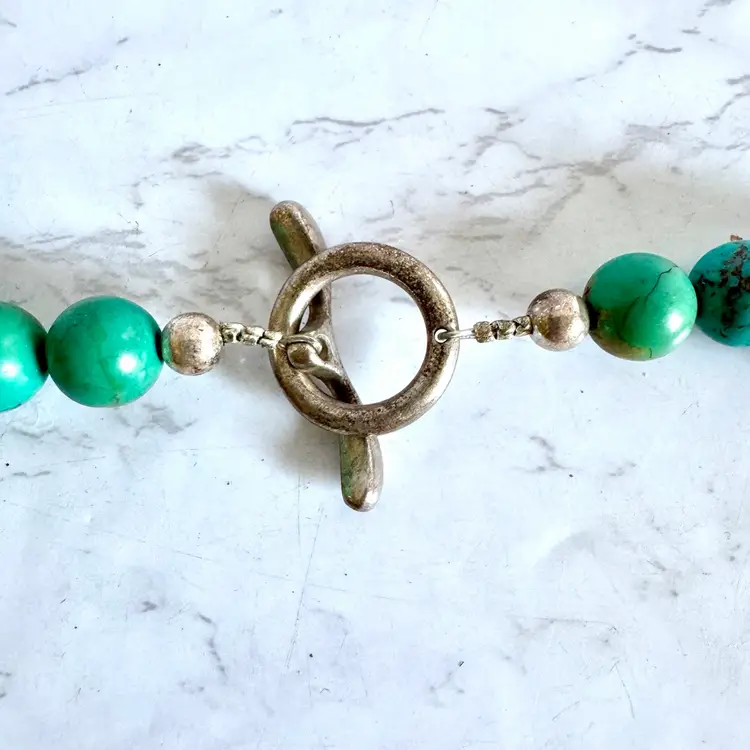 Good condition with signs of wear due to age. Stones can have natural cracks and flaws. Approximately 35” long. Weighs 326g. This striking vintage necklace showcases a long strand of natural turquoise beads, radiating earthy blue-green tones that evoke the desert landscapes of the American Southwest. The beads vary slightly in size and shape, adding rustic charm, and are finished with a small, understated sterling silver toggle clasp for a secure, adjustable fit. Likely crafted in the mid-20th century, possibly inspired by Southwestern, Native American or Himalayan influences, this piece offers a bold, bohemian statement for everyday wear or special occasions, perfect for jewelry lovers seeking authentic, timeless style.