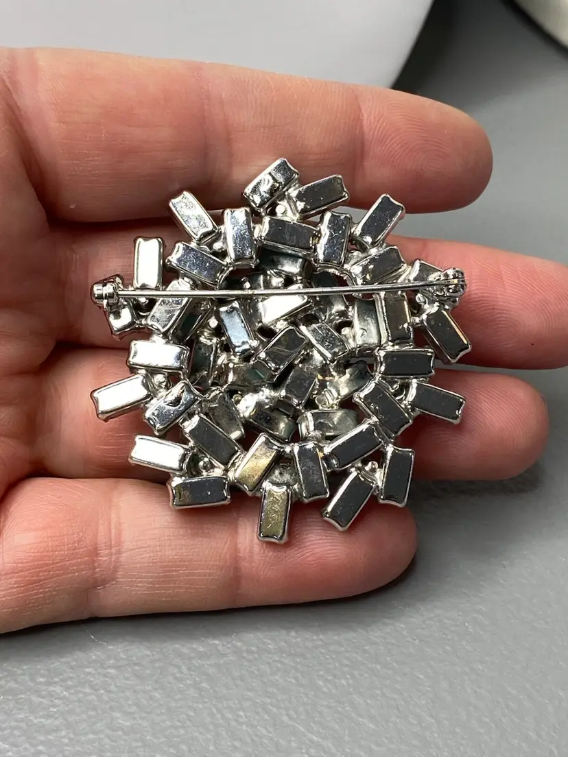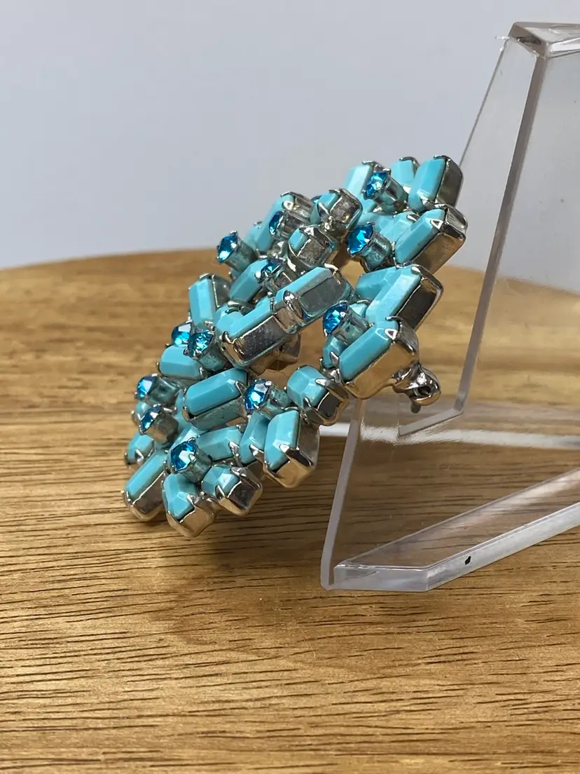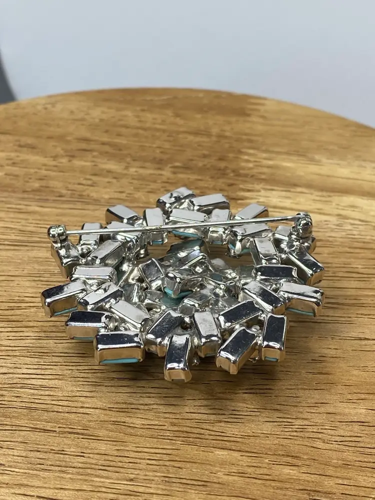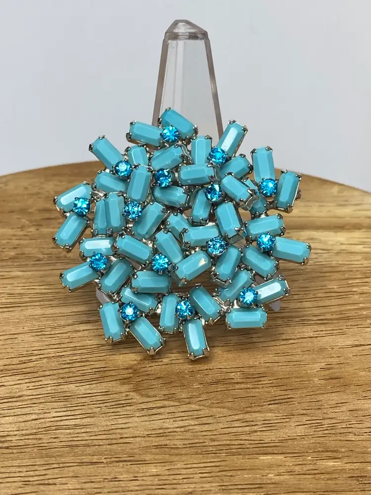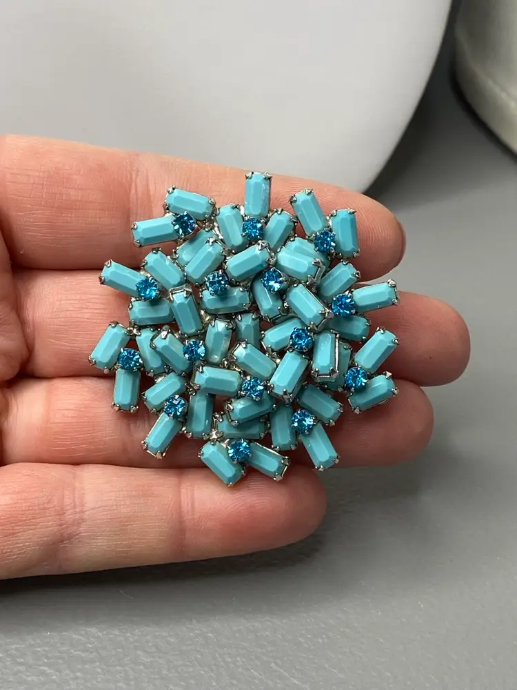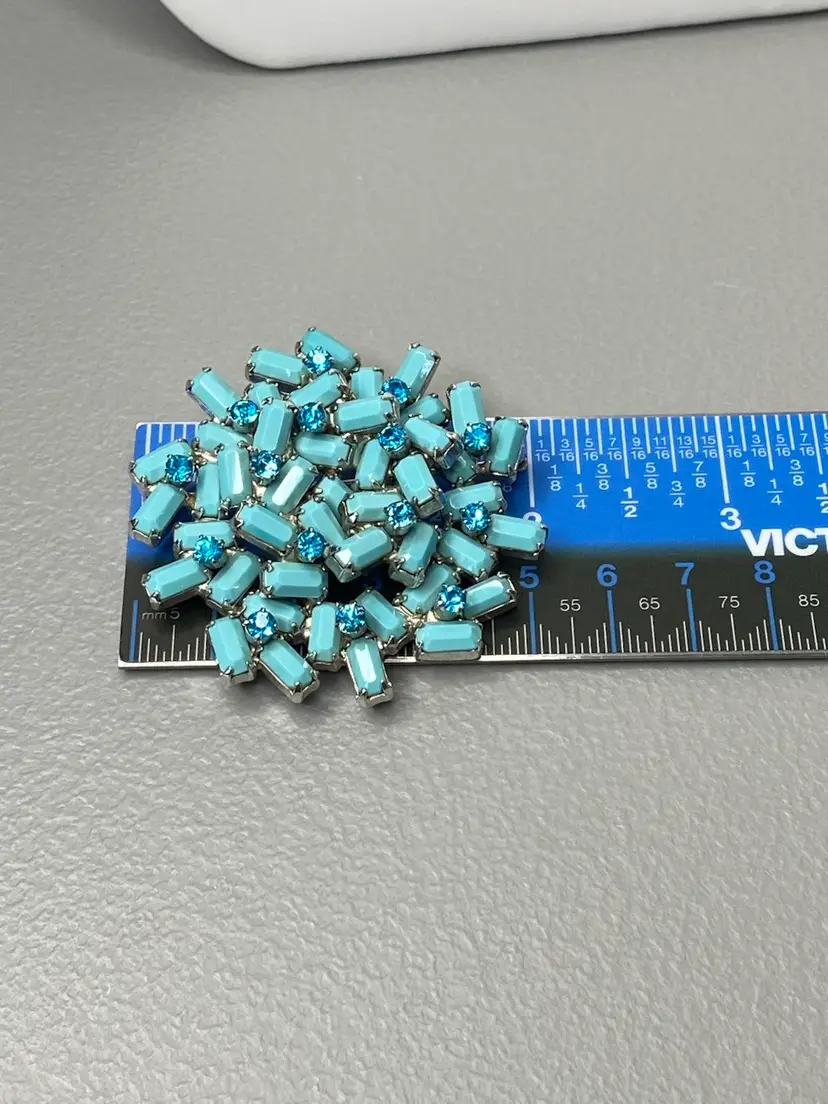 This vintage brooch features a beautiful cluster of turquoise colored baguette and teal blue round rhinestones that sparkle brilliantly in the light. The setting style is a unique design that adds an extra touch of elegance to the piece. Measuring at 2 inches in diameter , this brooch is a timeless addition to any jewelry collection.