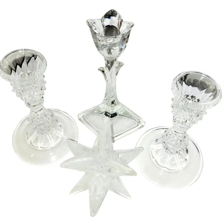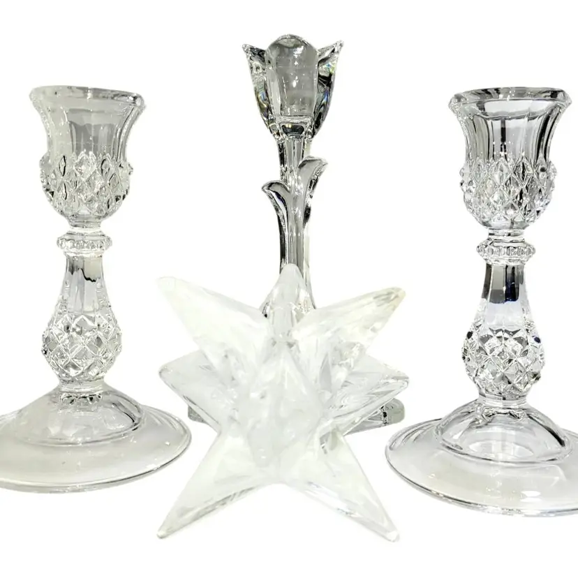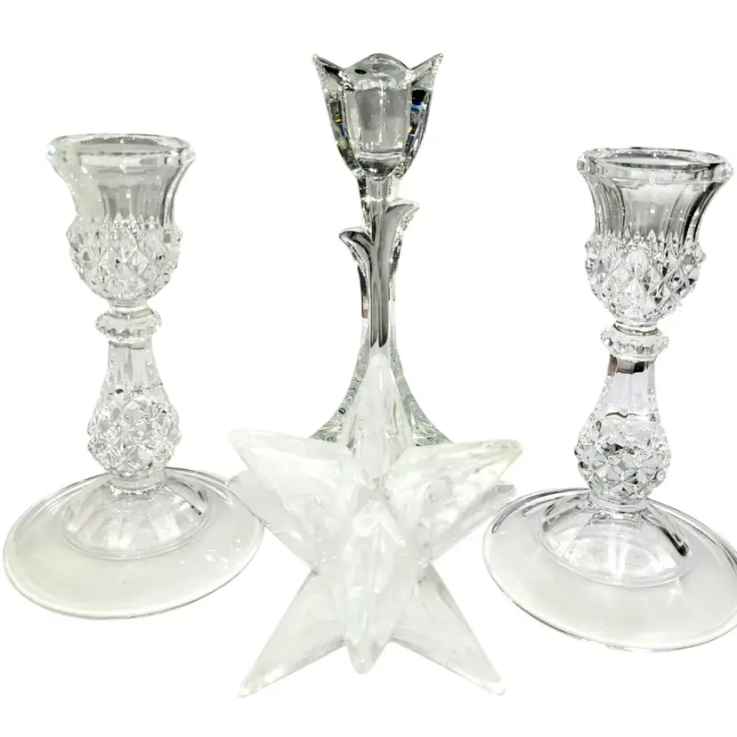 • Includes set of two Cristal D' Arques Durand Longchamp taper candlestick holders 6.5" • Tuscany Dutch tulip taper holder with square base • Rosenthal for Pier One Starburst crystal sculpture 9-point centerpiece • All lead crystal sparkles • Timeless vintage appeal