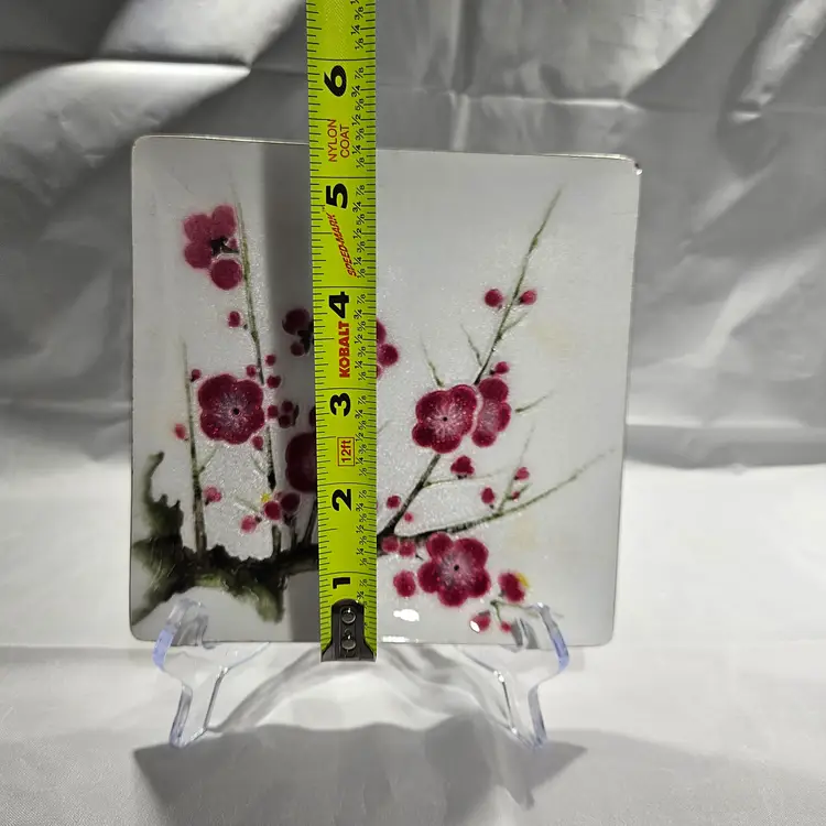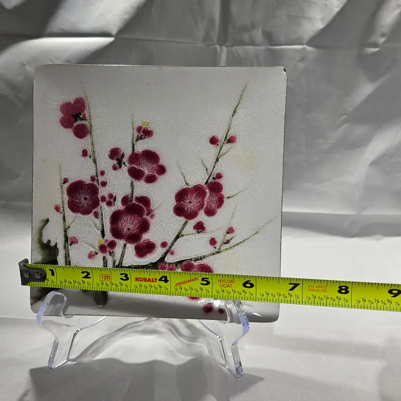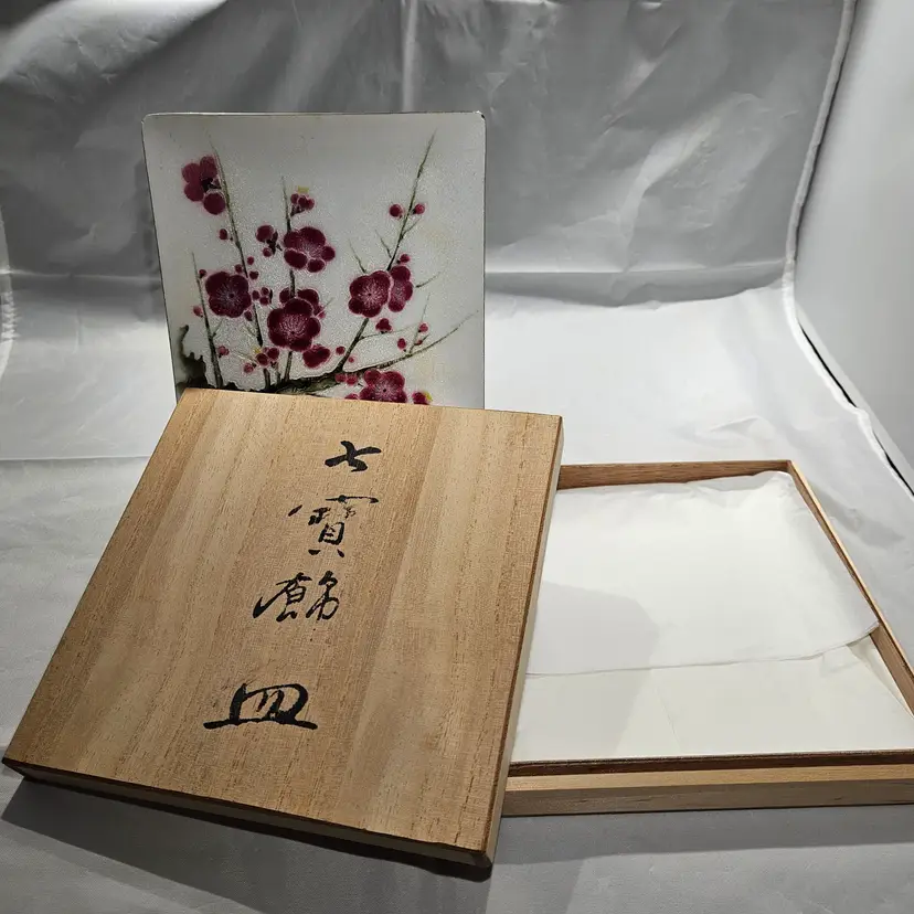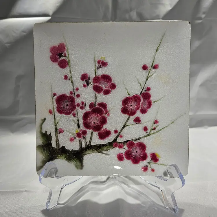 Please note the small nick in the upper corner - See Photos Comes with the original wood box Enamel on copper Japanese cloisonne enamelware Pink dogwood flowers on a branch See photos for size and additional details