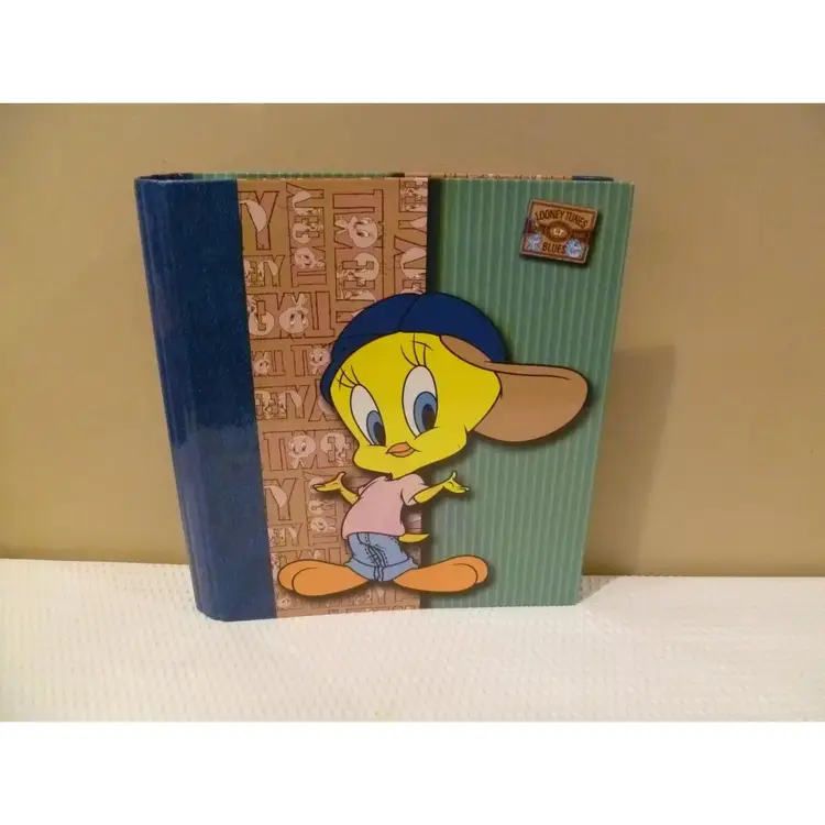 This vintage Tweety Bird binder is a must-have for any Looney Tunes fan! Featuring colorful artwork of the beloved character, this binder is made of sturdy cardboard material. It is perfect for storing and organizing your collection of animation merchandise, including one piece from the popular TV show. The binder is ideal for displaying on a shelf or desk, and would make a great addition to any collection. Get your hands on this unique piece of Looney Tunes history today! In very good condition with some ware from years of handling. 1 corner has a crease