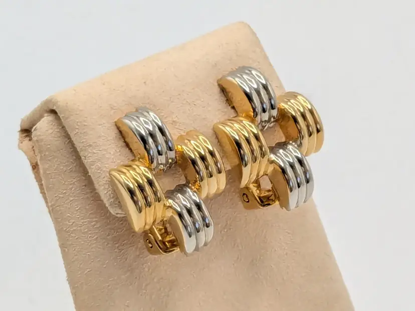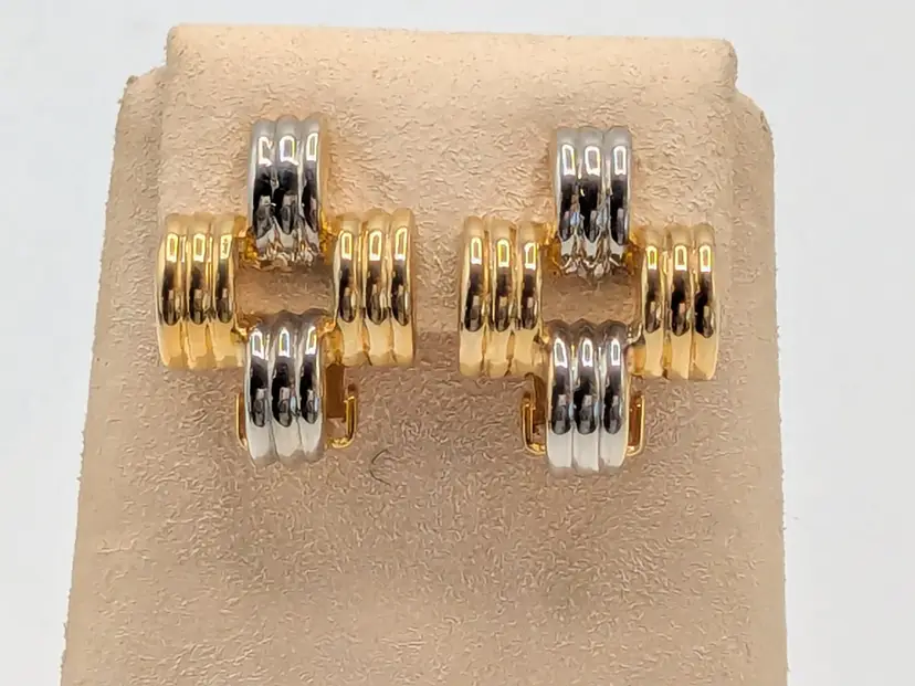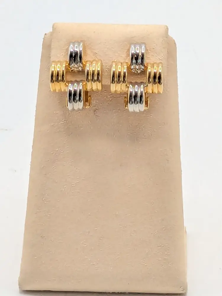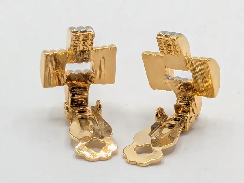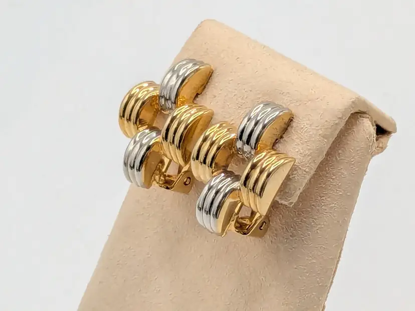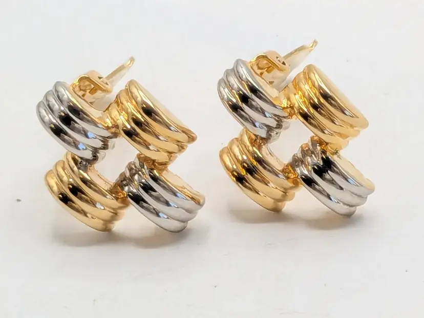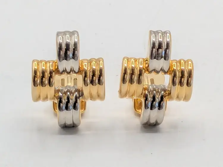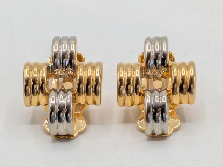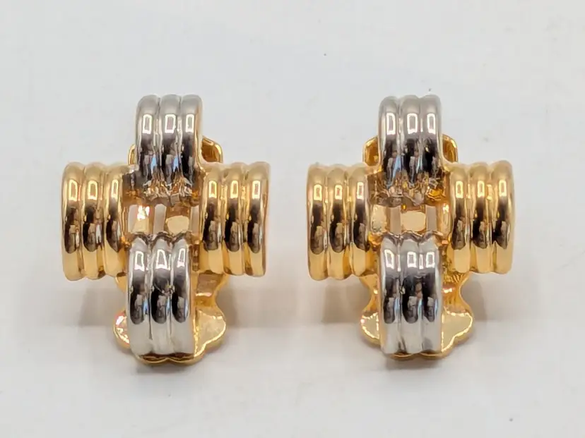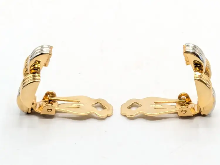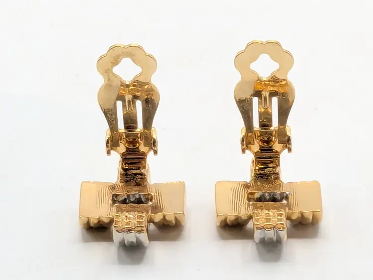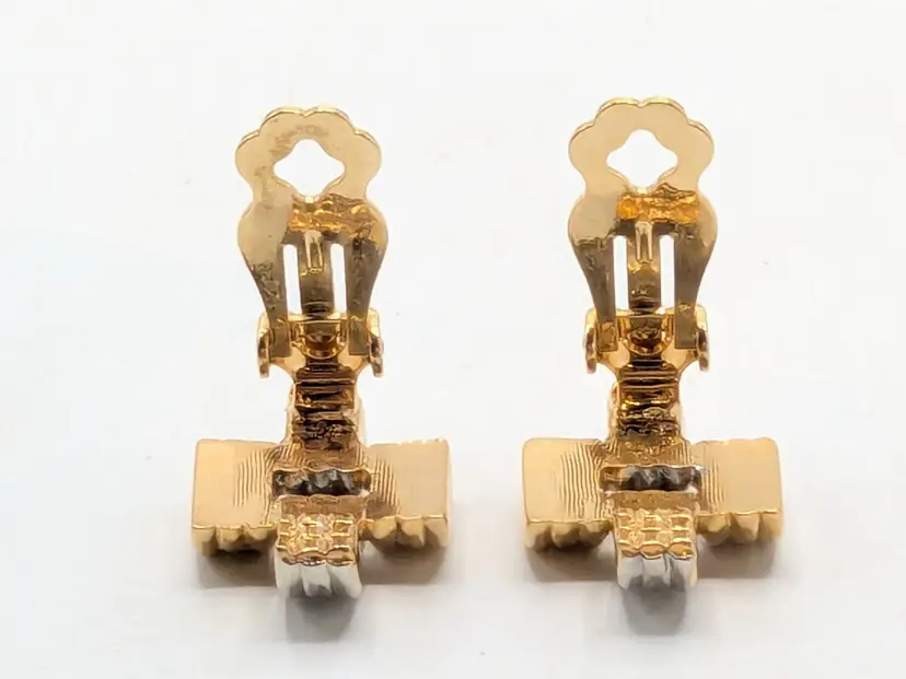 Good condition. Gold and silver tone is bright and shiny with no color loss. Clip on with a little weight to them. Measures 7/8" in length and 3/4" wide. EN3