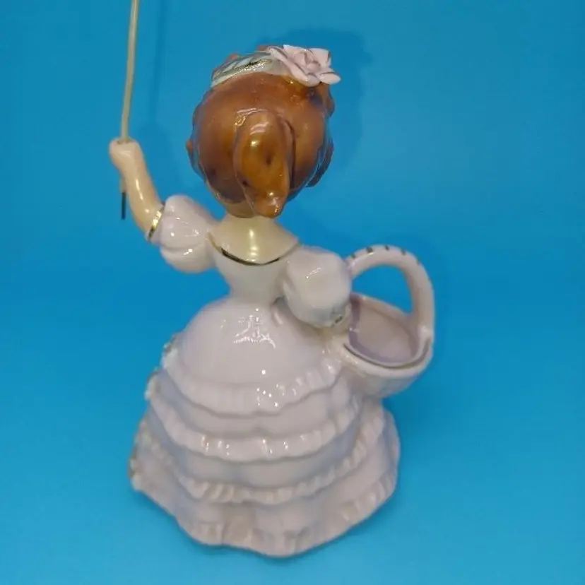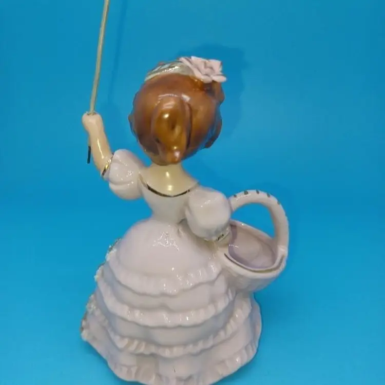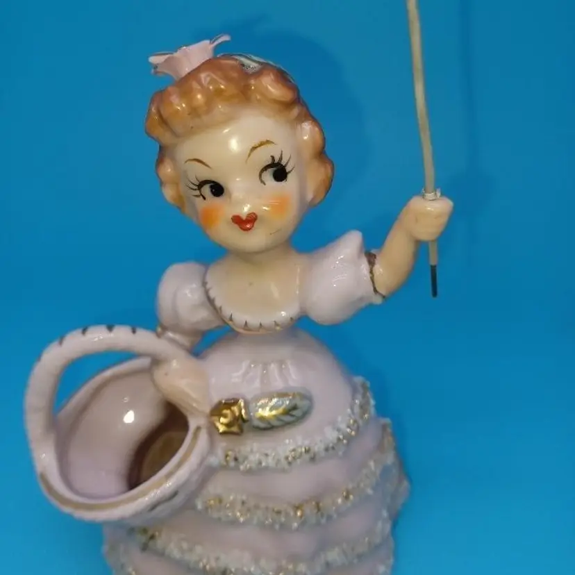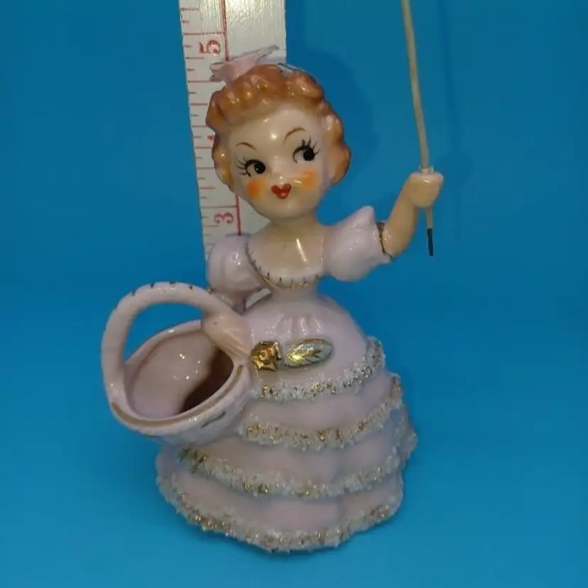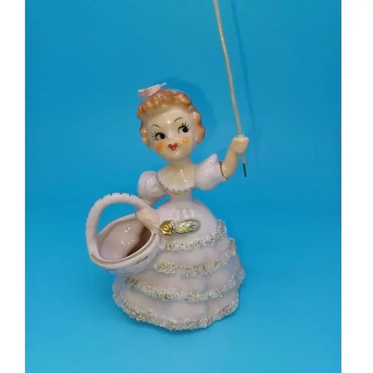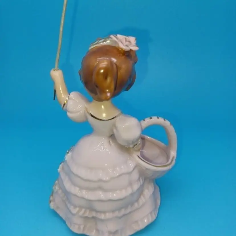 Vintage Ucagco Japan Ceramic Spaghetti Porcelain Girl with Pink and Gold Dress and Basket Missing parasol read Vintage Ucagco made in Japan Ceramic Girl with Pink Dress & gold accents She is carrying a Basket Figurine. (* Parasol is missing But does have original parasol pole) Made of Porcelain, it is Hand Painted and has Spaghetti Porcelain accents painted in gold. Top flower on her head does have a broken petal seems to be a common law to this style figurine please see all pictures as they're the best description all items from a smoke-free home with pets experienced fragile shipper Measures about 4.5 inches high Weight is 130 grams