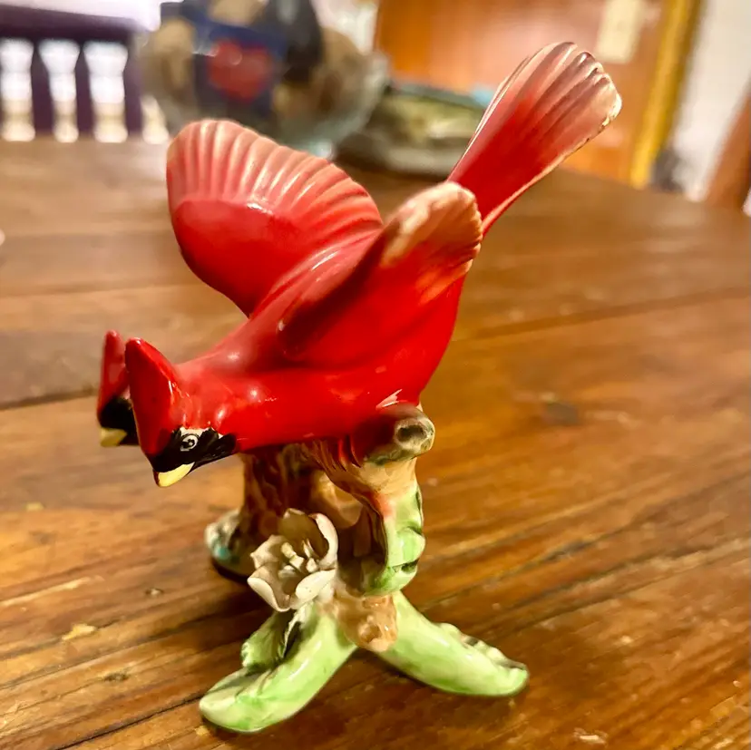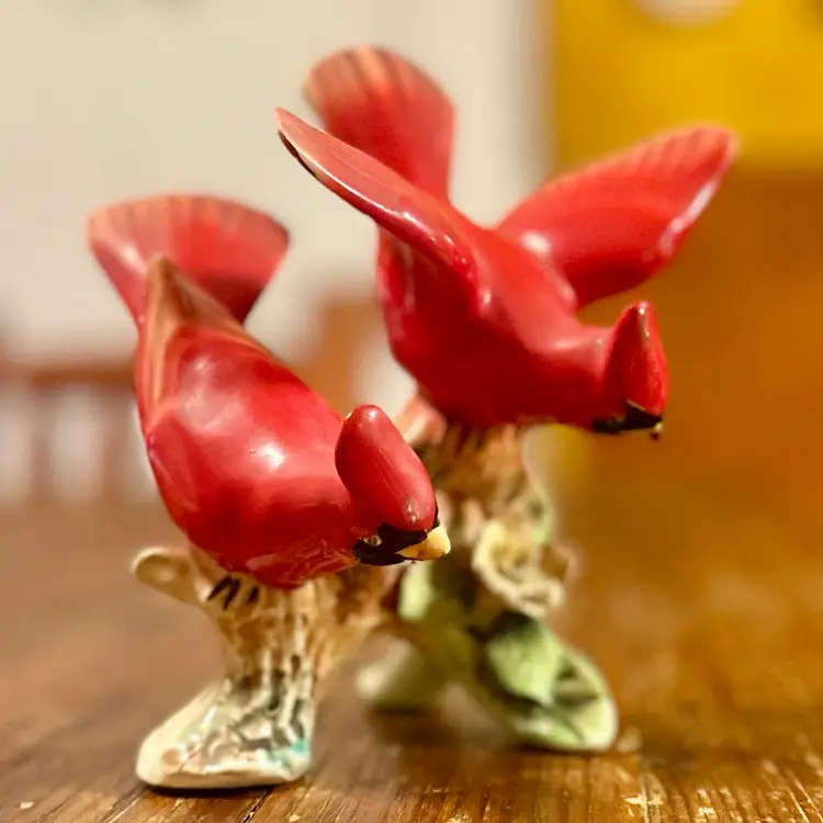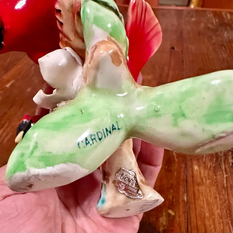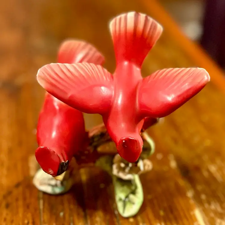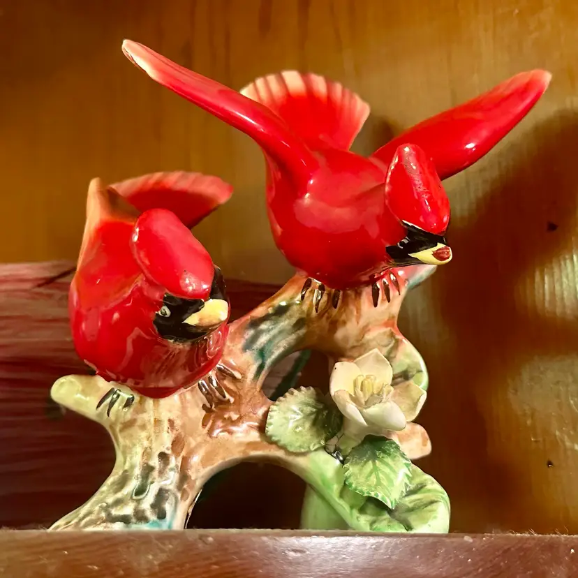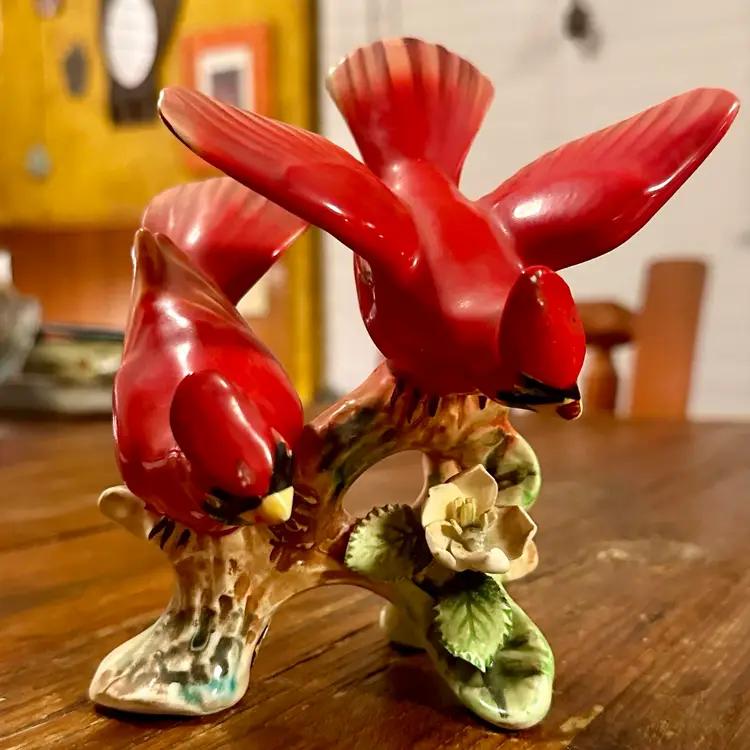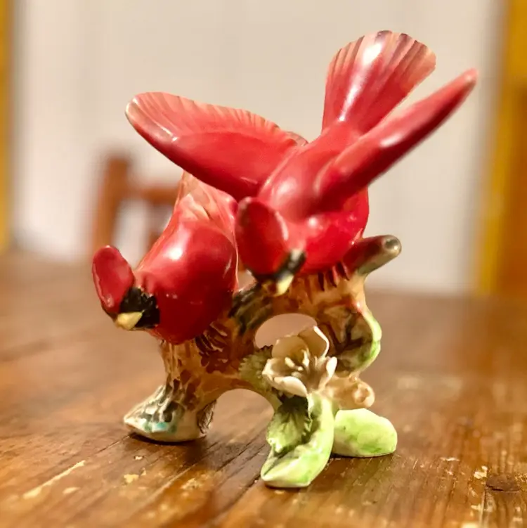 This is a vintage figurine depicting 2 cardinal birds on a branch with flowers. This delicate mini sculpture is a sample of Ucagco’s (United China and Glass Company) unique pieces. These kind of pieces can date around the 1950s.