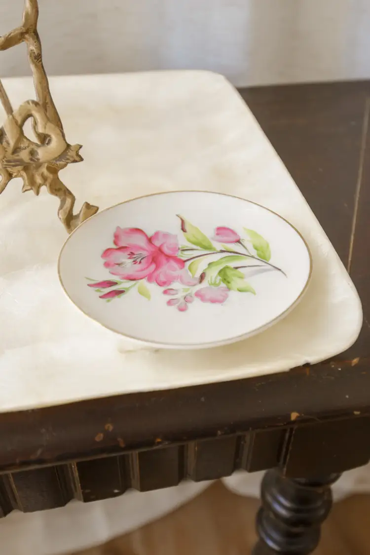 This vintage plate from Ucagco is a beautiful example of Japanese craftsmanship. The dish features hand-painted roses and other floral designs, making it a unique and eye-catching piece. It was made in Japan, and the quality shows in every detail. This plate is perfect for collectors or anyone who appreciates fine ceramics.