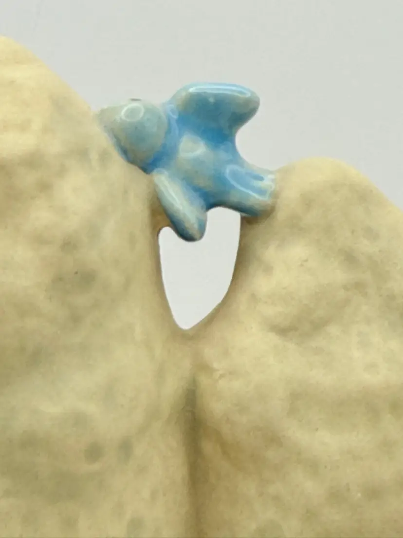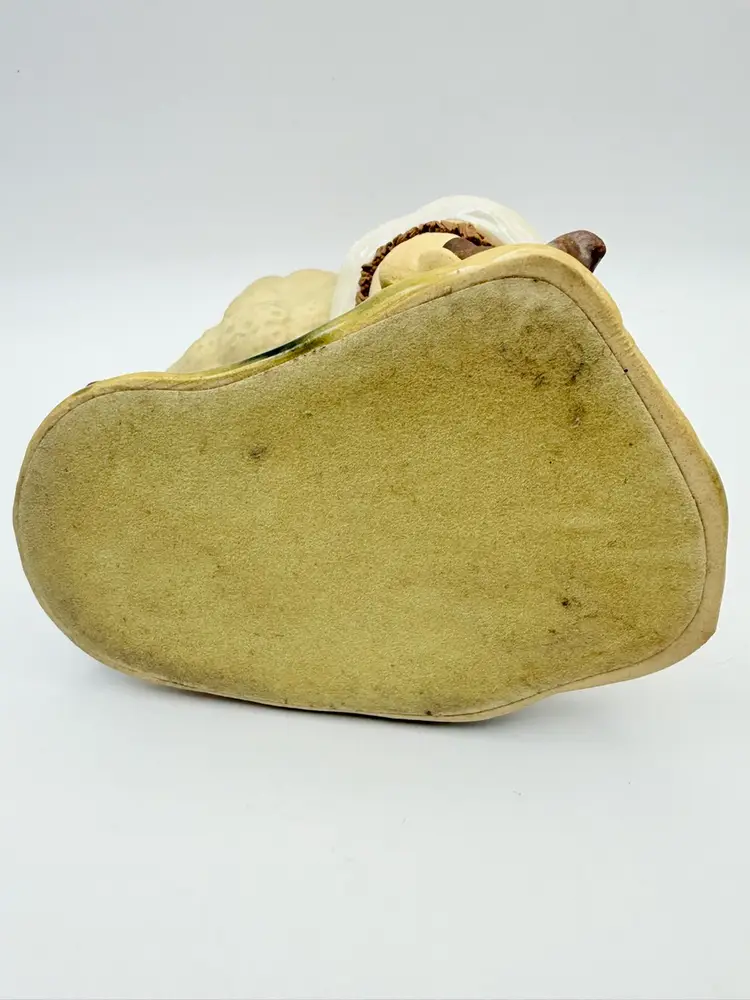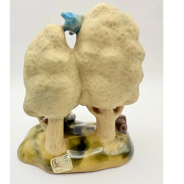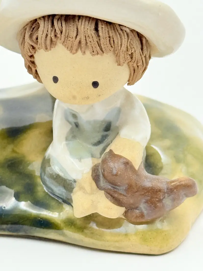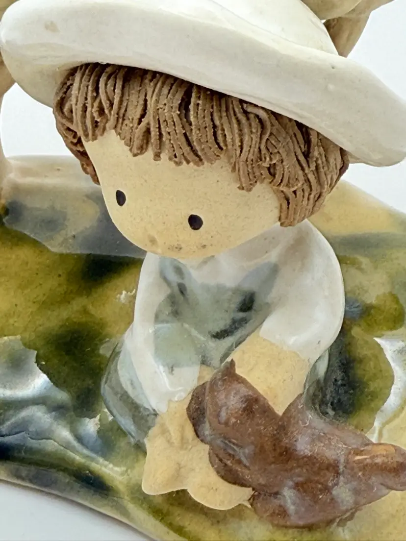 Vintage art pottery figurine.It features a country-style little boy with white hat and suspenders petting a squirrel and sitting under two pretty trees . There is a blue bird in the trees. No chips or cracks 6” tall 5” Wide