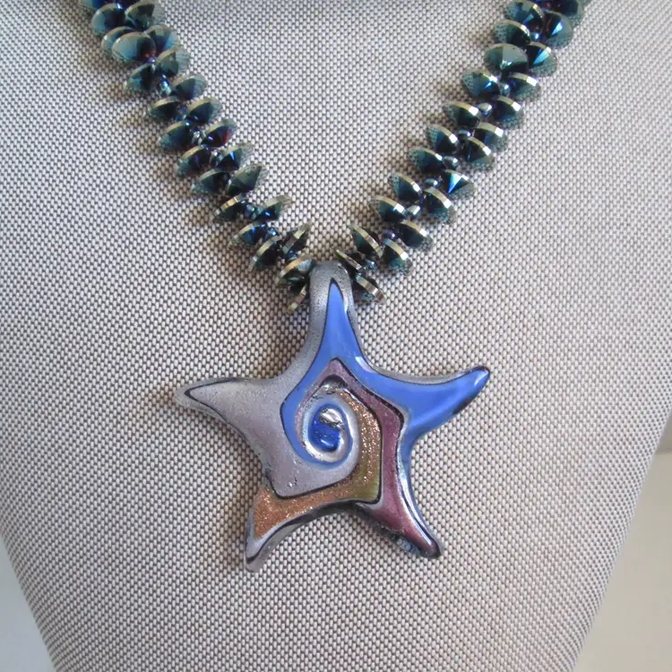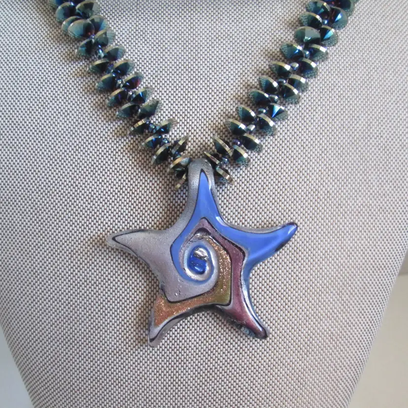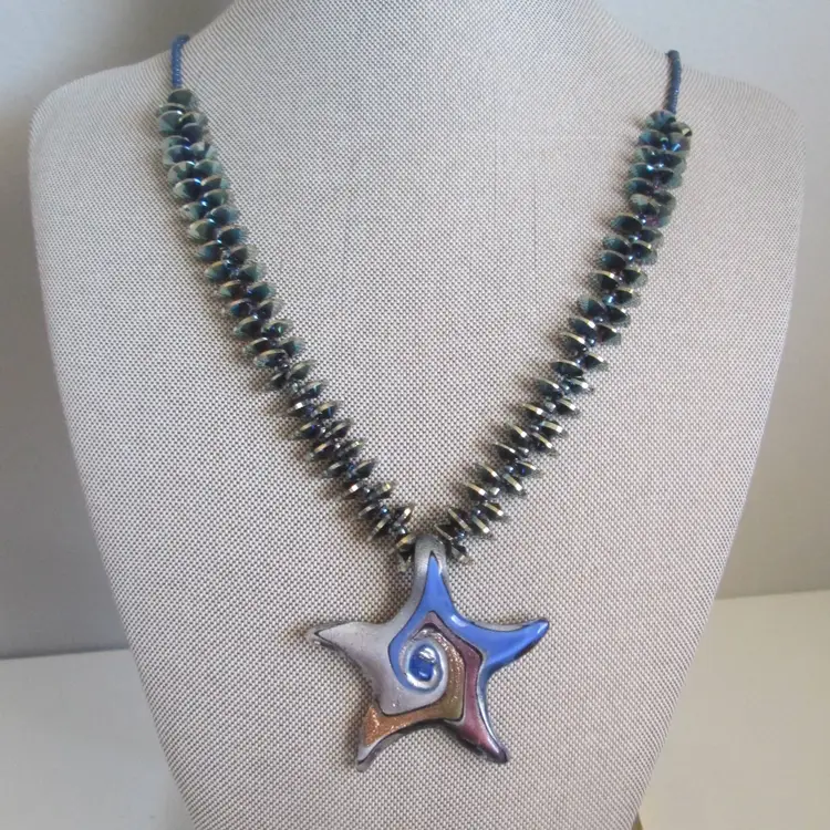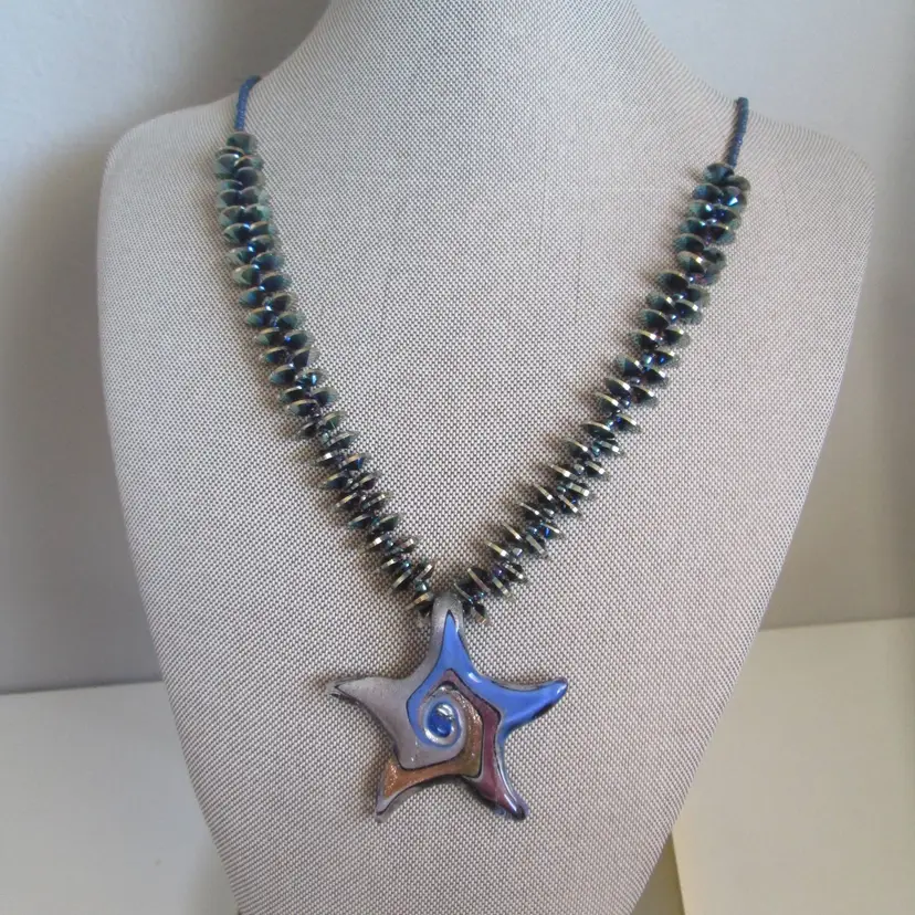 Vintage "Under the Sea" lampwork glass bead and starfish pendant necklace. This is a one of a kind upcycle creation by me using vintage beads and jewelry findings. The pendant measures 2 1/3" across. The length of the beaded necklace measures 21" to 22" with adjustment.
