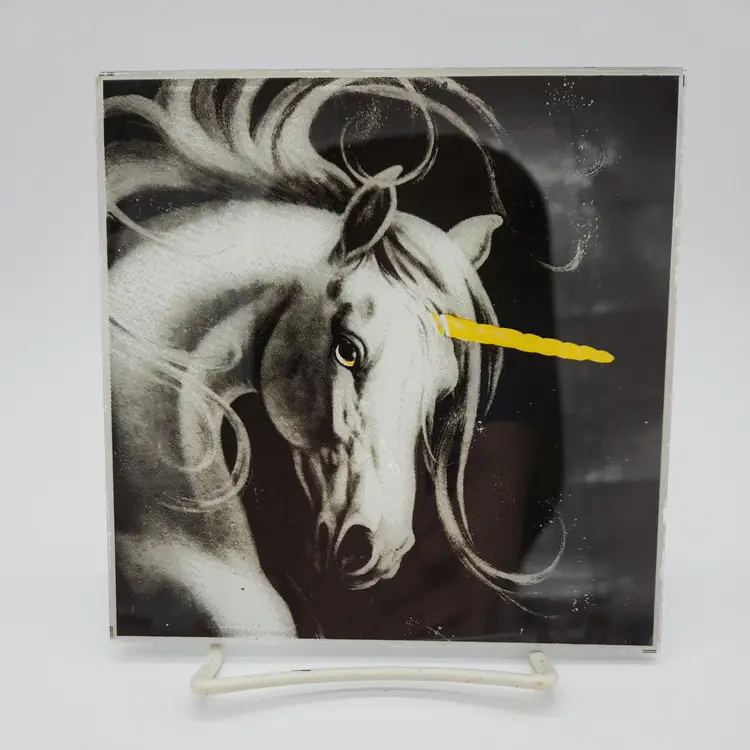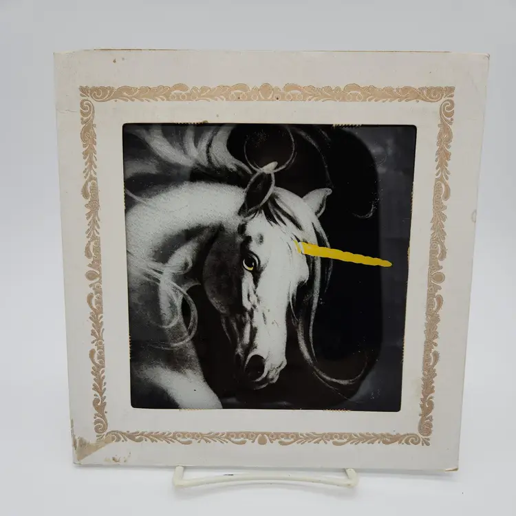 Vintage Unicorn on Glass 1980's Carnival Game Prize Black & White w/Gold Horn. 6" Square Couple of scuffs to painted image but actually looks great for it's age. Thanks for looking!