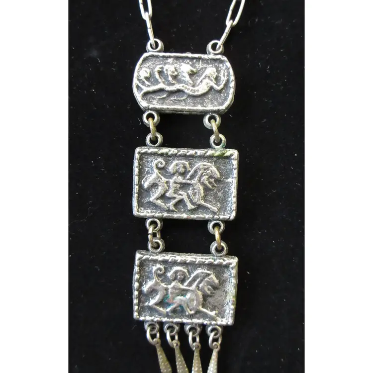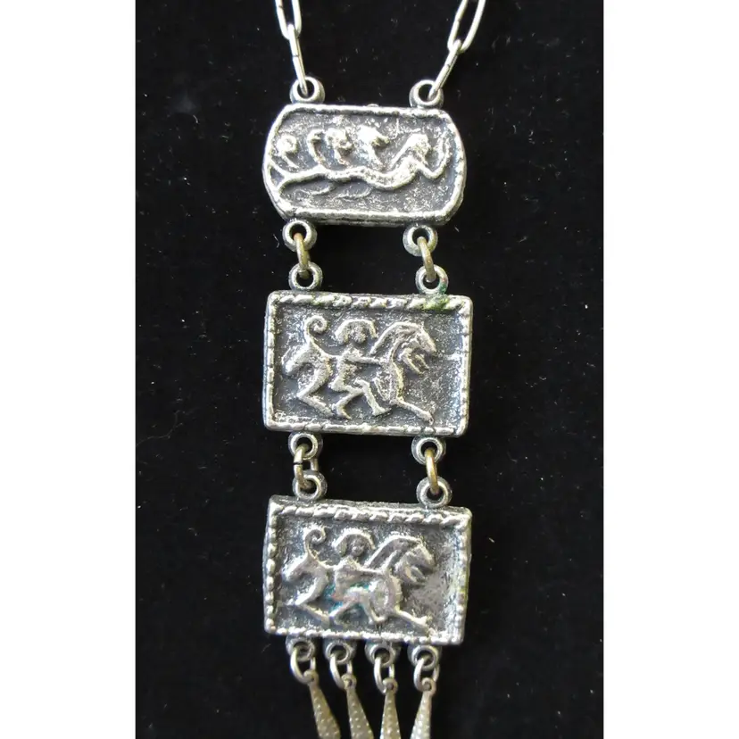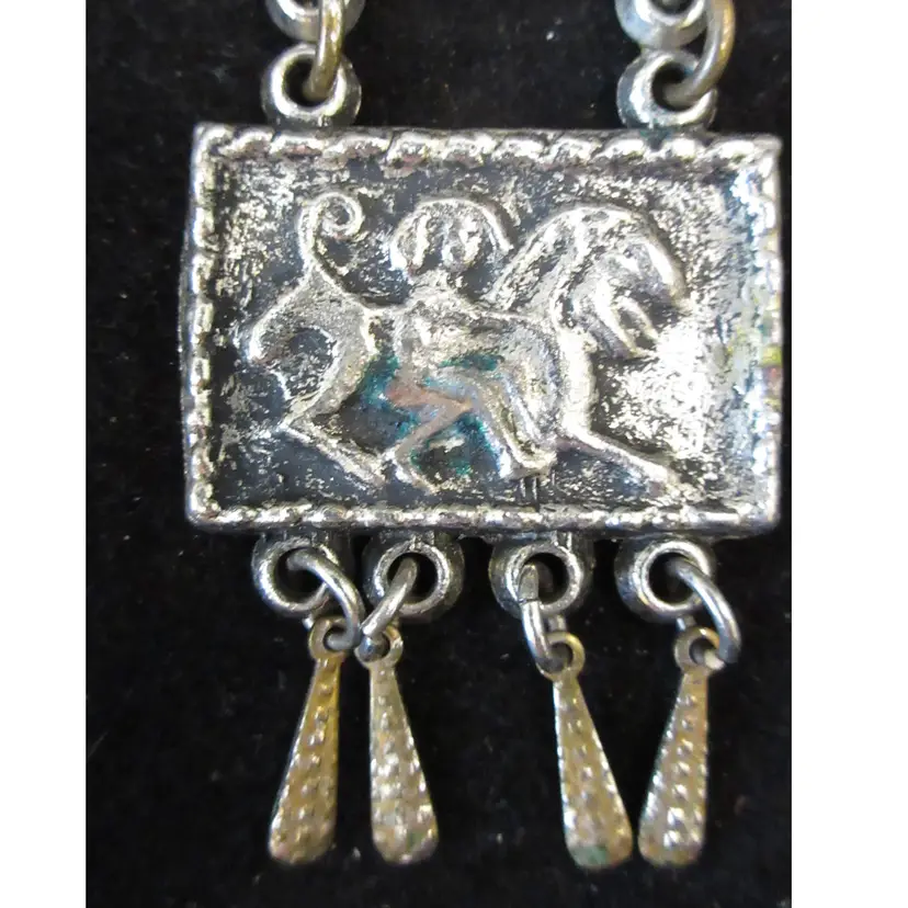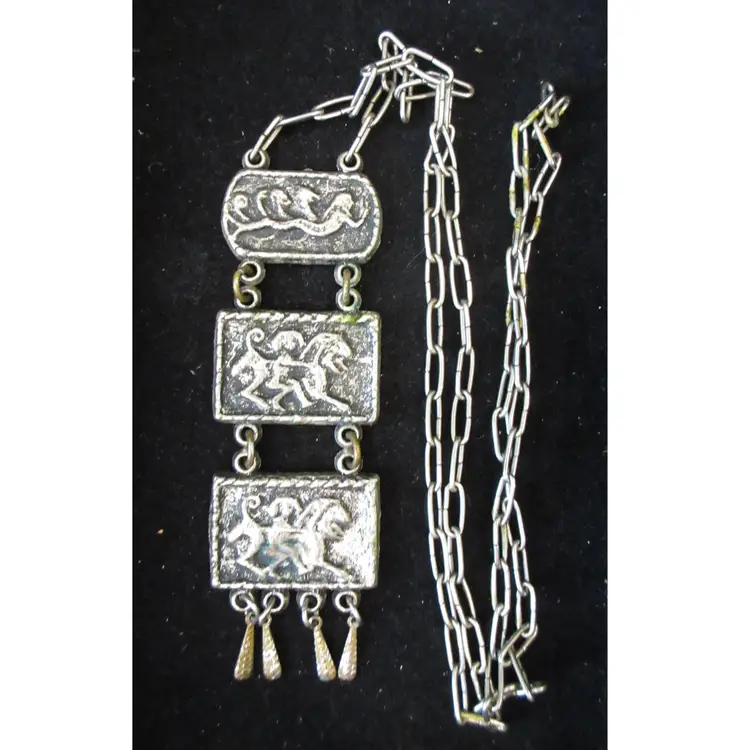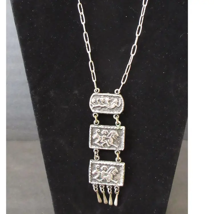 This is a SUPER UNIQUE vintage silver tone metal Tibetan replica necklace. The necklace is made of long oval chain links with a 4.5 inch long pendant. The pendant is articulated into 3 sections with Tibetan temple motifs. This necklace is 30 inches long and does not have a clasp (it's an over-the-head type necklace).