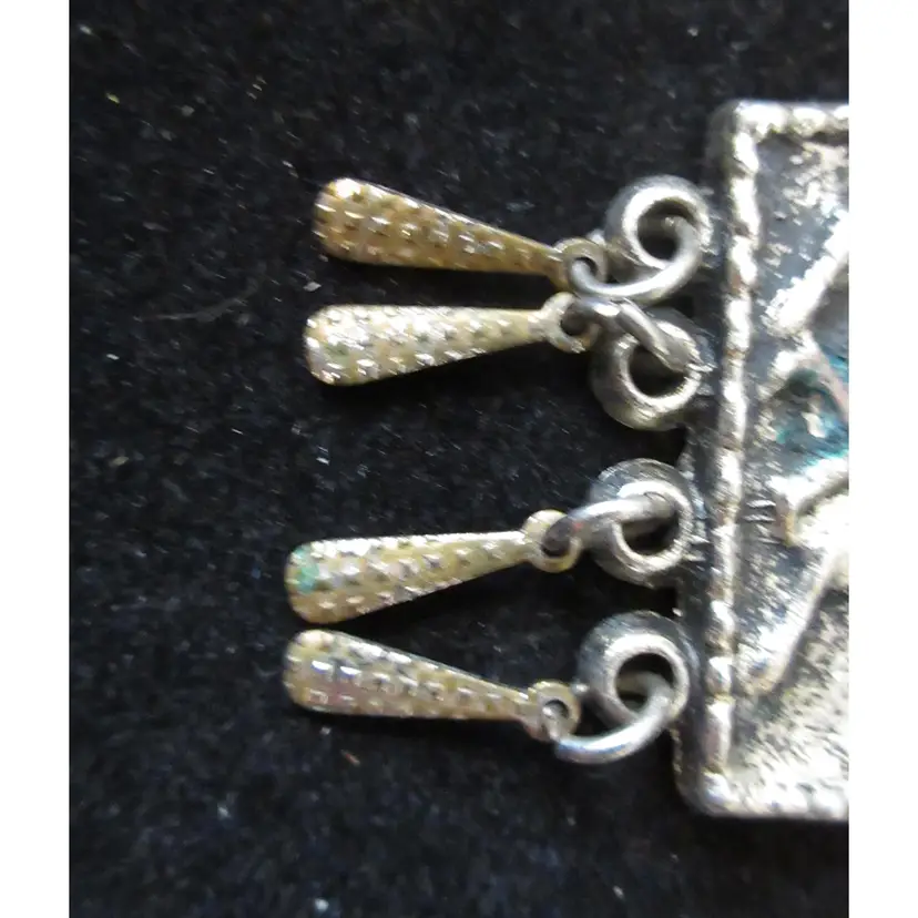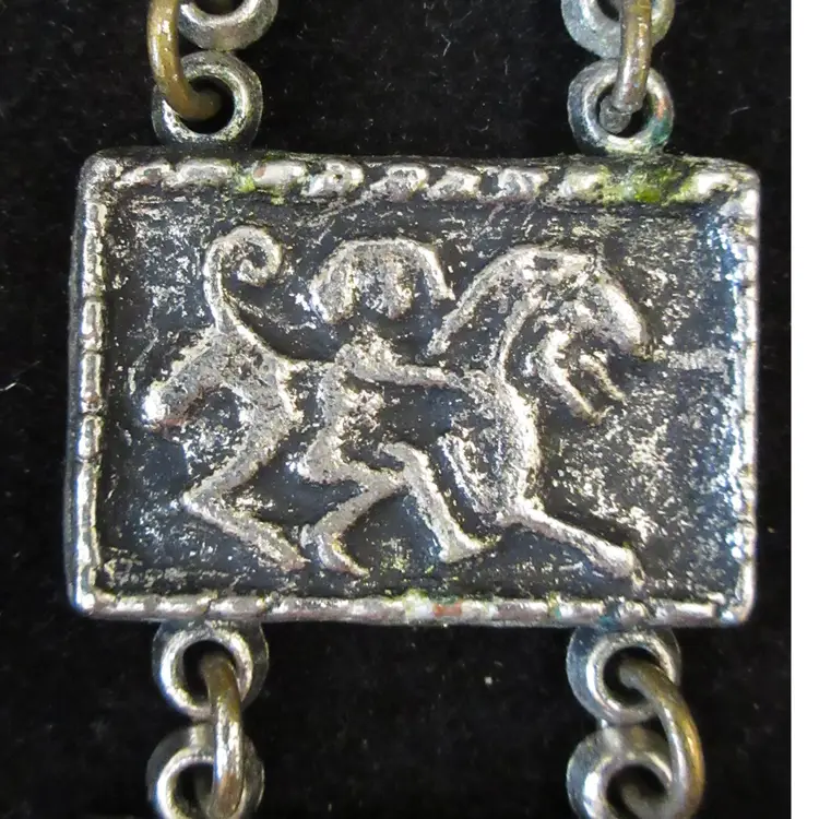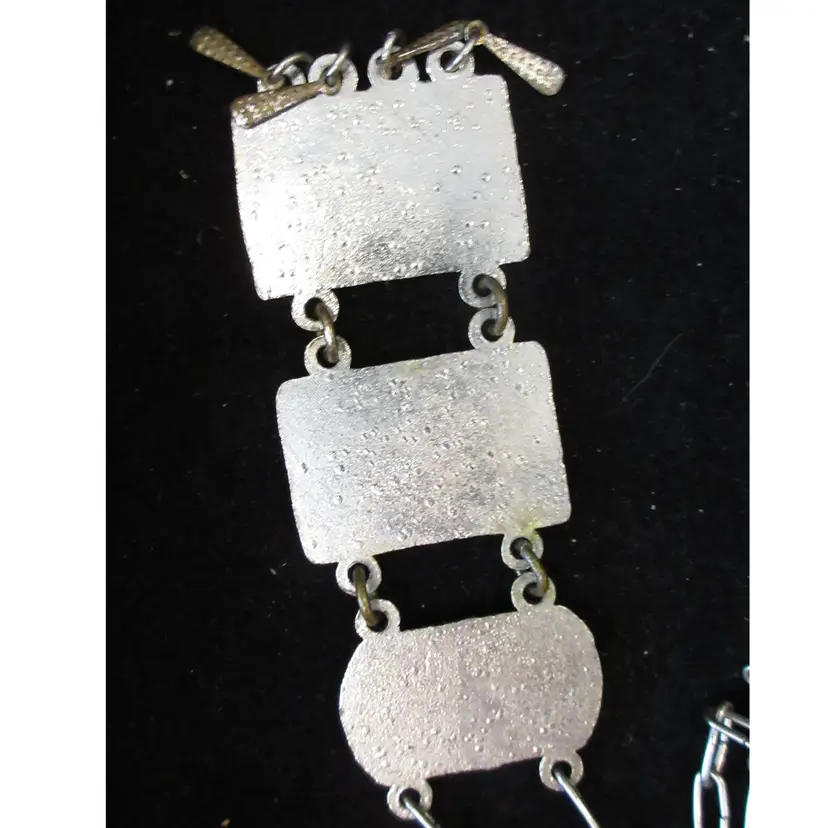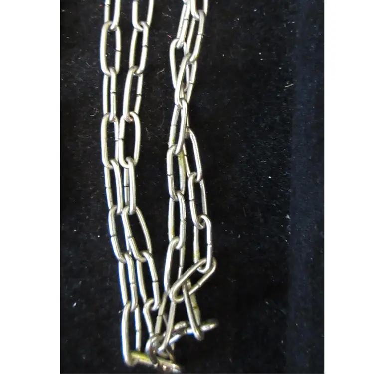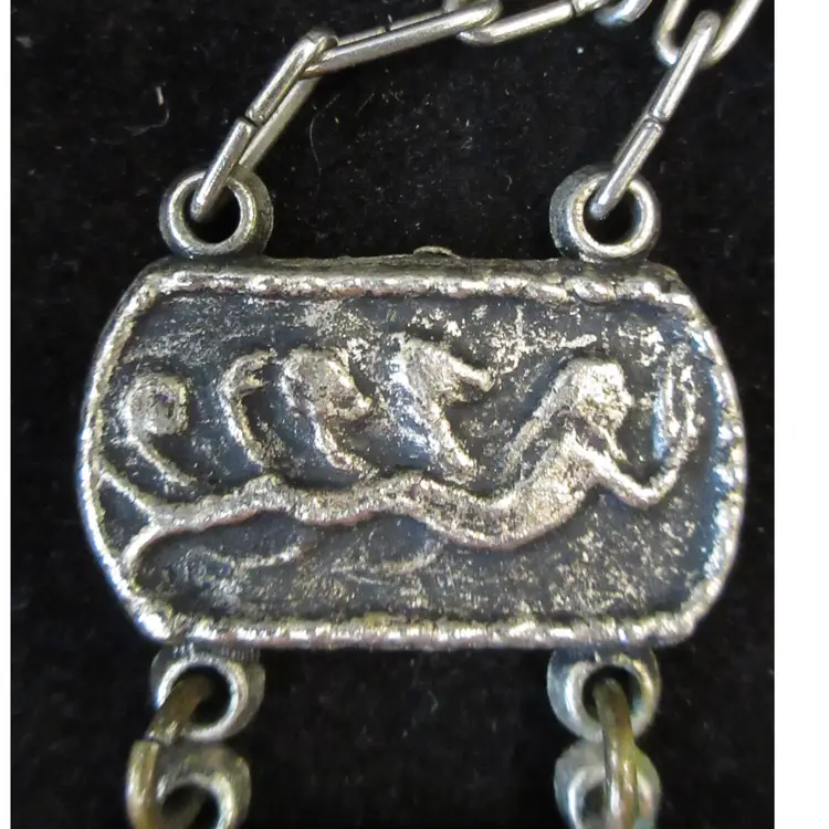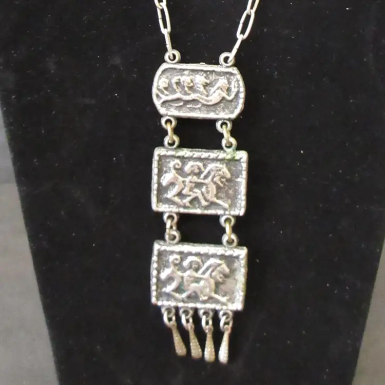 This is a SUPER UNIQUE vintage silver tone metal Tibetan replica necklace. The necklace is made of long oval chain links with a 4.5 inch long pendant. The pendant is articulated into 3 sections with Tibetan temple motifs. This necklace is 30 inches long and does not have a clasp (it's an over-the-head type necklace).