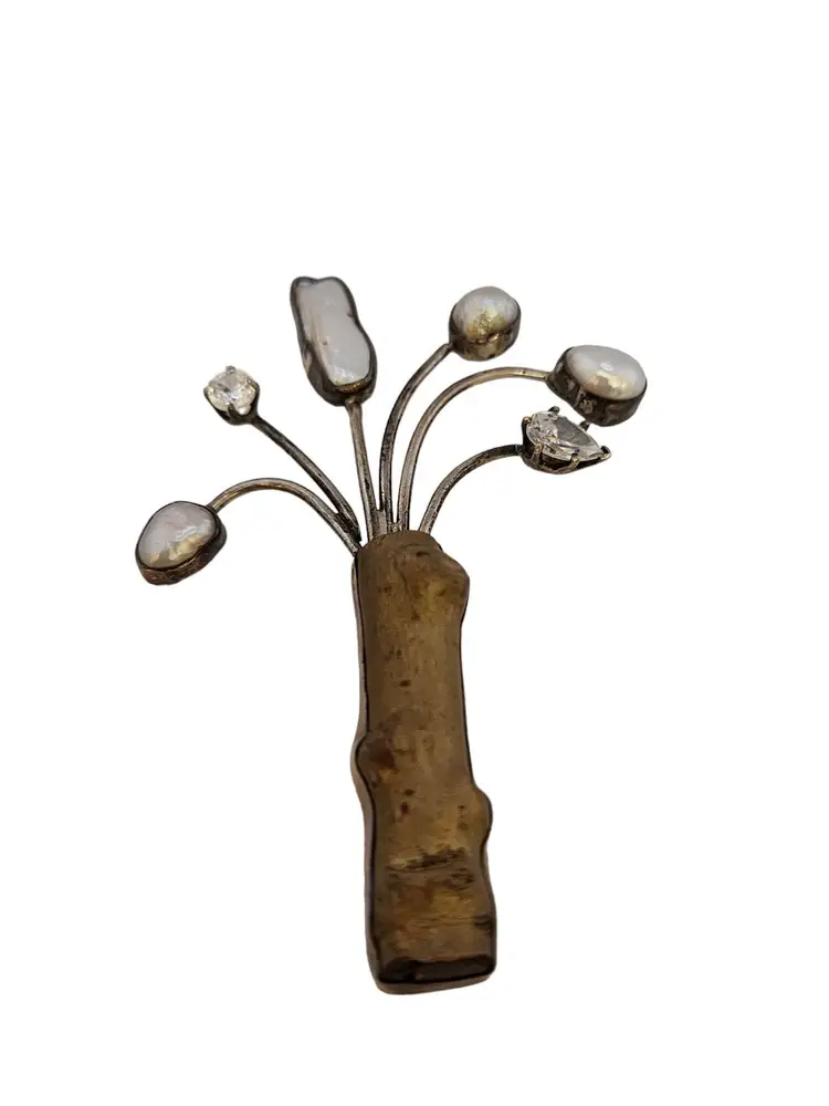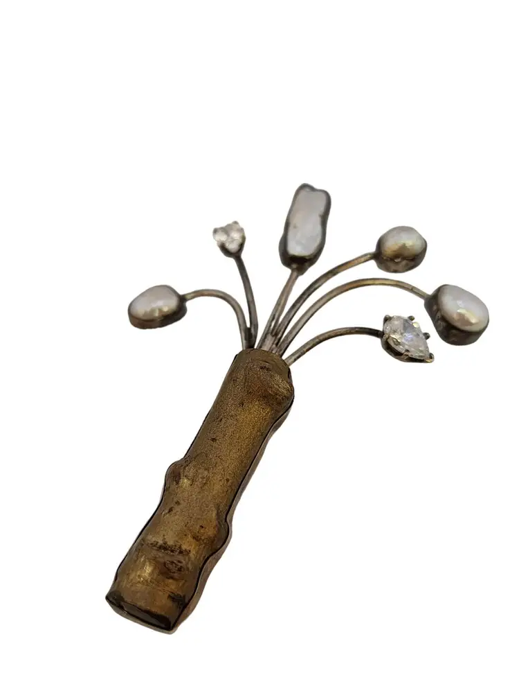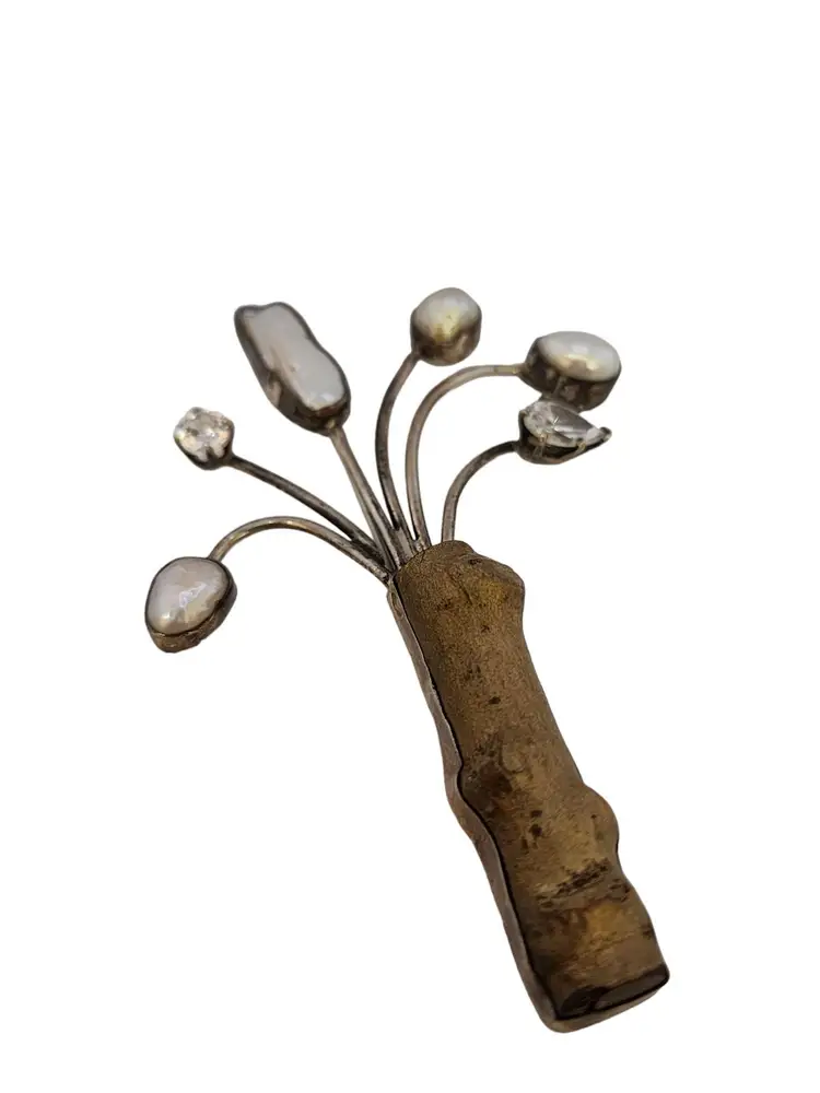 Vintage Unique Signed SCW Sterling Abalone Bamboo & Glass Figural Brooch (A3608)