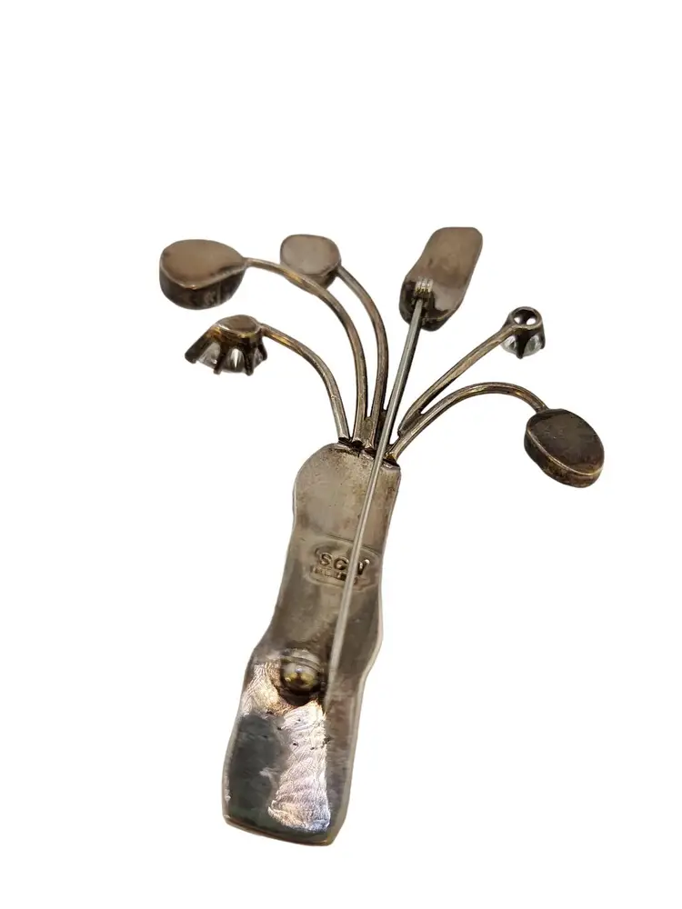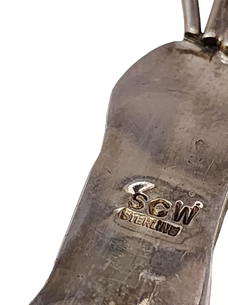 Size: 3.75" Condition: very good vintage; some wear to gold paint Signed: SCW Sterling Details: Very well-made wood bamboo-style painted back.