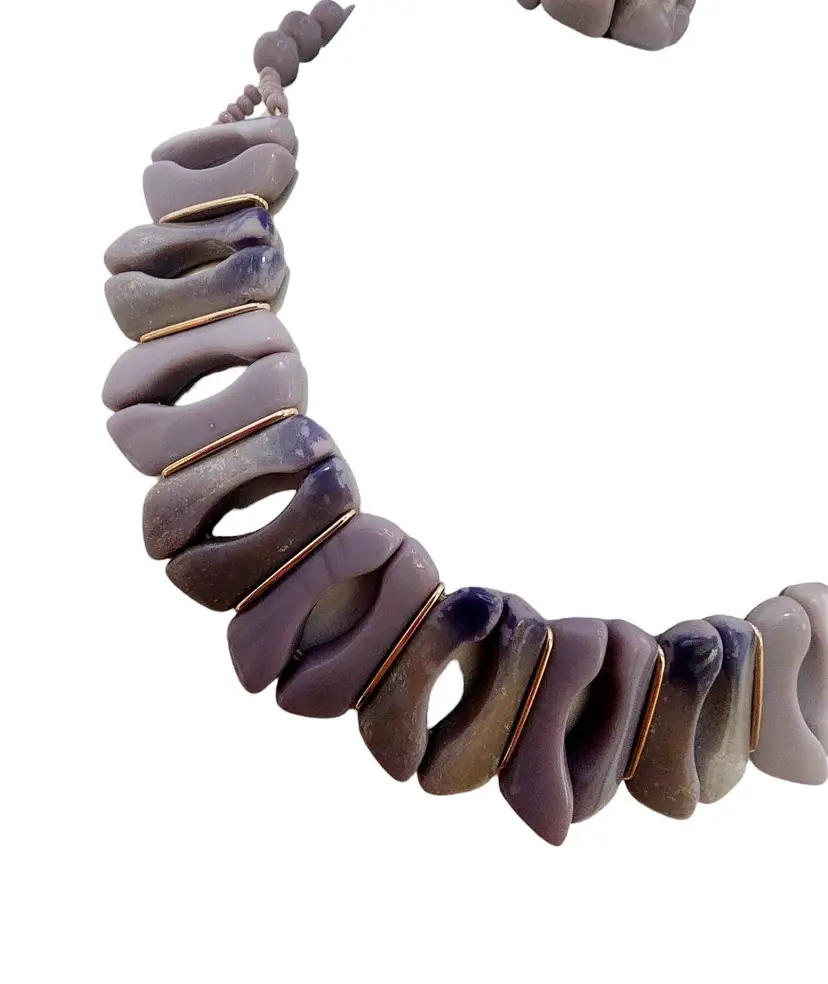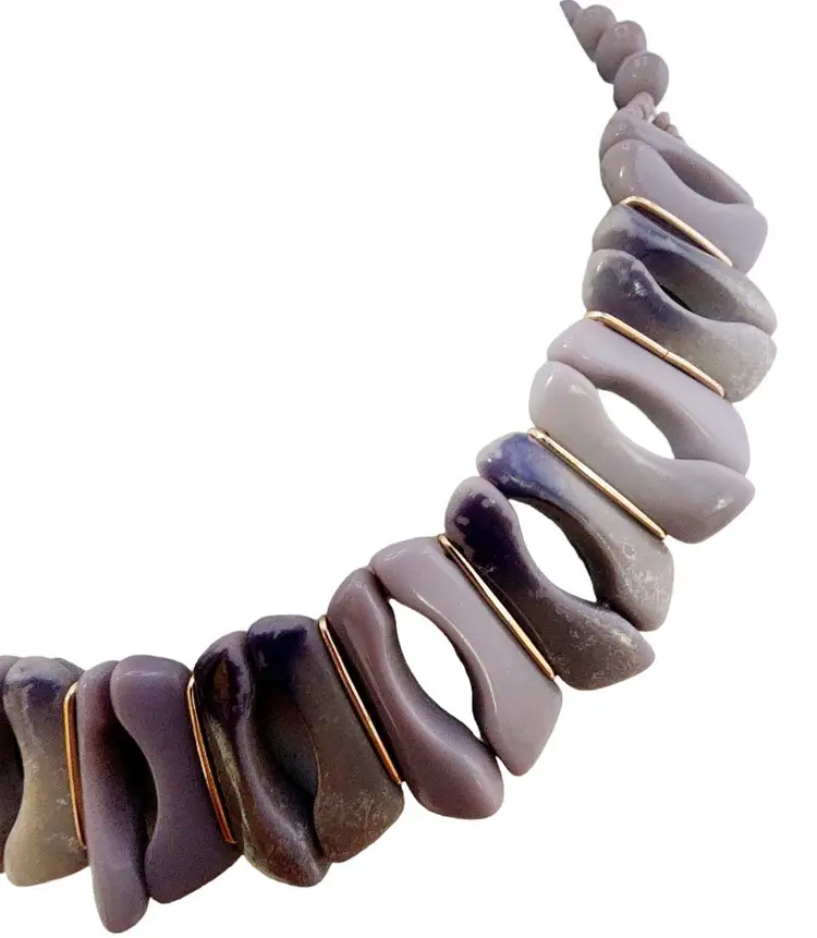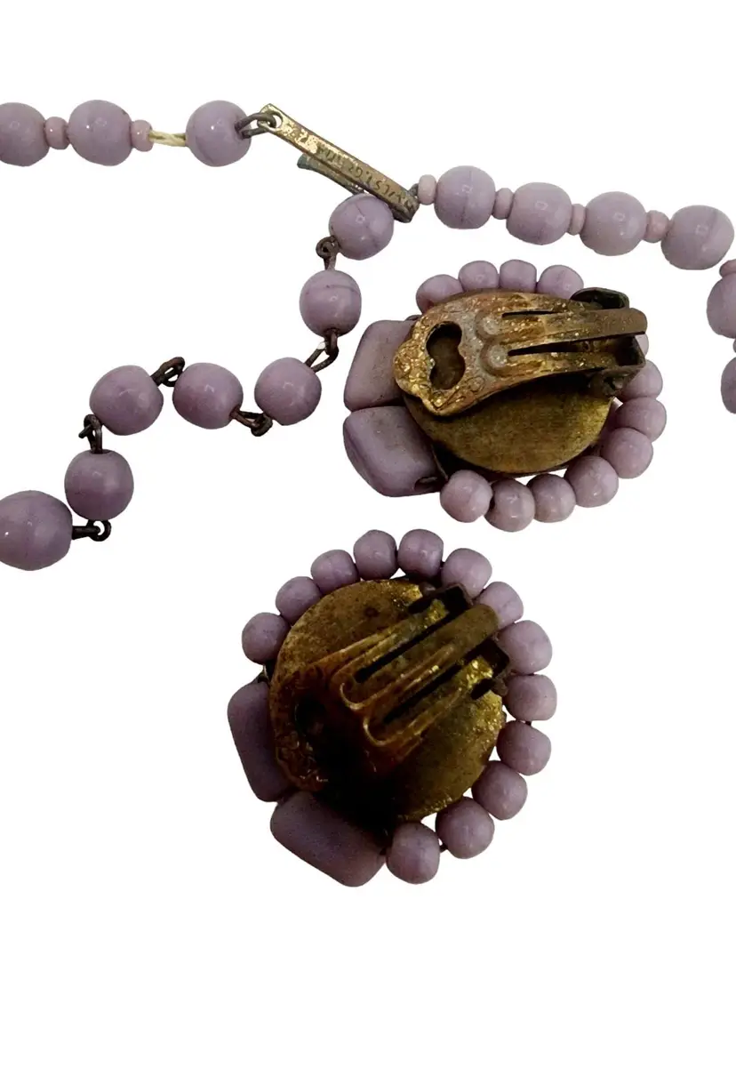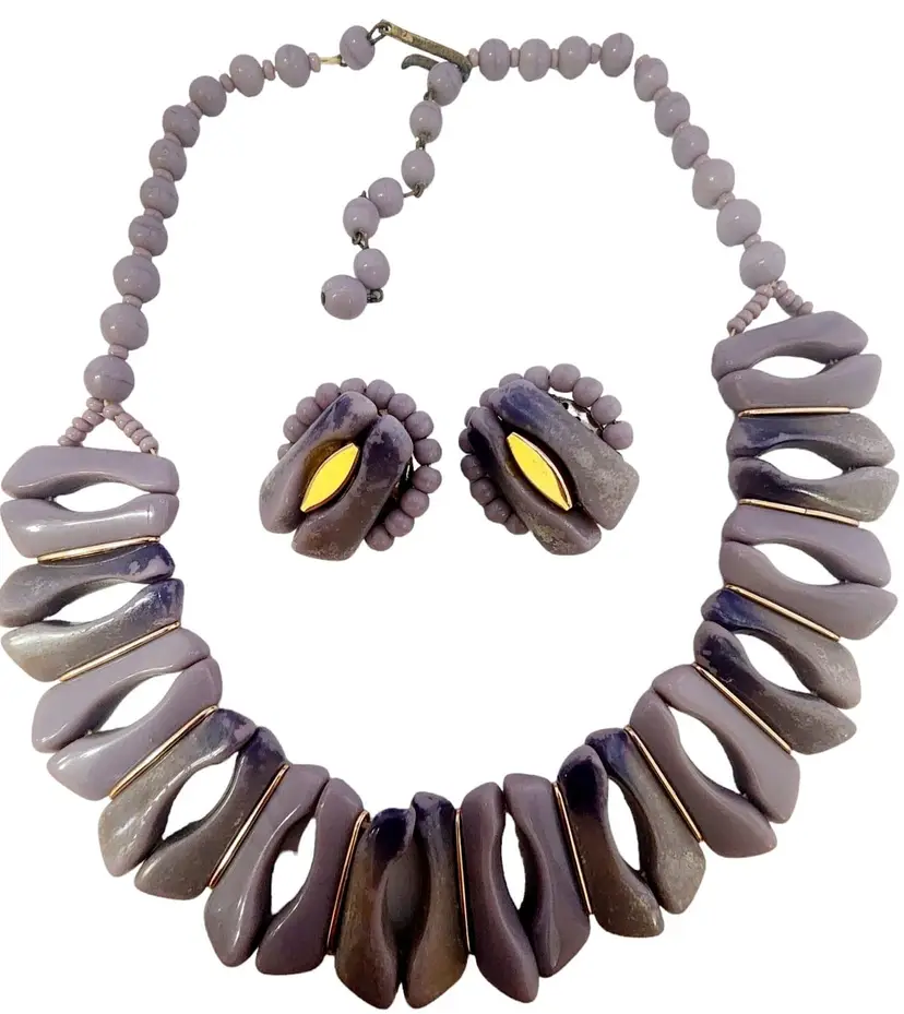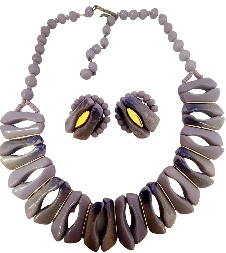 Color: Purple, Lilac Condition: Good vintage; there is a lot of wear, darkening to the metal. Signed: West Germany Details: This is an amazing set, and I have it in red as well. All pieces are signed. The color is purple and lilac, mottled design.