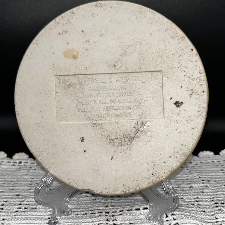Marked “The Universal Clay Prod’s Co, Sandusky, Ohio, Manufacturers of Electrical Porcelain, Foundry Refractories, Special Ceramics” 6” diameter, 1” tall. One chip and manufacturing flaw. See photos.