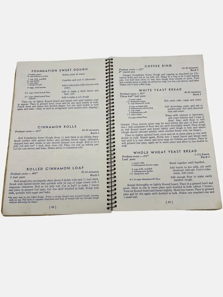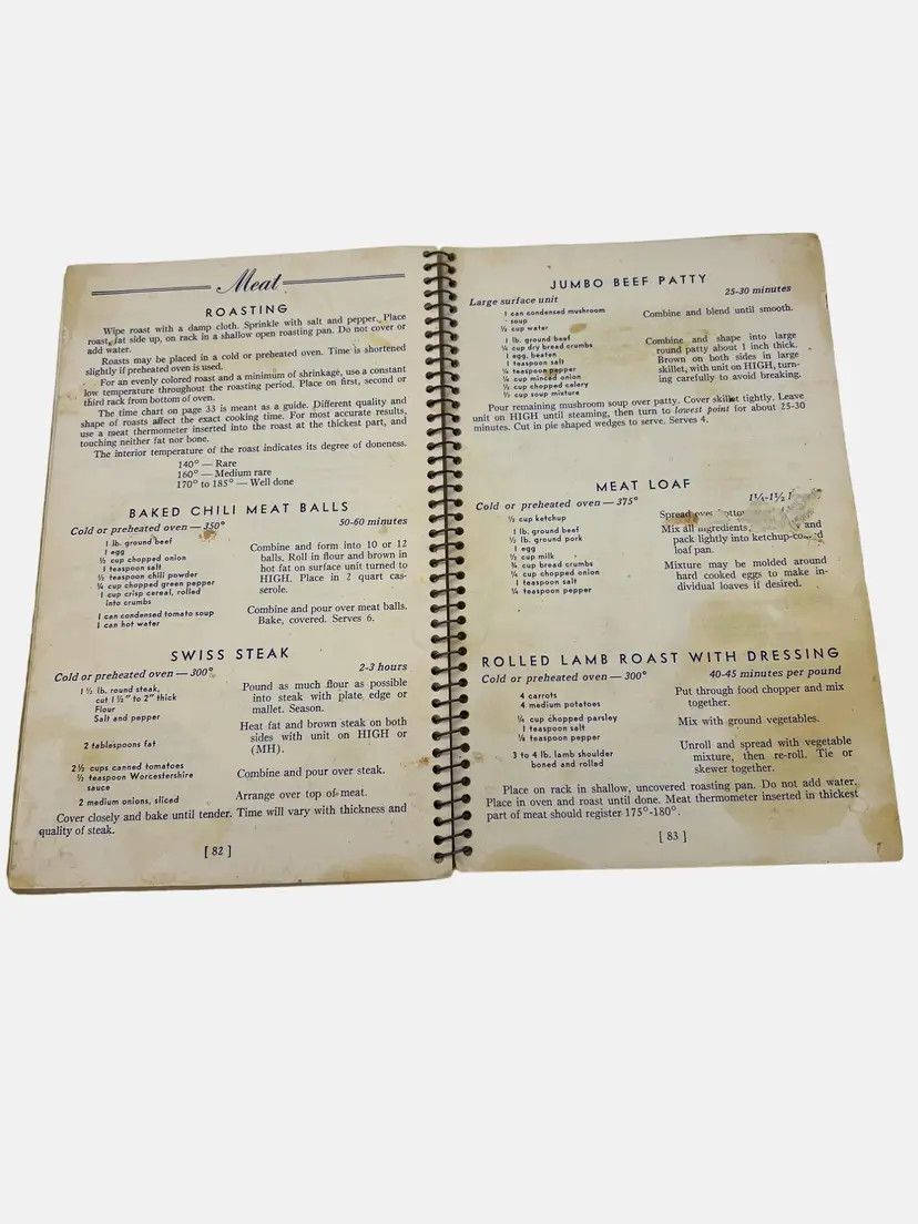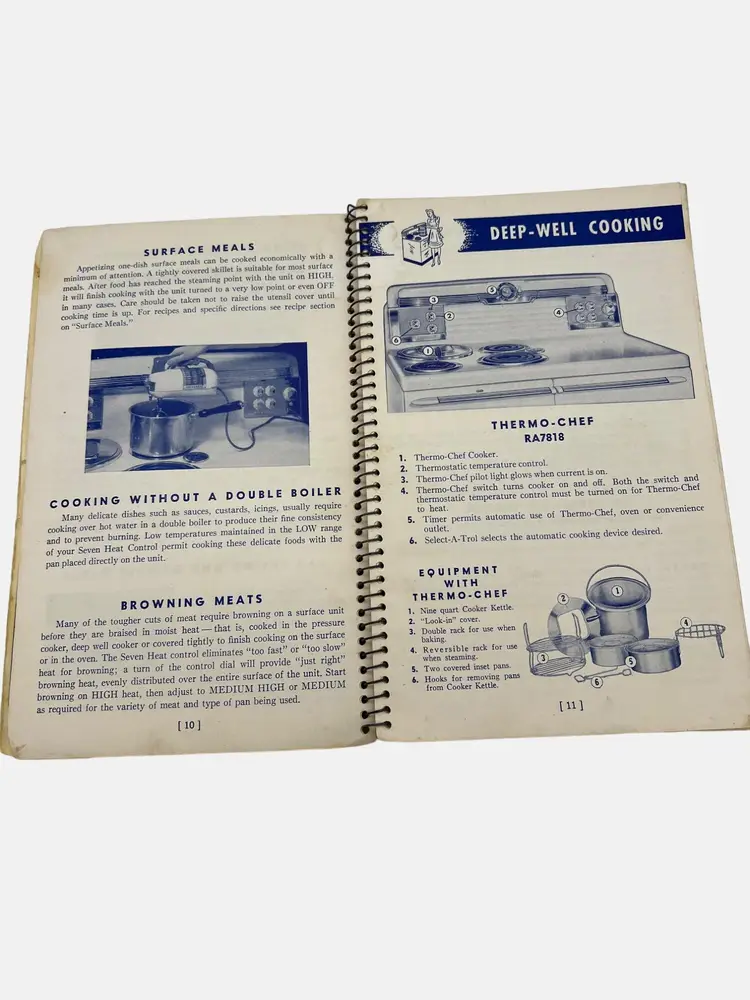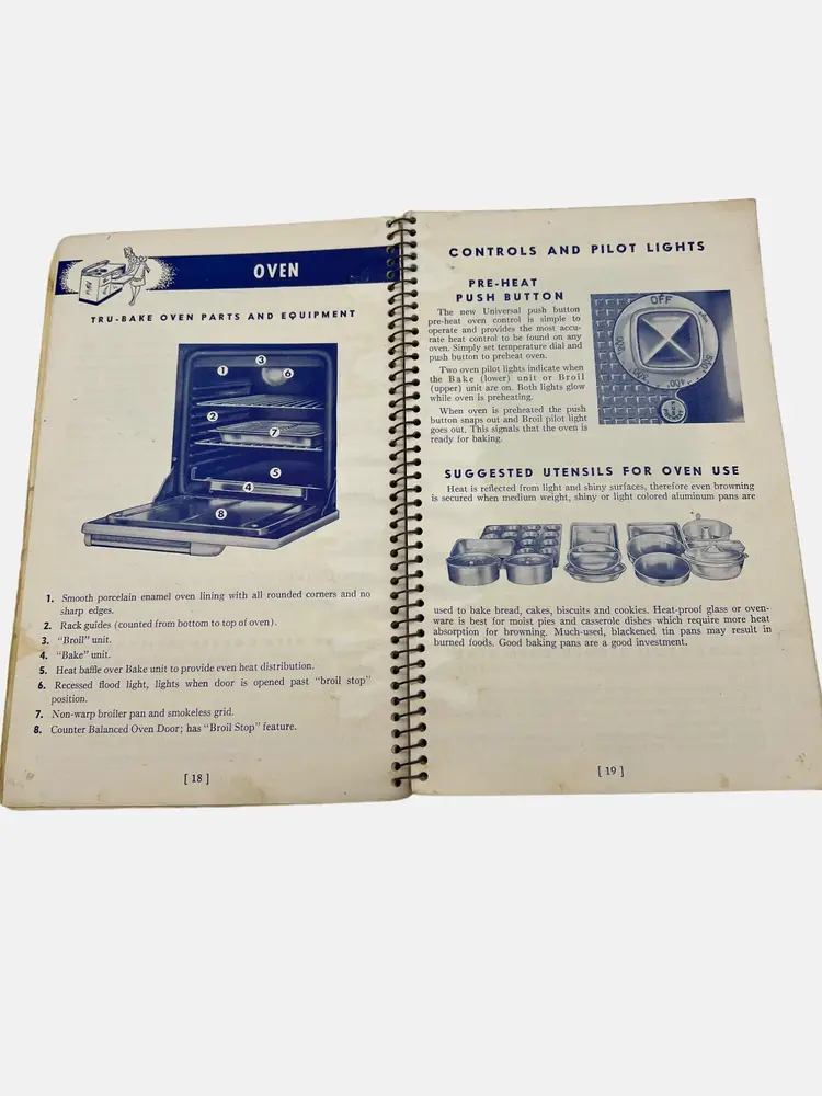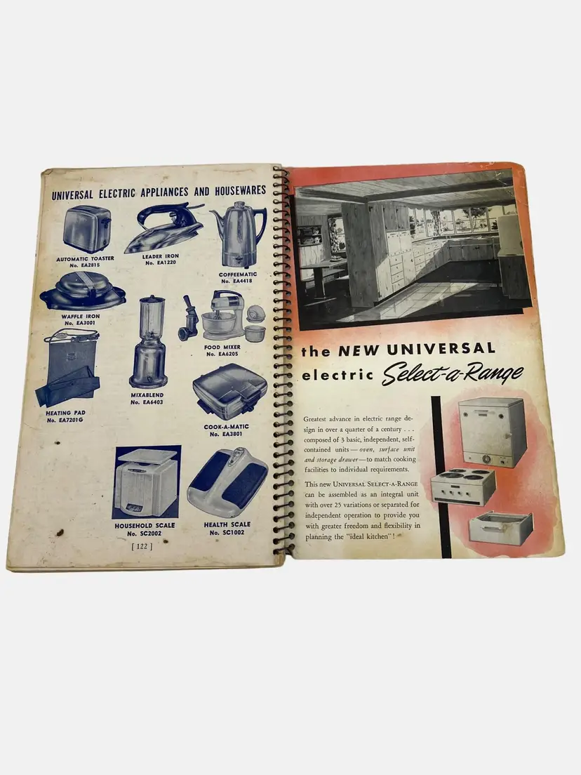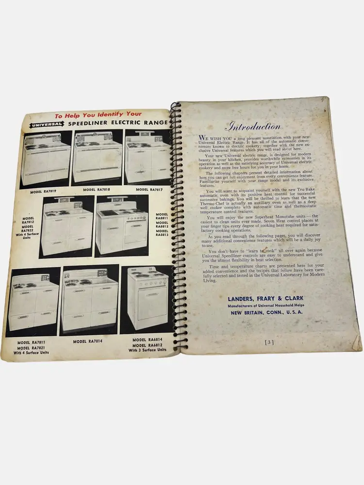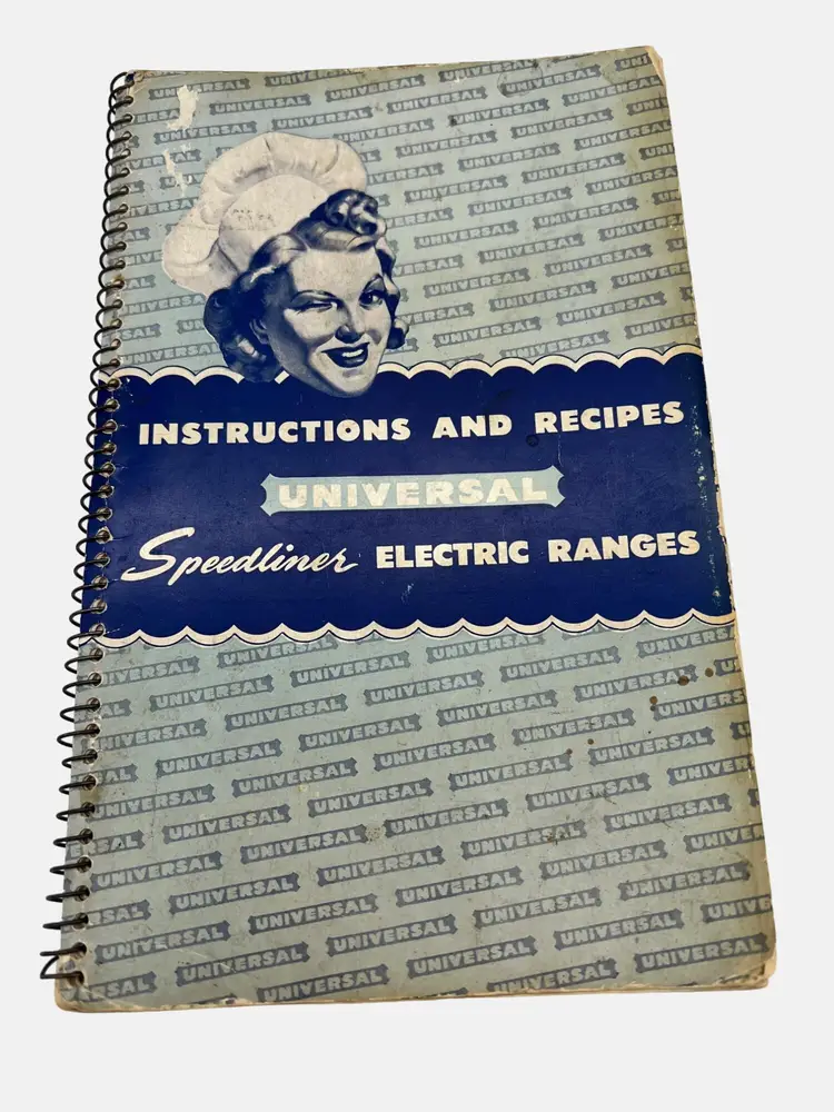 This vintage instruction and recipe book from Universal provides comprehensive guidance for the use and maintenance of Speedliner Electric Ranges. It includes recipes and cooking tip. A must-have for collectors and enthusiasts of retro kitchen appliances. It measures 8.25" x 5.25" and has 122 numbered pages in a spiral bound format. Presented by Landers, Frary & Clark - manufacturers of Universal Household Helps in New Britain, Connecticut.