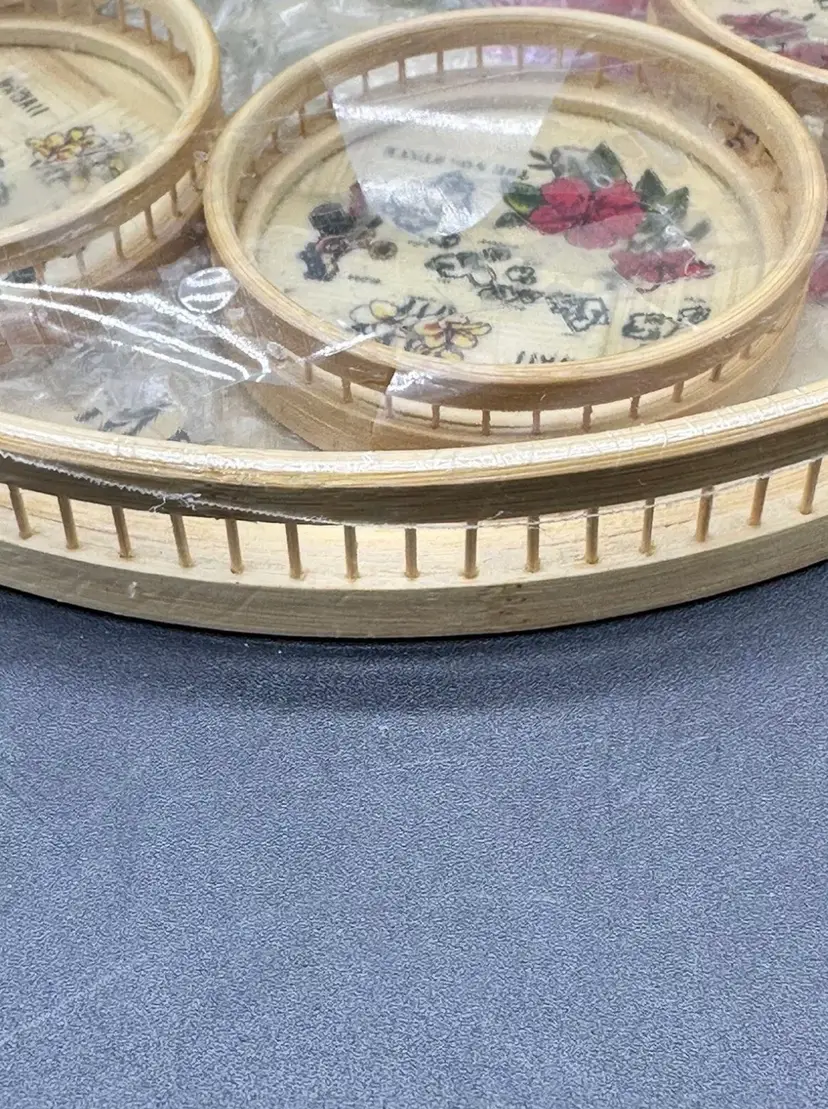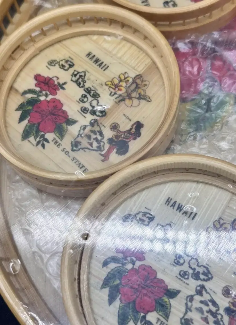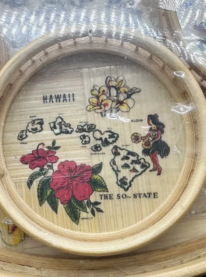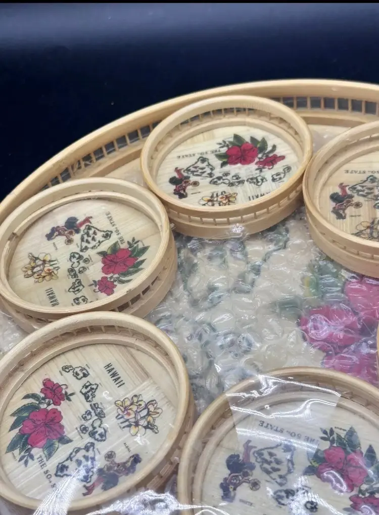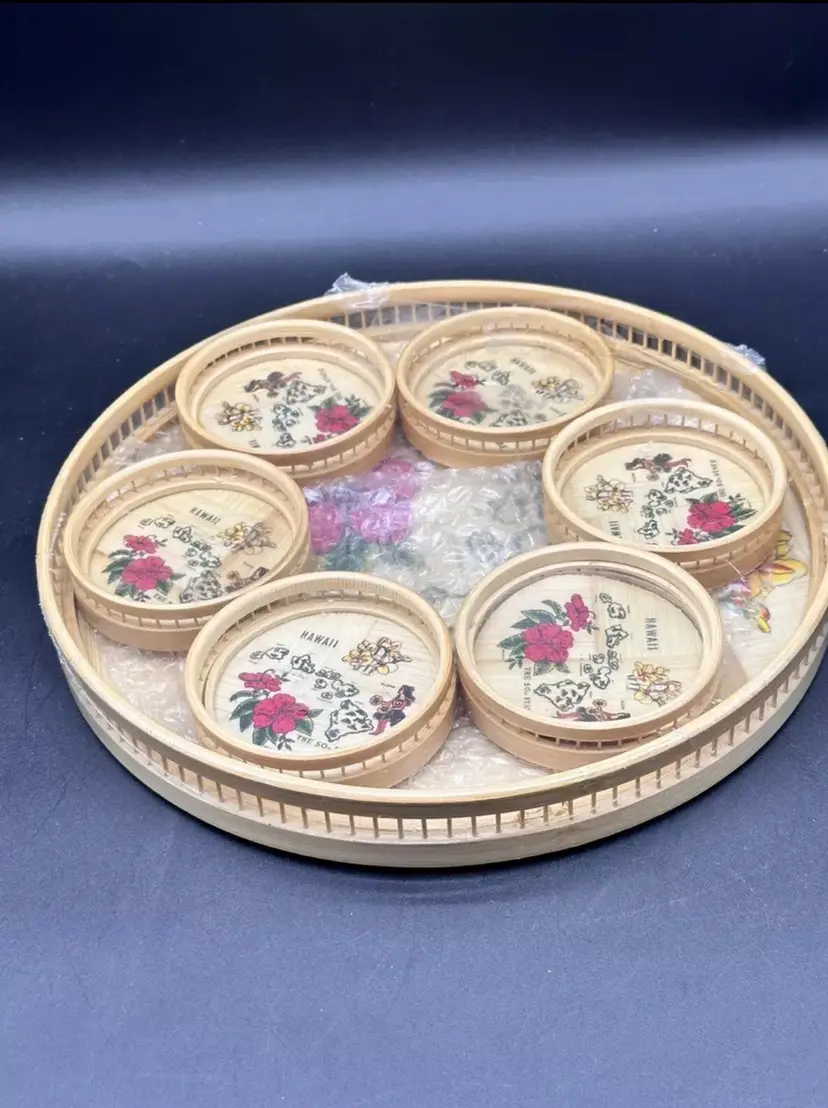 This listing is for a Bohemian woven Rattan vintage Barware set that include a a 11” tray and six 3.5” coasters.