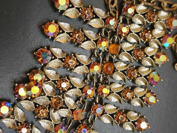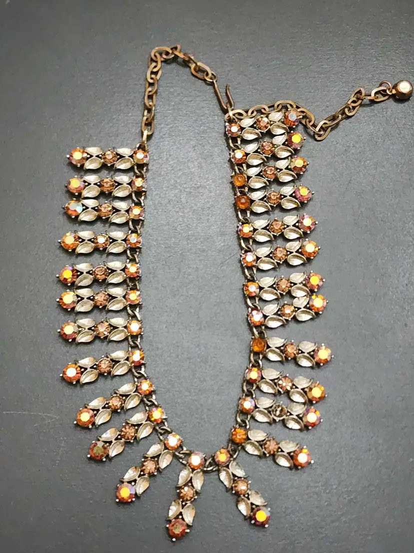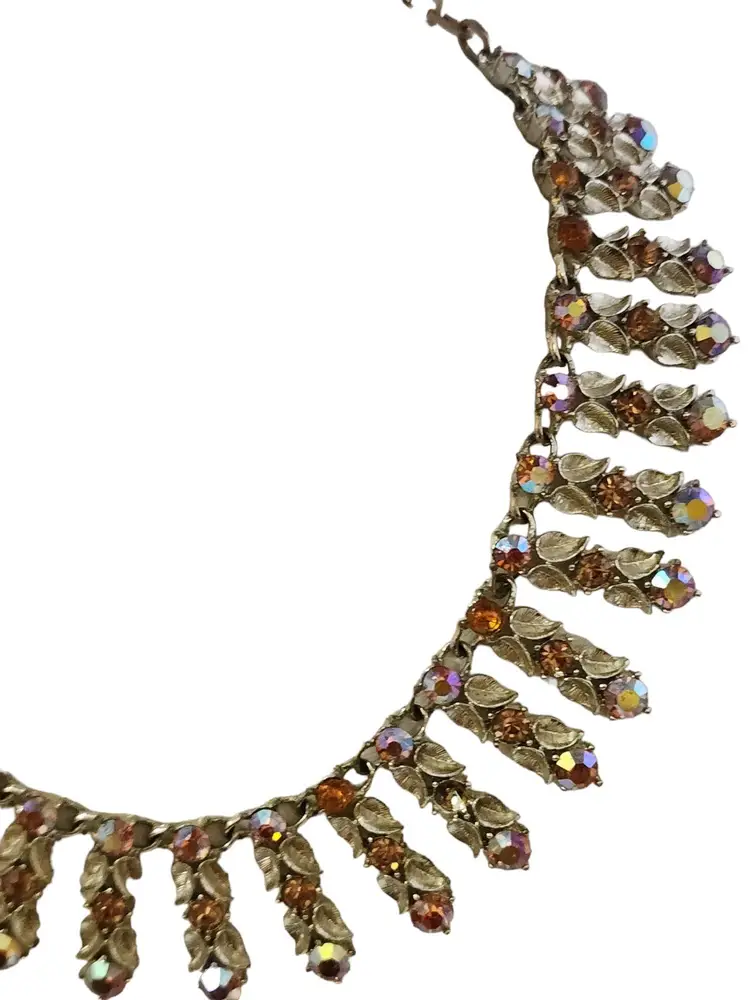Size: 16.5" Color: Gold metal and Ab orange rhinestones Condition: Very good vintage Signed: None Details: Well made.