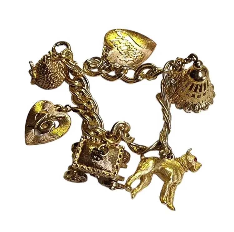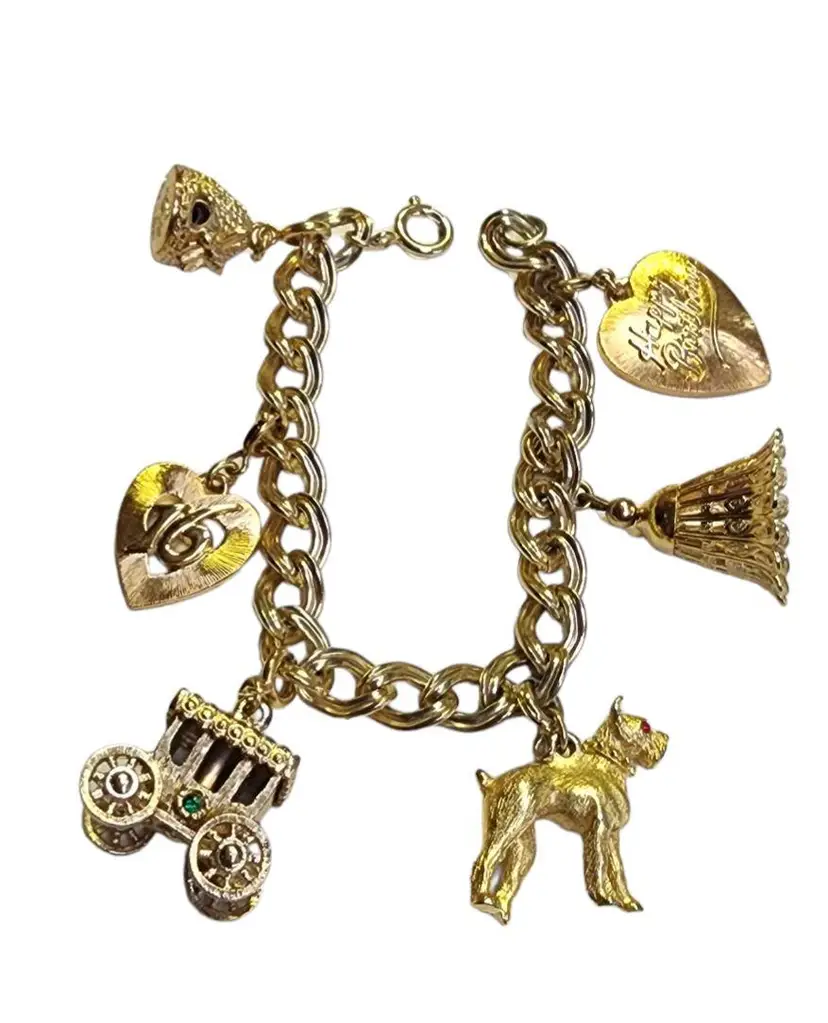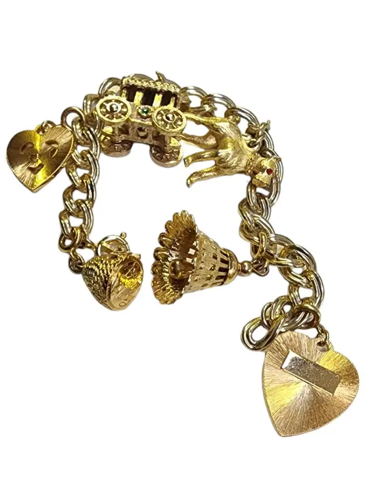 Size: 7" Color: Gold Condition: Very good vintage Signed: None Details: Cute detailed charms; wheels on carriage turns.