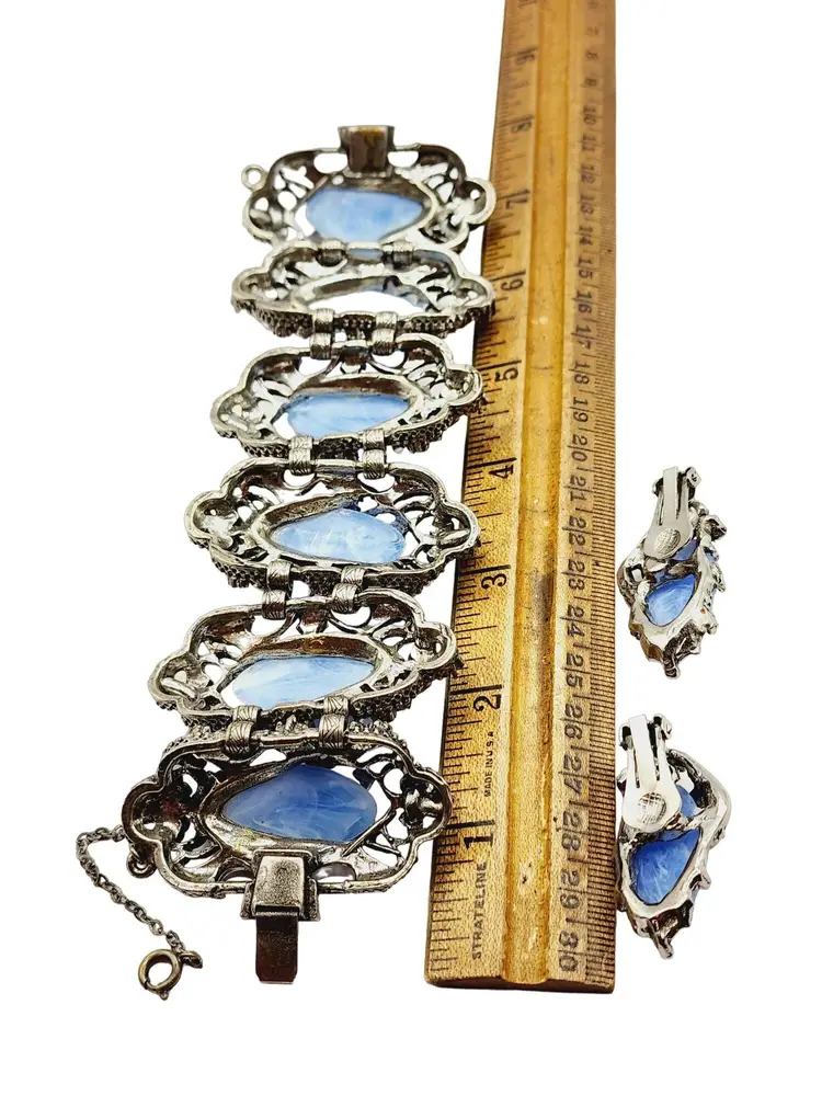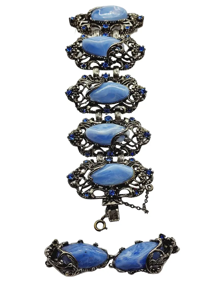 Color: blue, silver Condition: very good vintage Era: circa 1960s Signed: None Details: Made from silver-tone metal set with acrylic and rhinestones. Heavy casting, beautifully carved. bracelet is secured with a push-in clasp and has a safety chain. Similar to selro, but I believed this was made by Jewel Craft.