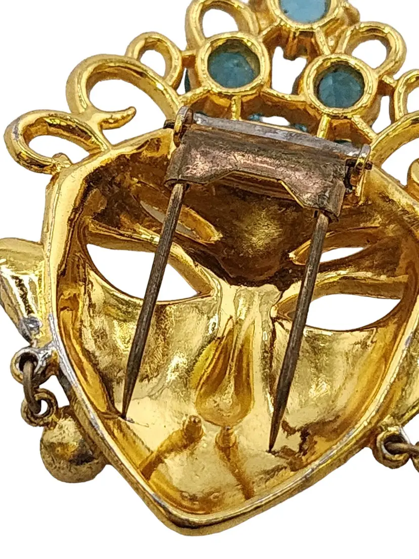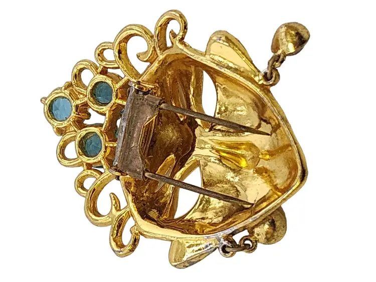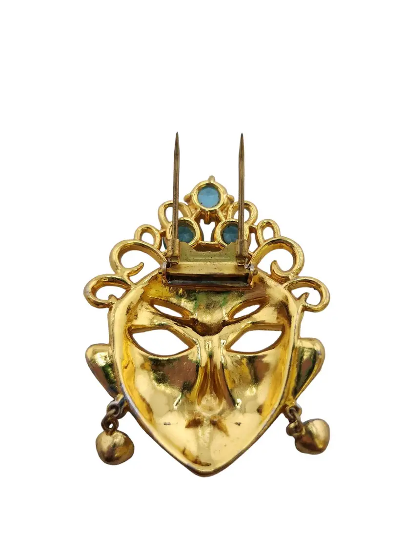 Size: 2.25" Color: Gold, Blue Condition: Very good vintage Signed: None Details: Possibly attributed to Mazer, but could not confirm. Plating is exceptional.
