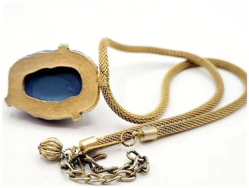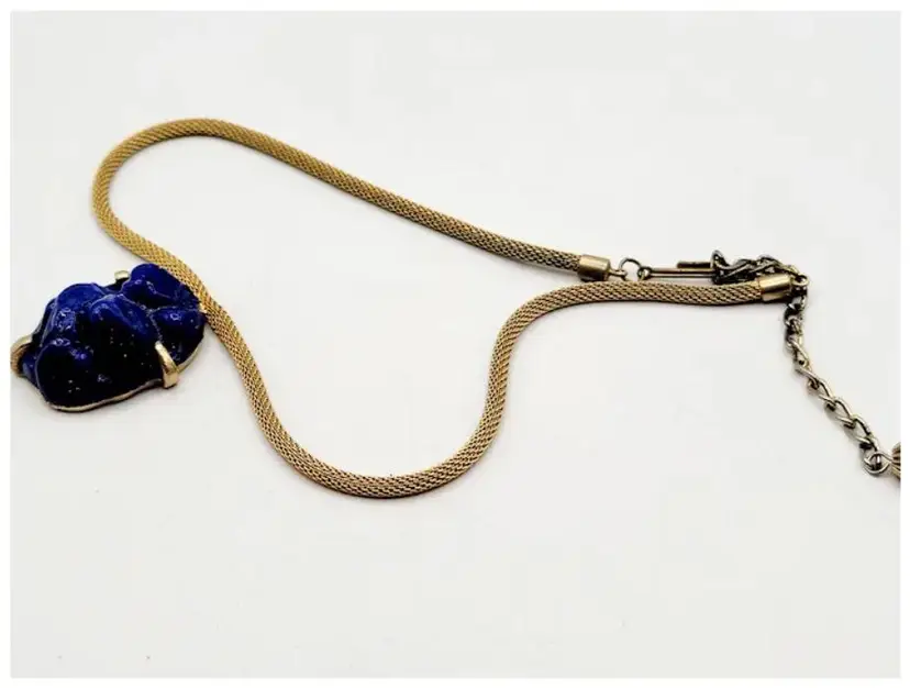 This is a beautiful and unique necklace. Glass is molded with a gold fleck and is unusually shaped, possibly Czech glass. The glass pendant is soldered to the mesh chain. The pendant is a little over 1"; 17 is the chain, including the extension chain.
