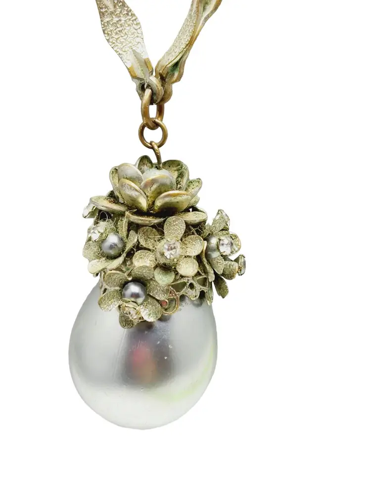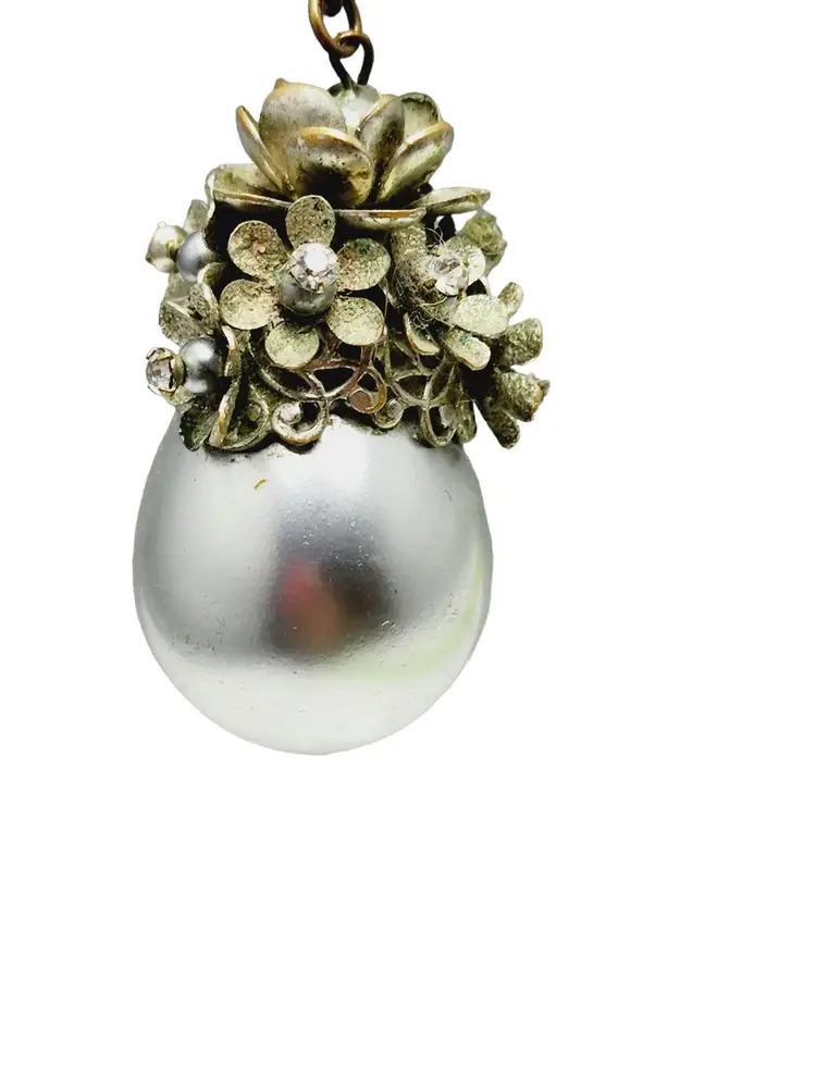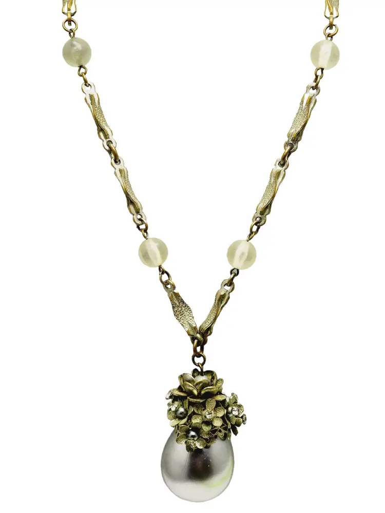 Gorgeous vintage necklace featuring an acrylic beads and link chain. Dangle gray pearl drop with flower and rhinestones accent. Secured with a really nice old clasp.