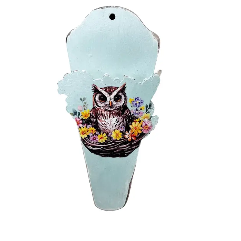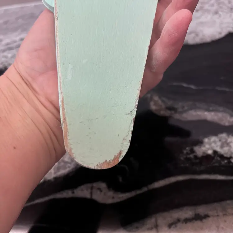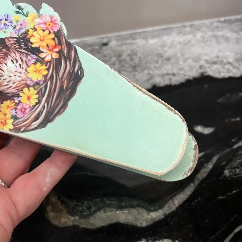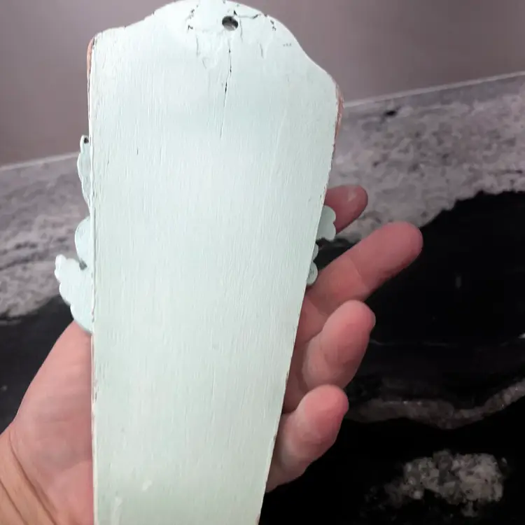 Up cycle by me hand painted and sealed I also added the transfer and sanded it. It is wood approximately 8 inches tall.