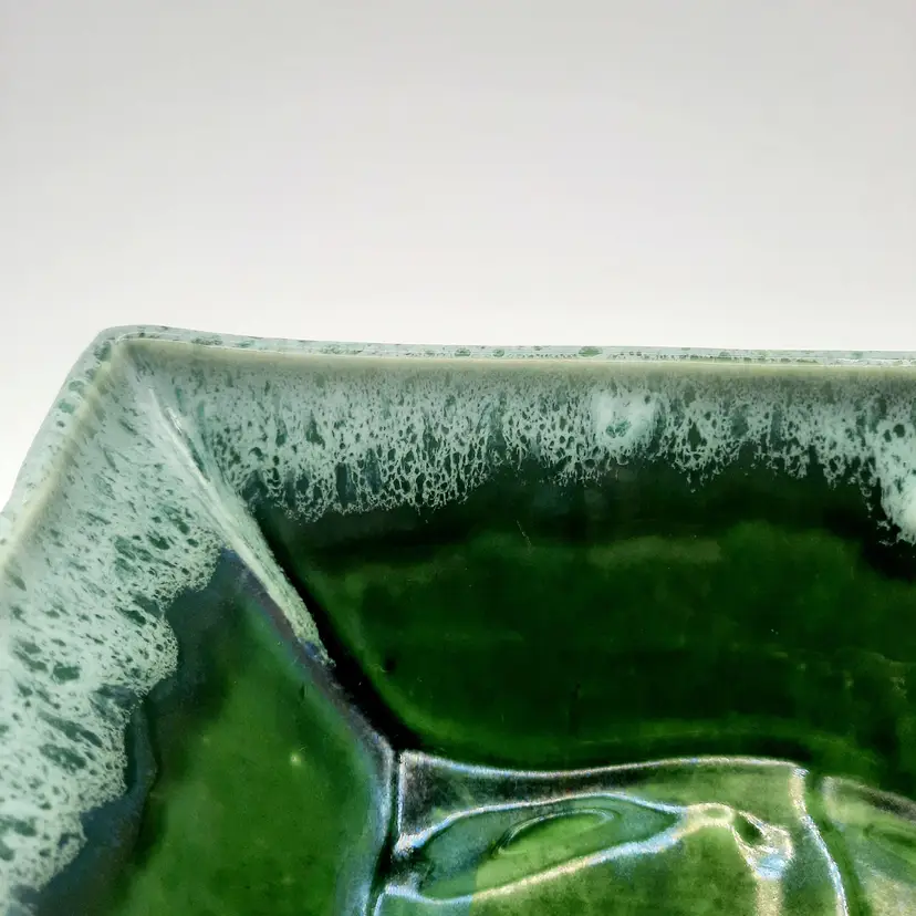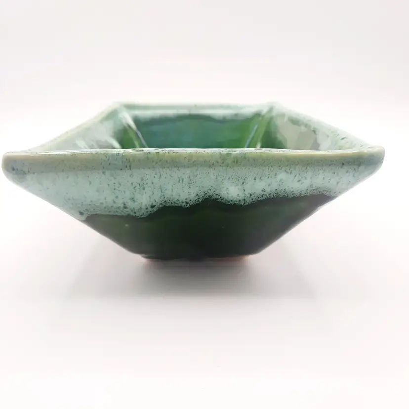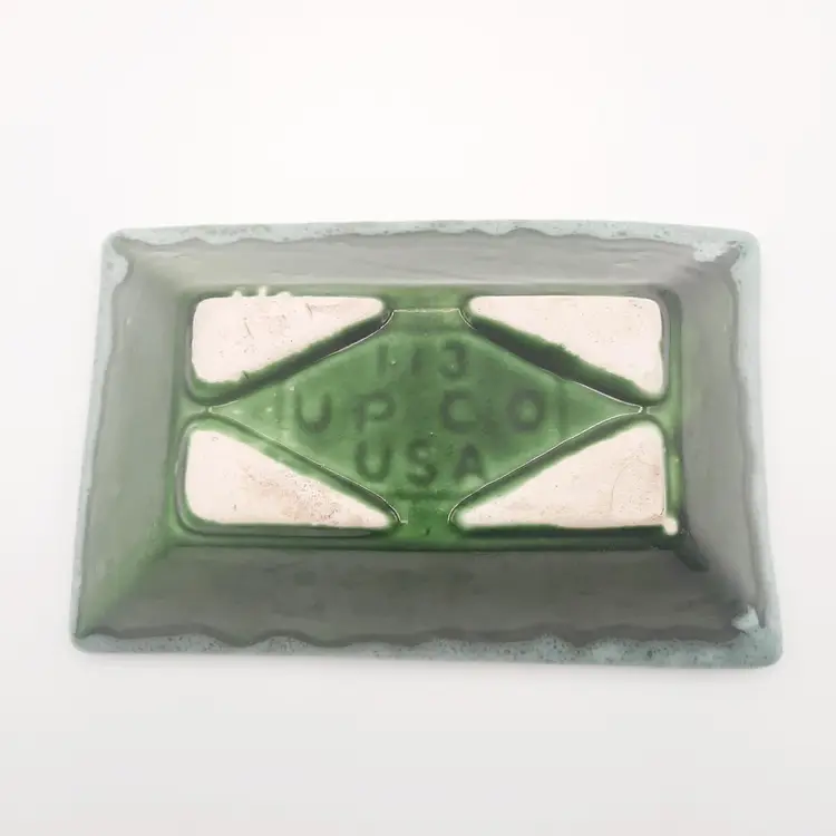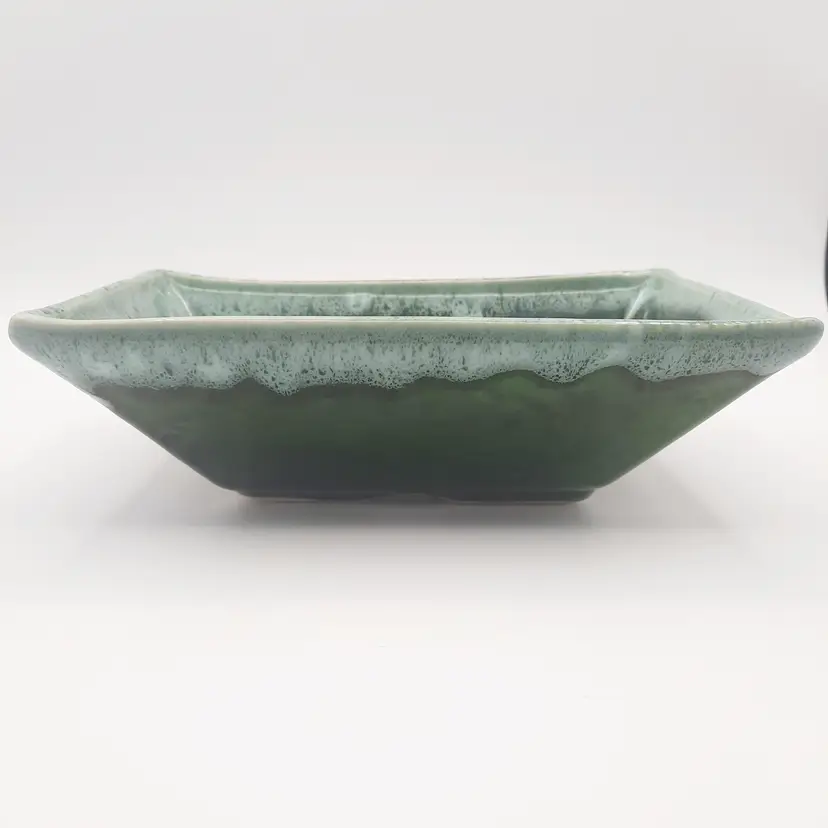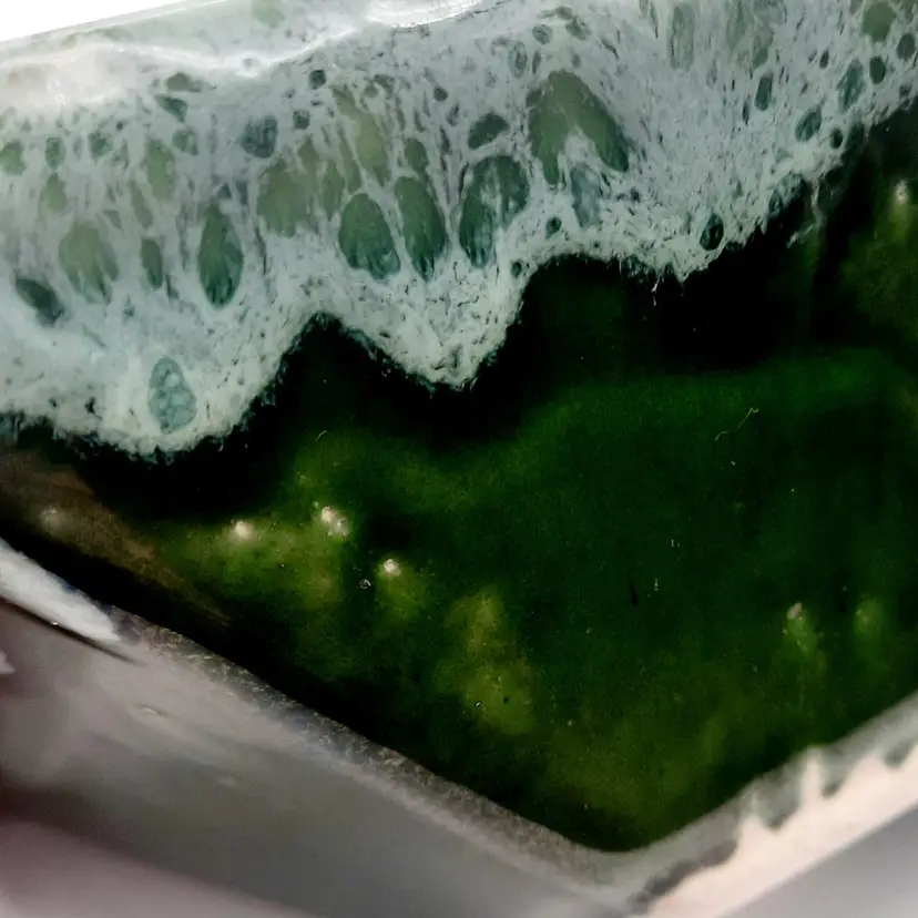 Very neat planter with the 2 tone drip glaze is 8"L x 5"W x 2 1/2"H, does have some wear and oxidation, light spots in glaze look to be from mfg process.