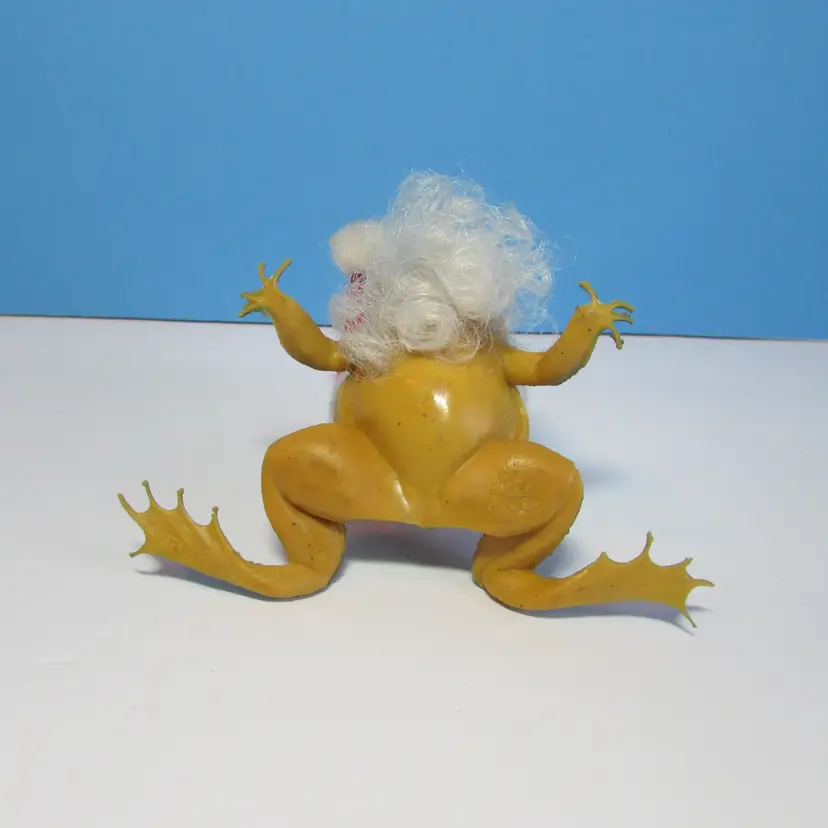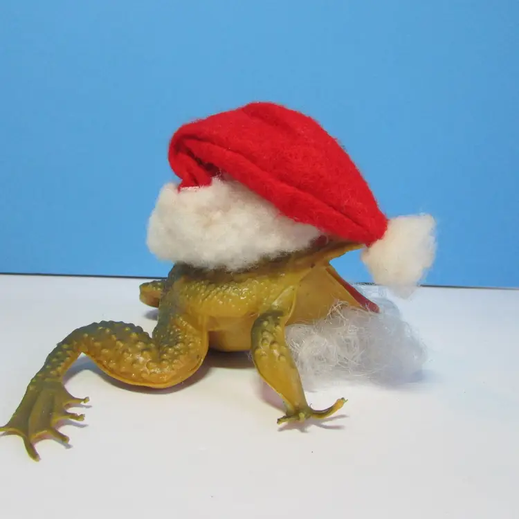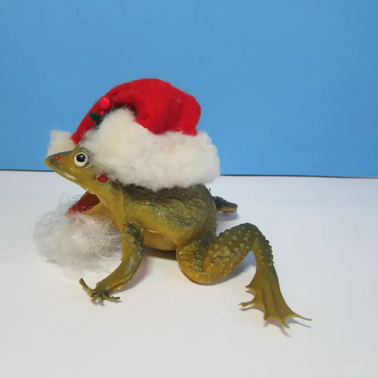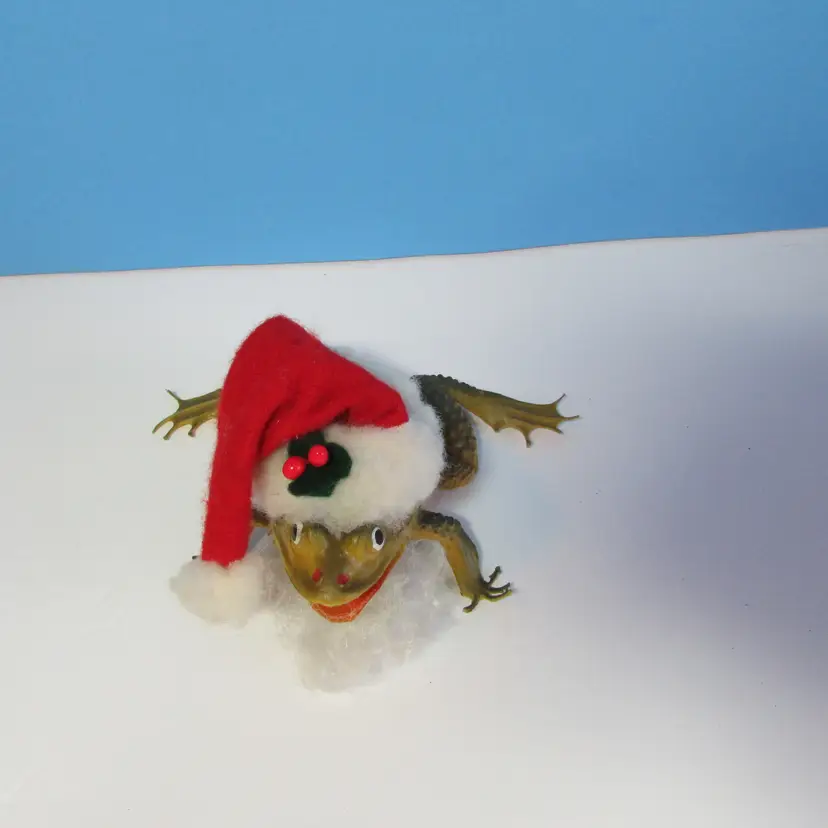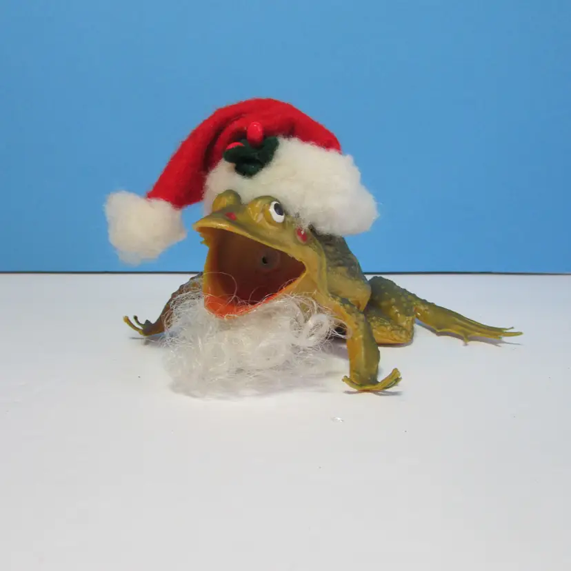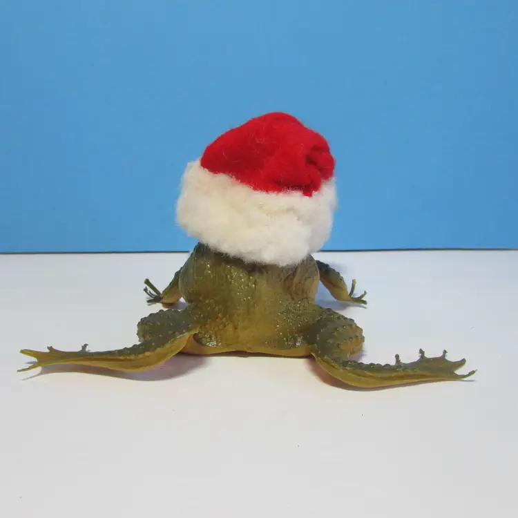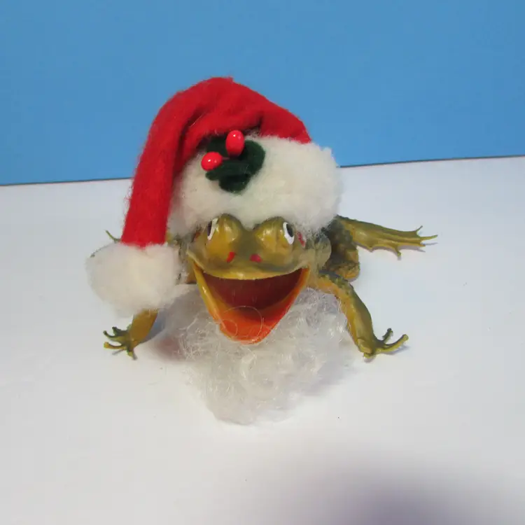 This squeaker frog no longer squeaks, mom made him into a Santa frog. He is about 4" x 6" x 4 1/2. This is shipped from a smoke free home. Thanks for looking!