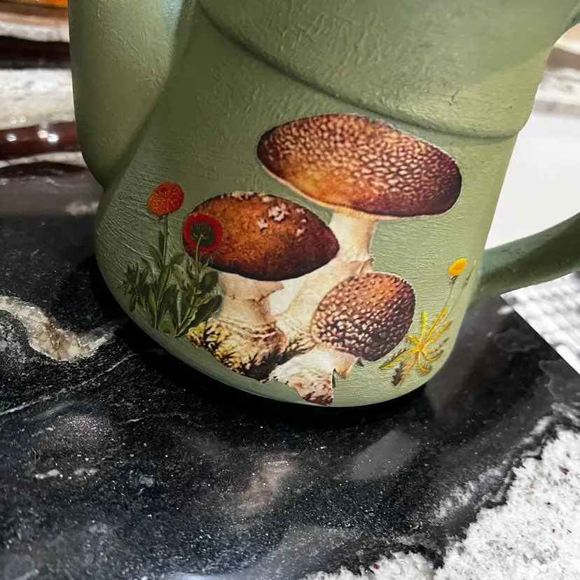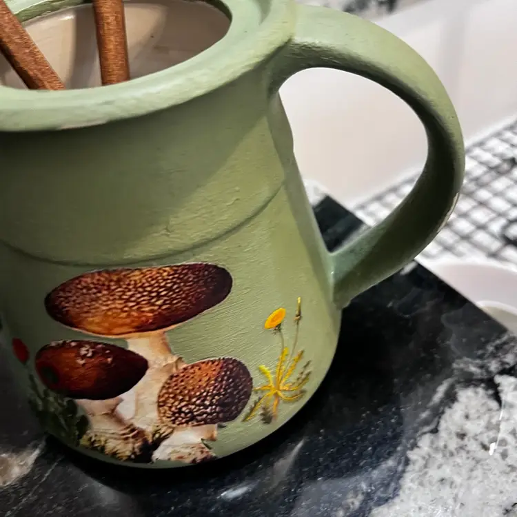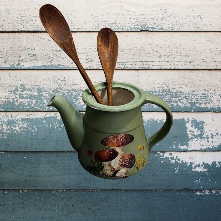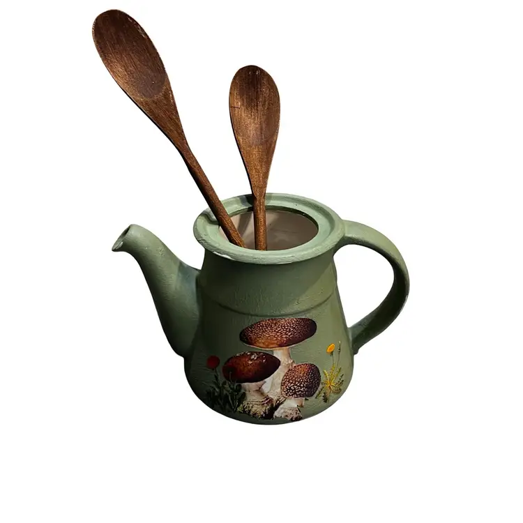 009 Vintage Upcycled Mushroom Teapot Wooden Spoon Holder Ceramic Green MCM Hand painted by me. Transfered/distressed/waxed sealed Approx 6”