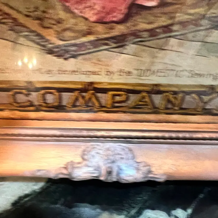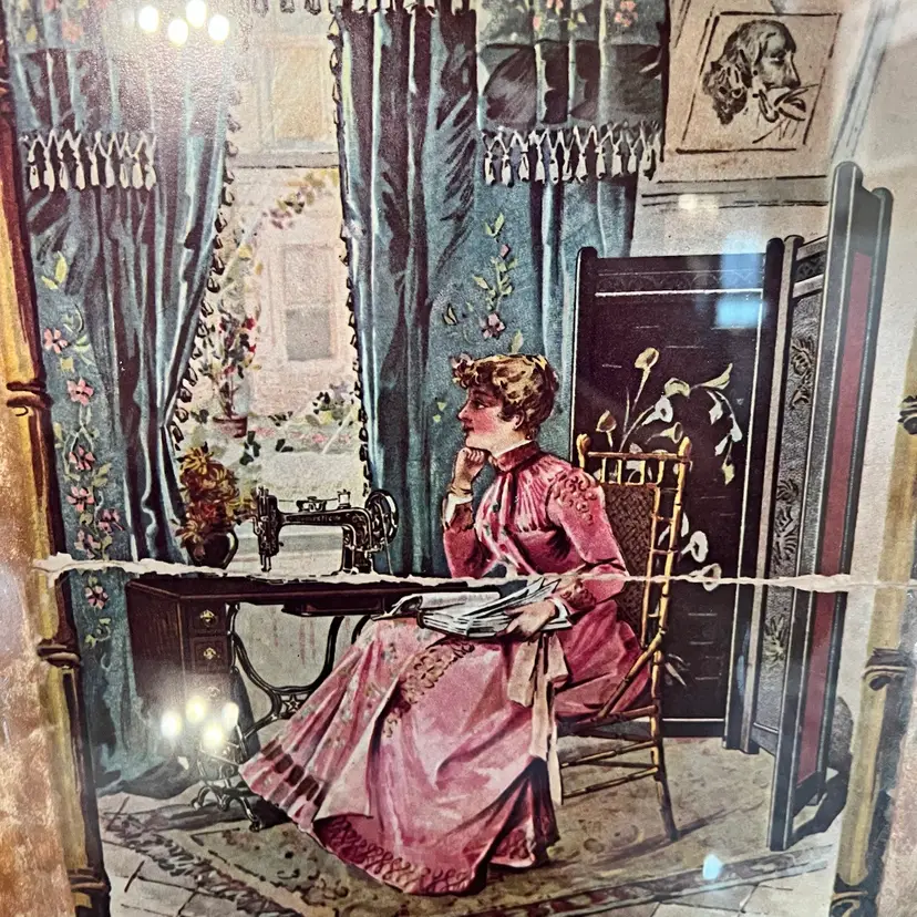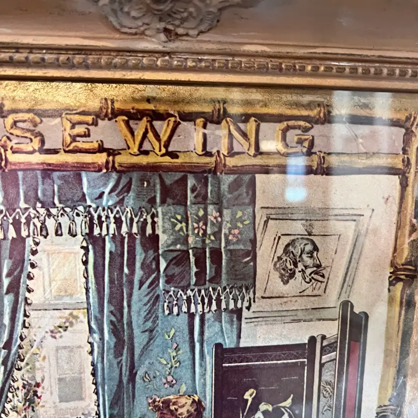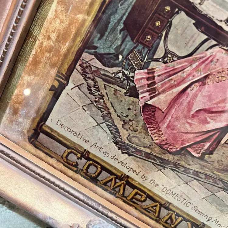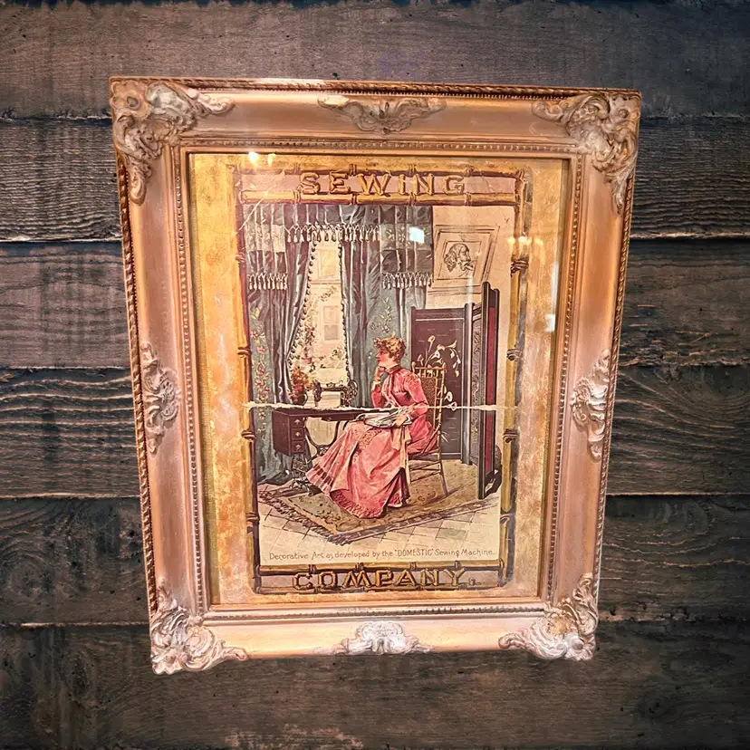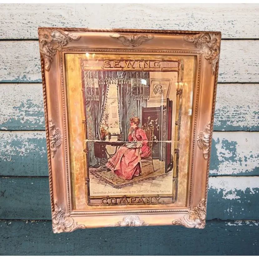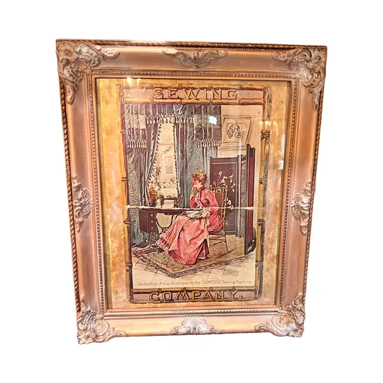 This is a framed lithograph from 1973 by Hickory Plaque Inc., advertising "DOMESTIC" Sewing Machines. Additional information: It depicts a woman sewing, showcasing the machine's use in a domestic setting. "Domestic" sewing machines are designed for home use and a variety of projects. The artwork emphasizes the machine's role in "Decorative Art." The print is framed in an ornate, vintage-style frame. It likely served as promotional material or a decorative piece for sewing enthusiasts.