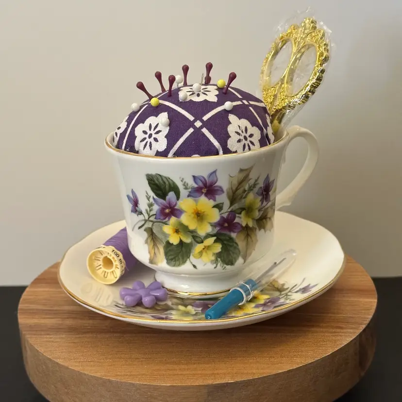 This is a vintage upcycled pincushion teacup