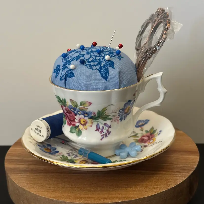 This is a vintage upcycled pincushion teacup