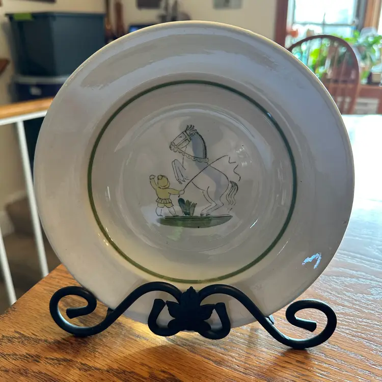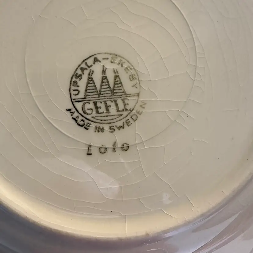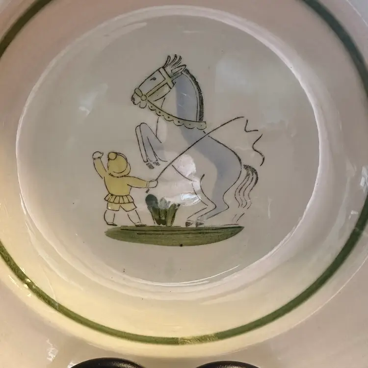 Vintage Upsala Ekeby Gefle children's bowl from the "Toto" series. Made by the Gefle Porcelain Factory, part of Upsala Ekeby in Sweden. Research indicates the set was designed by Arthur Percy, who worked for the company from 1923 to 1960. Some crazing, no chips. Measures 8" in diameter x 1 1/4" tall.