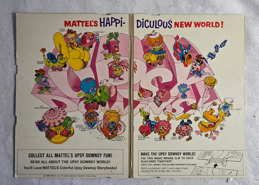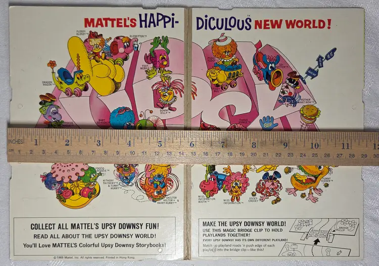 This vintage Upsy Downsy playboard, made by Mattel in 1969 in Hong Kong, features the character Mother What Now Go Getter. It is a part of the Upsy Downsy toy line and is a collectible piece for fans of vintage toys.