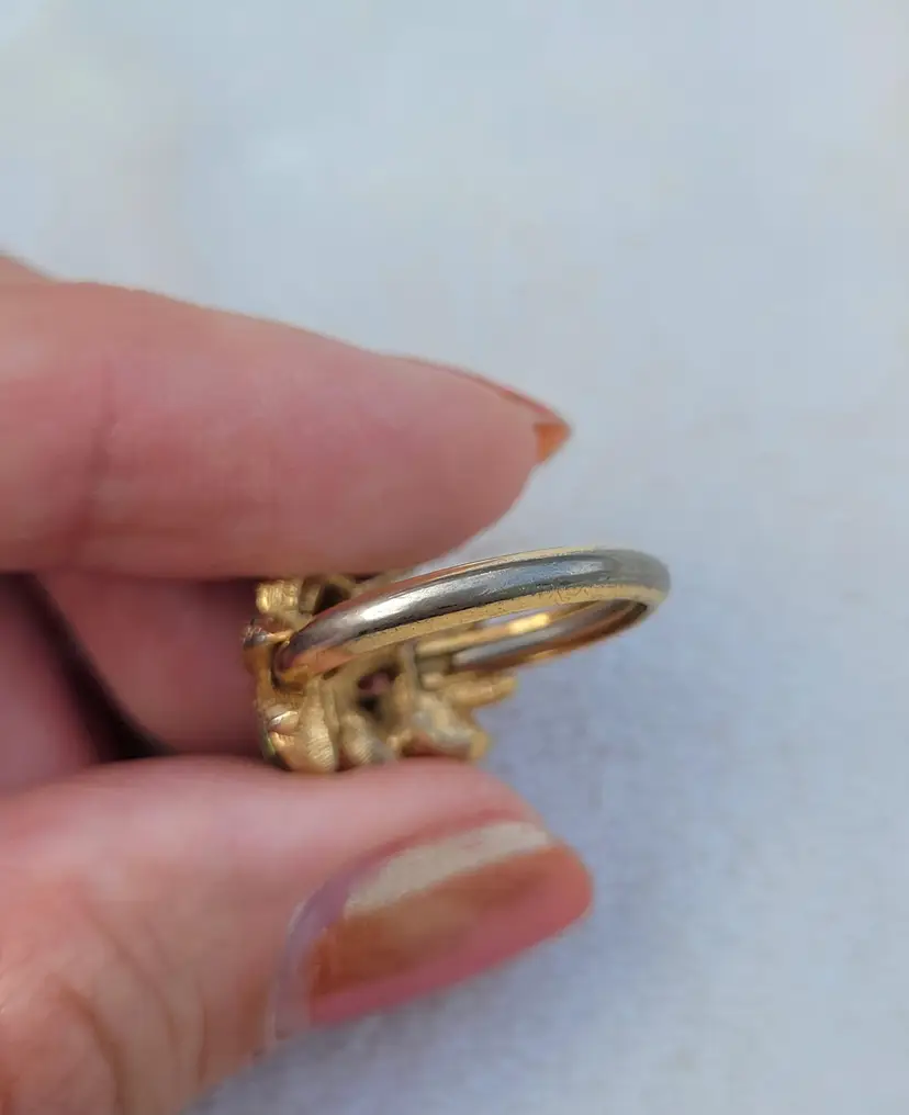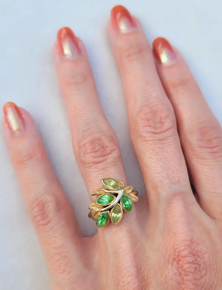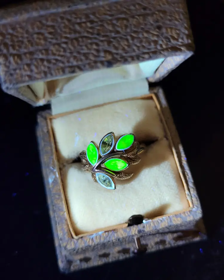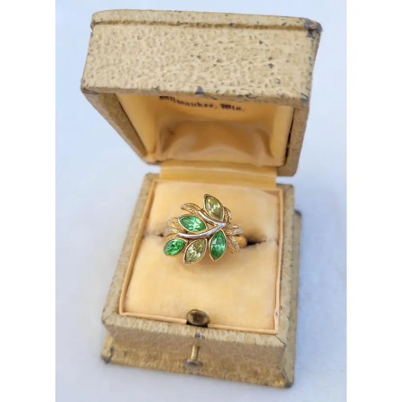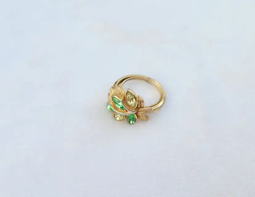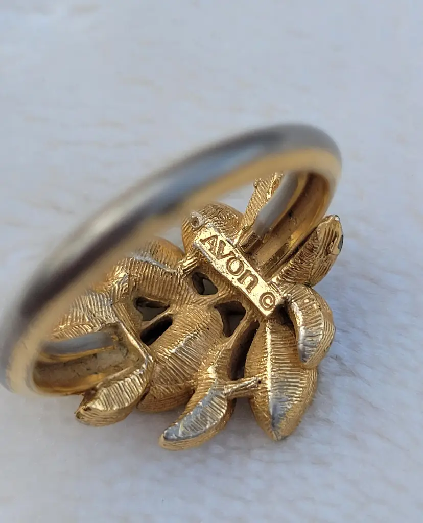 Fab ur&nium glass botanical ring by Avon! This is from an estate and circa 1970s. It has a little sizer on the inside of the band that allows it to adjust between sizes 4.5 & 5.5. It's in good condition but does have quite a bit of wear on the gold plating of the band, please see pictures for details. Does not include my ring box.