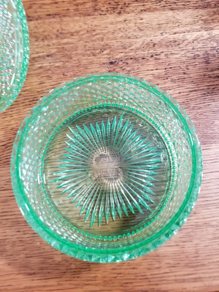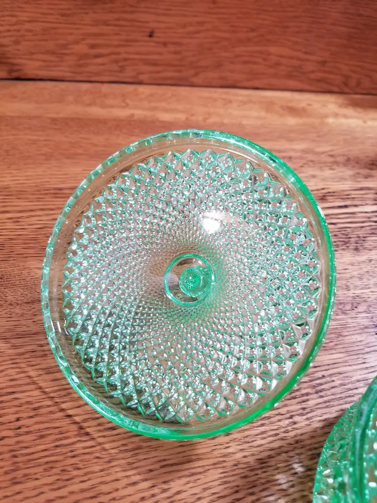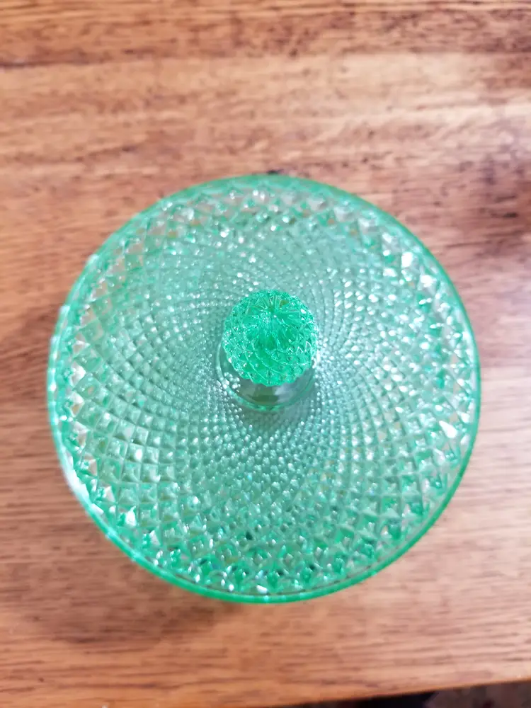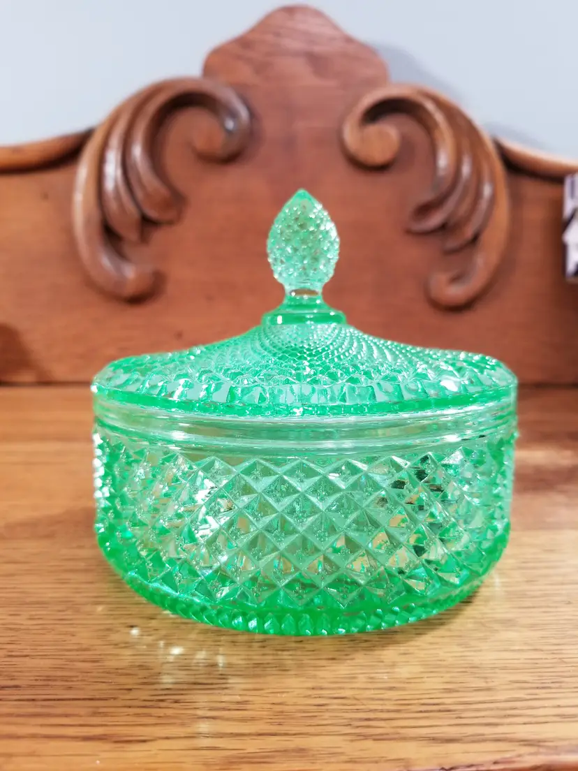 Beautiful vintage uranium glass powder jar in a vibrant translucent green, dating to the late 1920sโ1930s. This elegant vanity piece features a sharp radiating starburst base, diamond-paneled sides, and a domed mushroom-style lid knob, typical of high-quality Depression-era vanity glass.