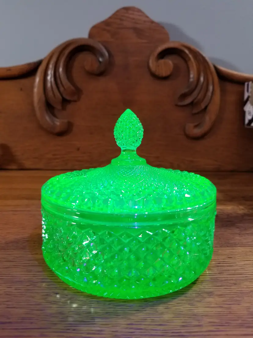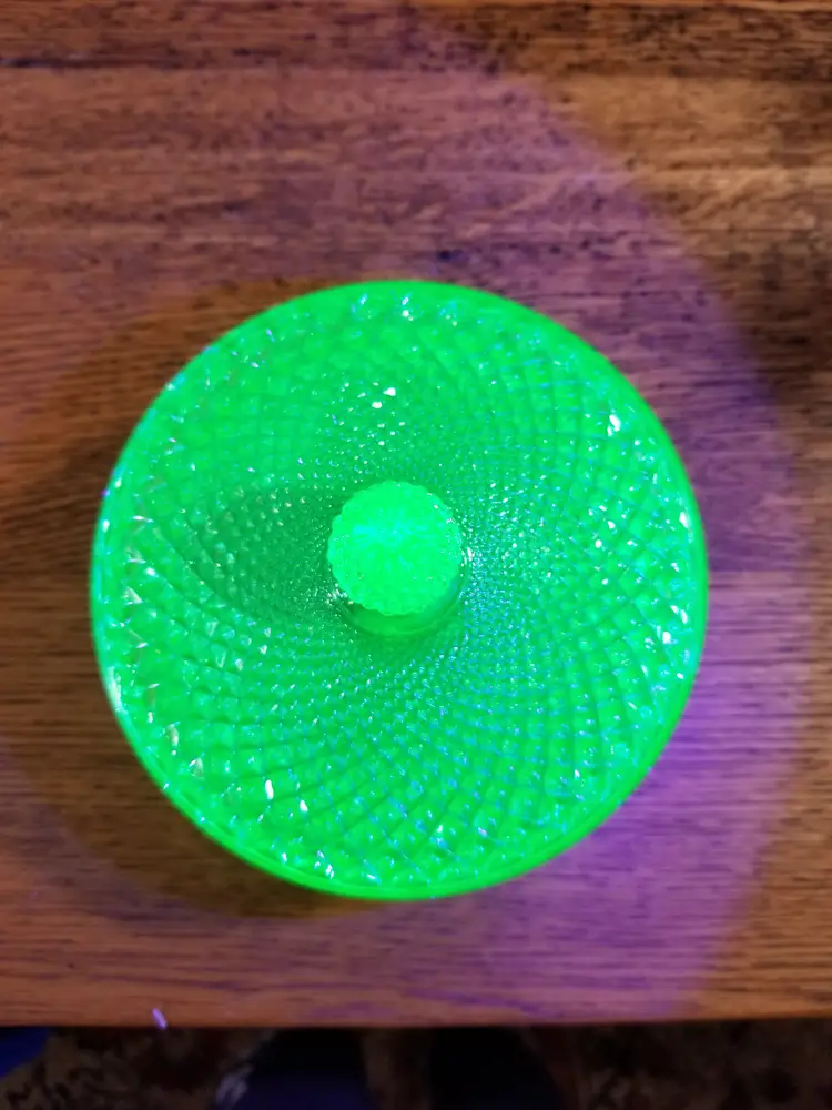 Details Type: Powder / Vanity Jar Material: Uranium (Vaseline) Glass Color: Green Era: c. 1930s Markings: Unmarked UV Reaction: Strong glow under black light