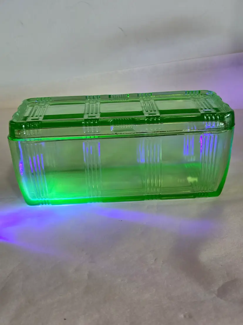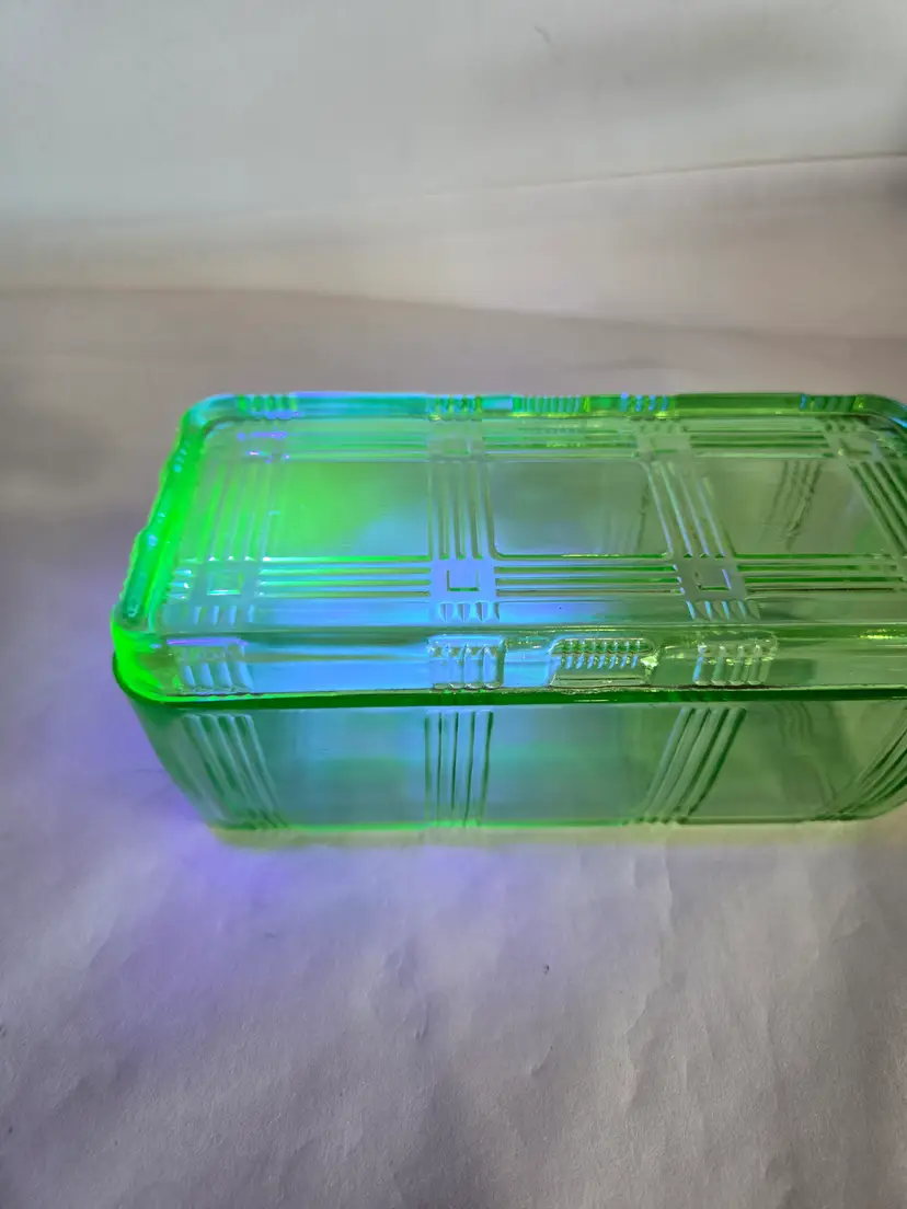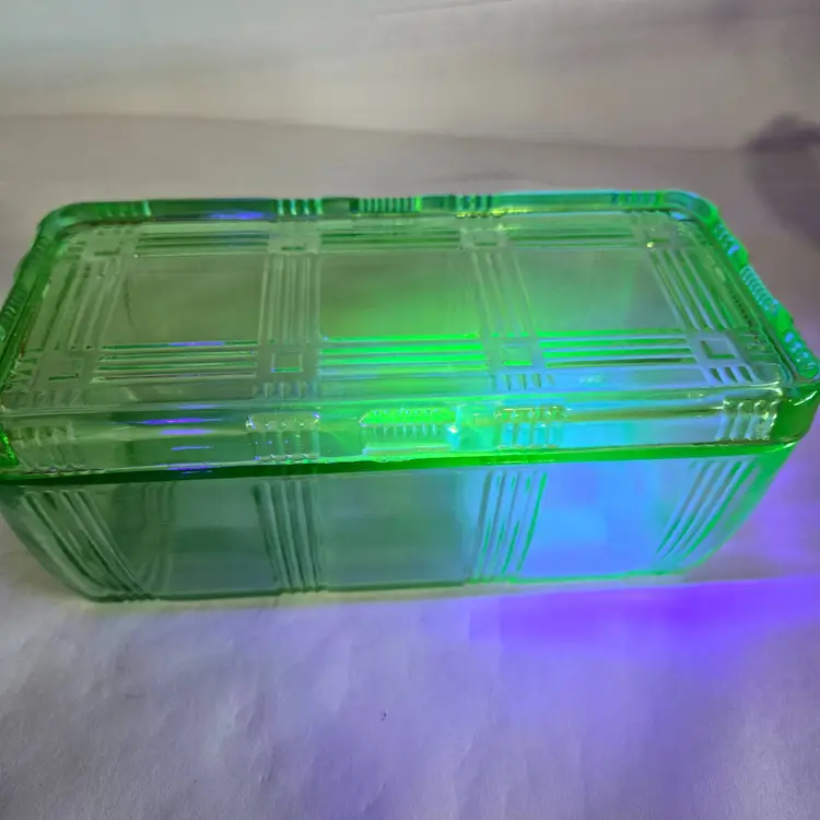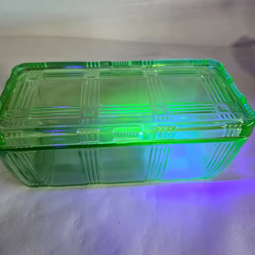 Vintage uranium hazel atlas criss cross refrigerator dish that glows vibrantly under a blacklight. This is a large, heavy dish that would look great in any collection. This has normal wear, refer to pictures for a closer look. This is a statement piece for a gift or add to your personal collection.